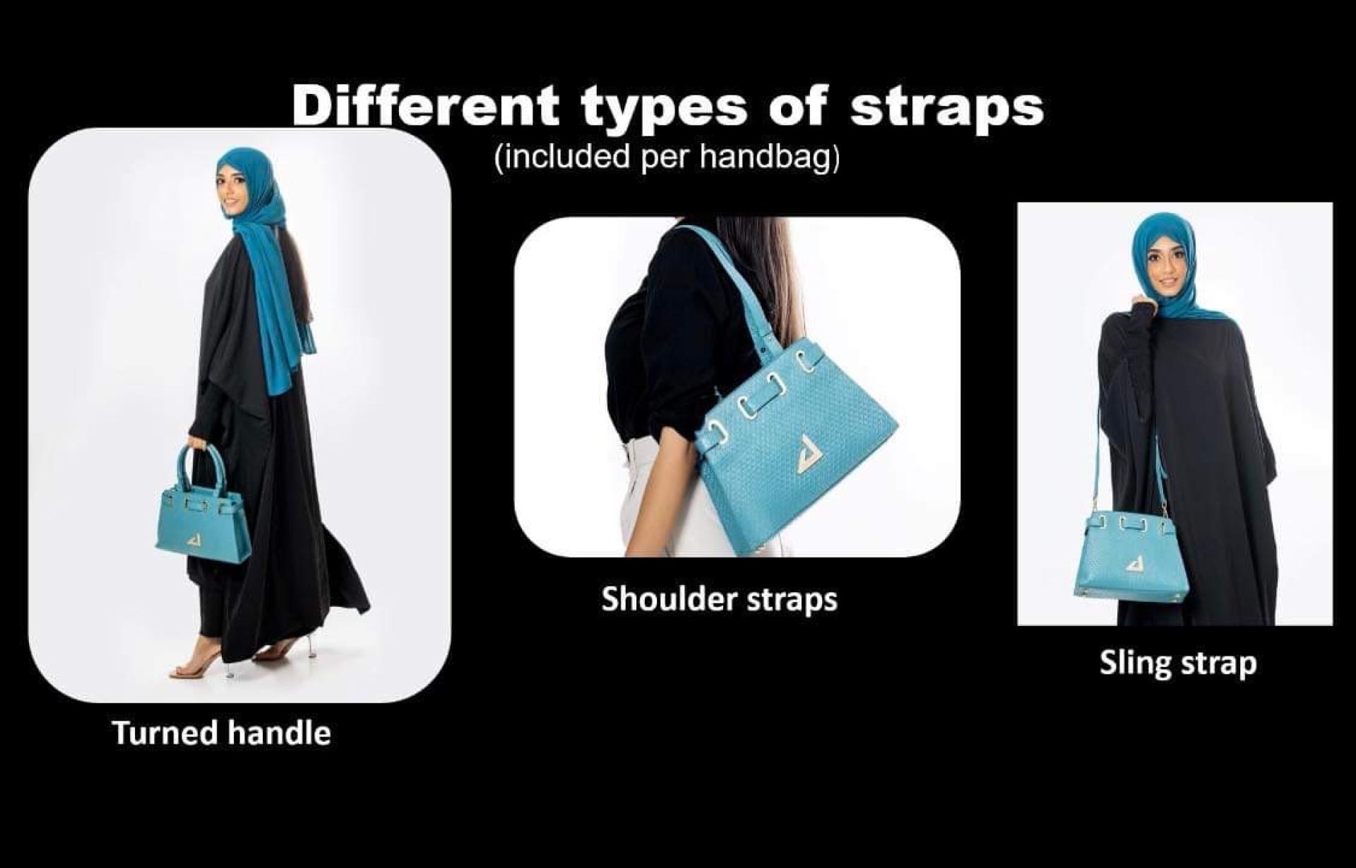 We are proud to say that the first ever handbag with this innovative design is from Jareani. It has three different removable straps or handles and a removable bag loop around the top part of the bag. This bag loop can be replaced with a thin twilly or other materials and or colors to mix and match with the bag straps. The three straps are namely: a pair of rolled handles, a pair of adjustable shoulder straps, and an adjustable sling or crossbody strap.
