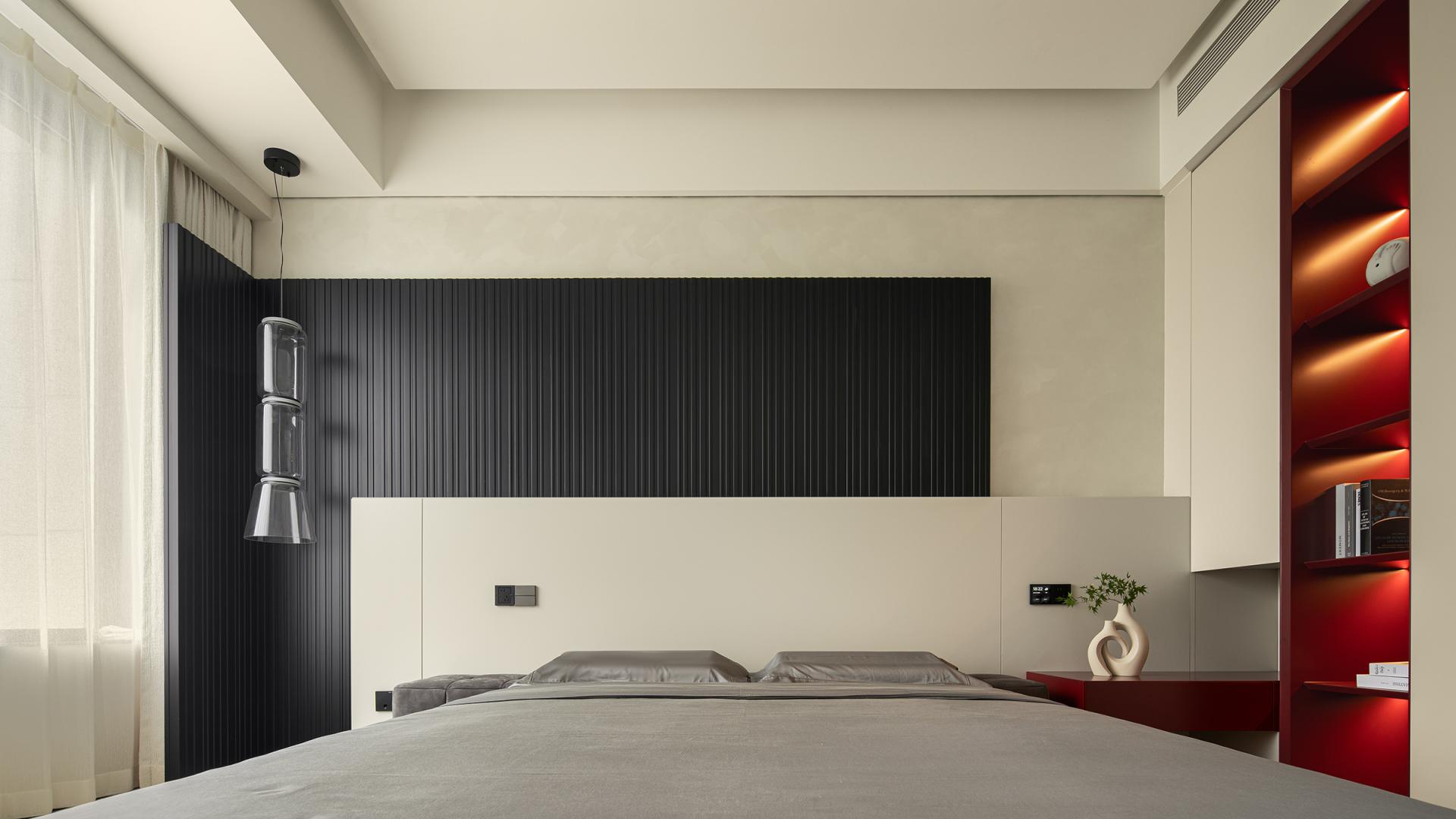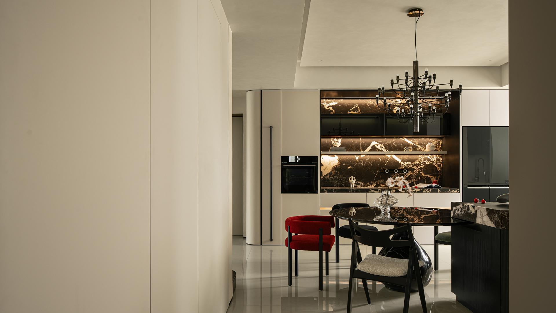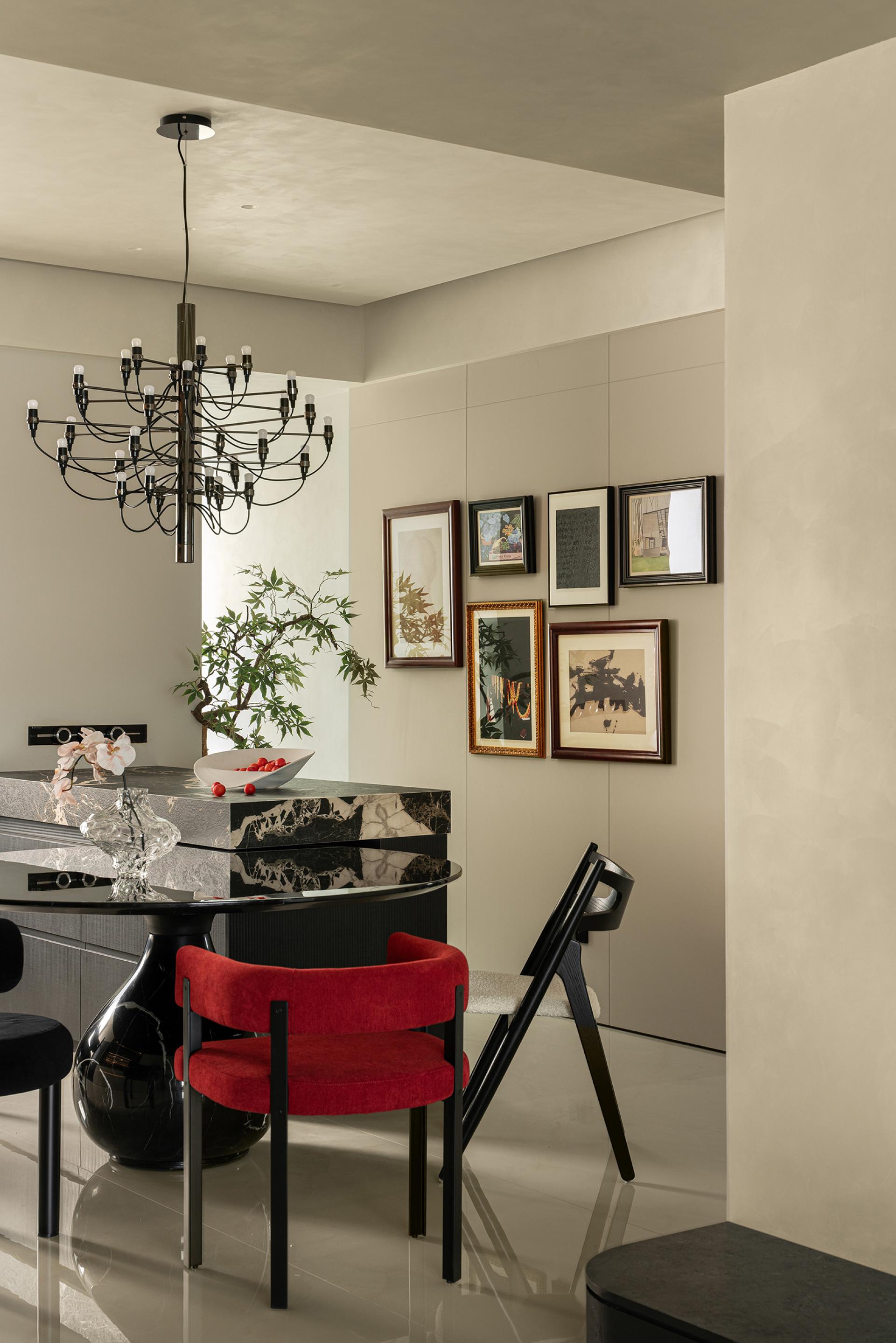 De-emphasizing the living room doesn’t mean eliminating it entirely; rather, it involves breaking away from the traditional layout of “sofa + coffee table + TV” to unlock more possibilities for the space. This approach better aligns with the client’s preferences, habits, and family interactions. For instance, if the client enjoys tea, the tea table should be placed in the prime viewing spot. If daily TV watching isn’t a priority, there’s no need to display a television or design a TV wall. By examining the space from the homeowner’s perspective, the design can focus solely on meeting their needs without trying to please others. It embodies a bold sense of autonomy, as in, “This is my house, and I’m in charge.” The dining area is particularly reflective of the client’s personal aesthetics and preferences, characterized by its colorful and organic nature. For the kitchen and dining space, a Bvlgari Black color scheme was chosen, with a rectangular island counter paired with a round dining table. This interplay of shapes creates a more harmonious and sophisticated atmosphere, where every meal throughout the seasons is treated with care. The female client takes great pleasure in crafting delicate pastries in this space and sharing them with family and friends. The space is accentuated with artistic chandeliers and wall art, evoking a sense of openness and vitality. Dead spaces in the original architecture were transformed into indoor landscaping elements, adding depth and layers to the overall design. The master suite embodies the ultimate in minimalism, with black as the dominant color. The aesthetic blend of old and new creates a sustainable, natural modernity. This comfortable and relaxing space offers the client a sense of complete envelopment and security. Considering the width of the hallway in the space, we opted not to place a separate lounge chair. Instead, we designed a bed that includes a lying area. This allows the client to have a dedicated spot to recline, apart from the bed itself.