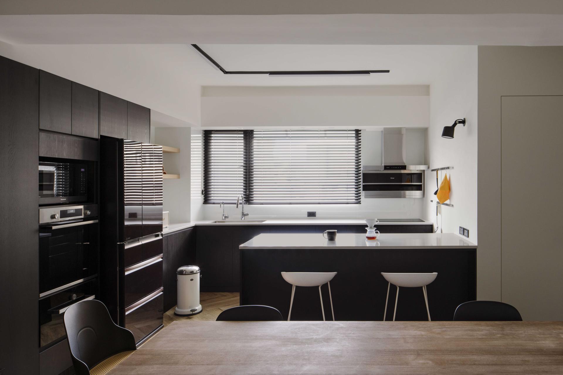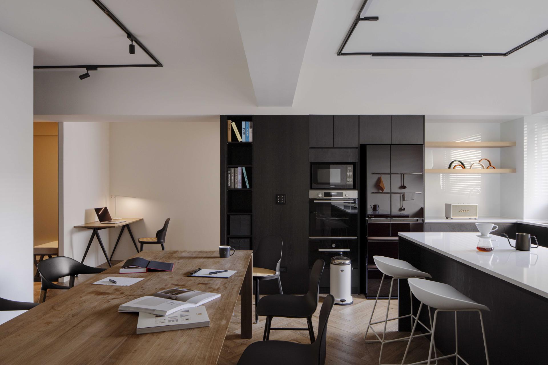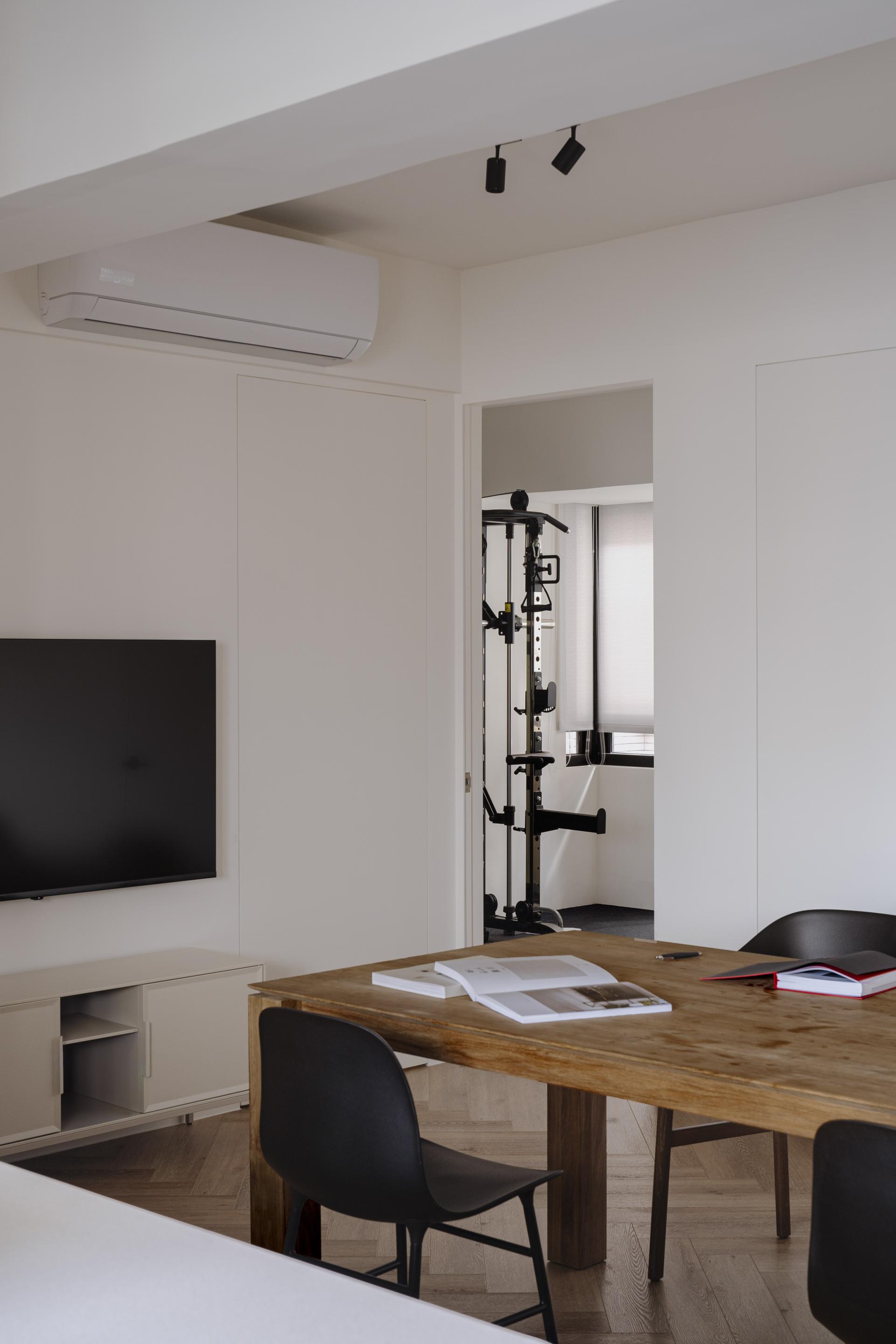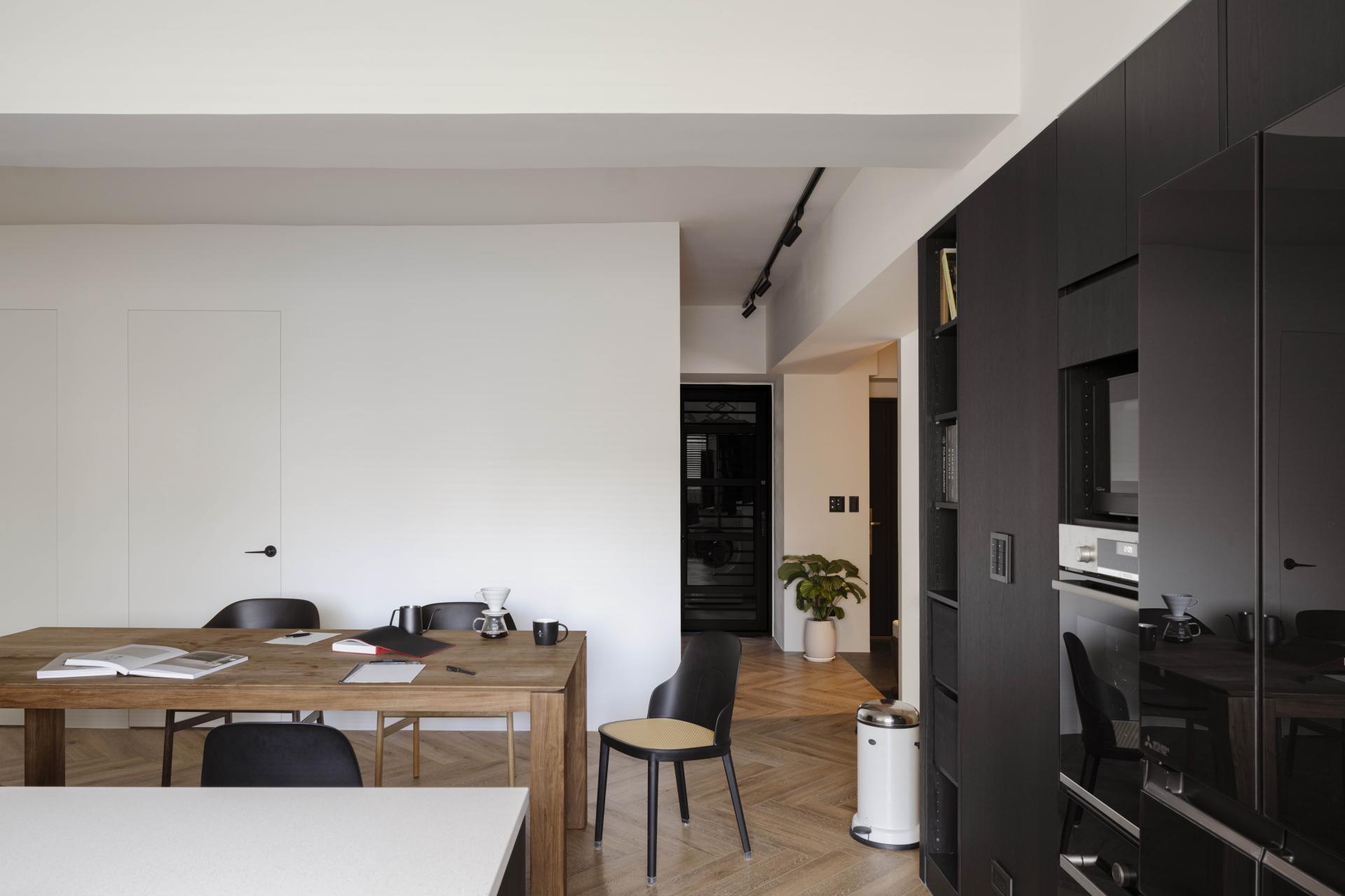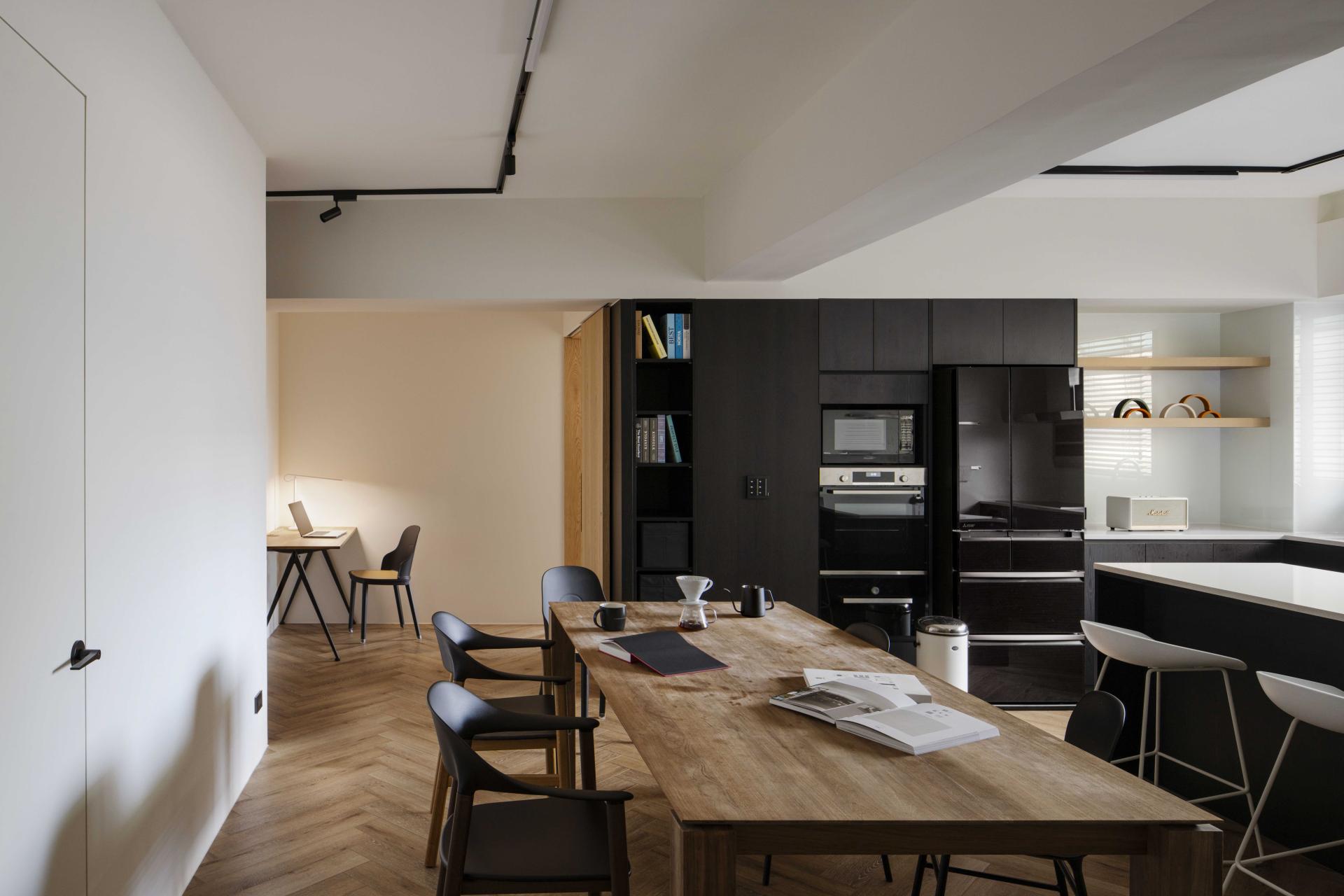 Traditionally, the living room revolves around a sofa. However, this design challenges that convention by eliminating excessive decoration and placing a long dining table at the center, complemented by an open kitchen to create a minimalist yet interactive living space.