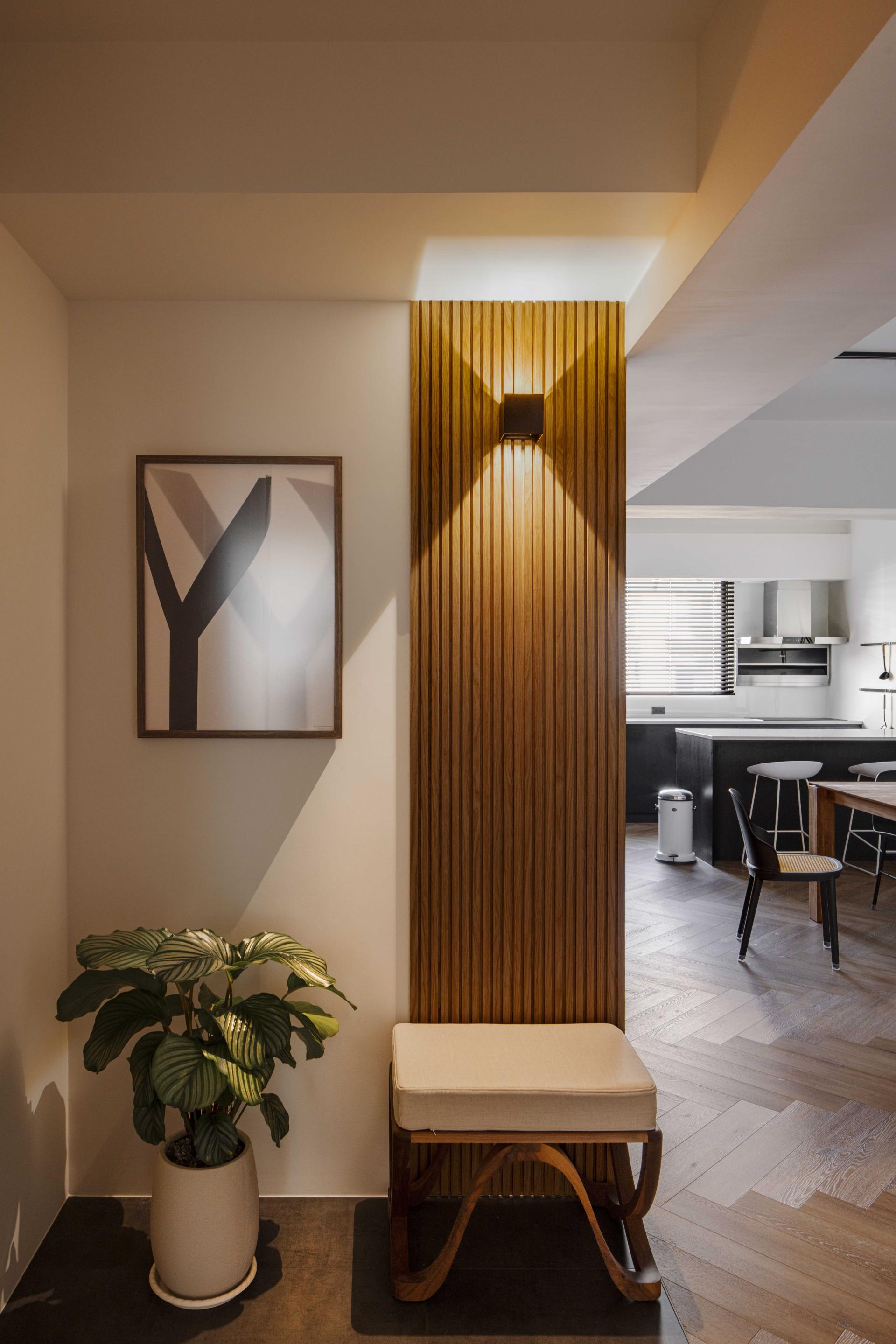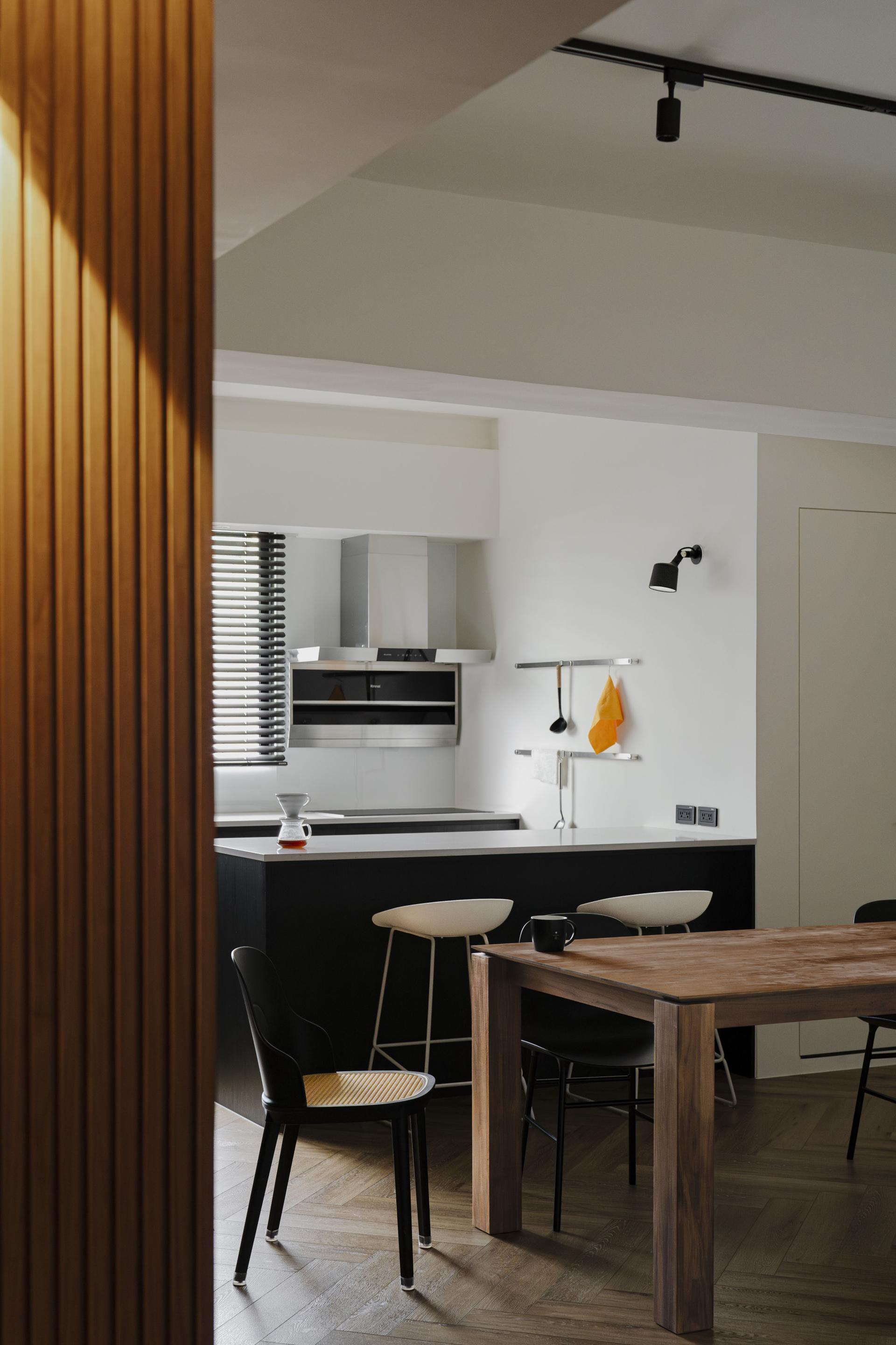 By maximizing the rectangular layout, the long table becomes the heart of family interactions, seamlessly connecting to the open kitchen. This arrangement allows for a fluid transition between dining, cooking, and relaxation. Instead of elaborate decorations, the design relies on carefully selected materials and dynamic lighting to craft a space that is both simple and layered.