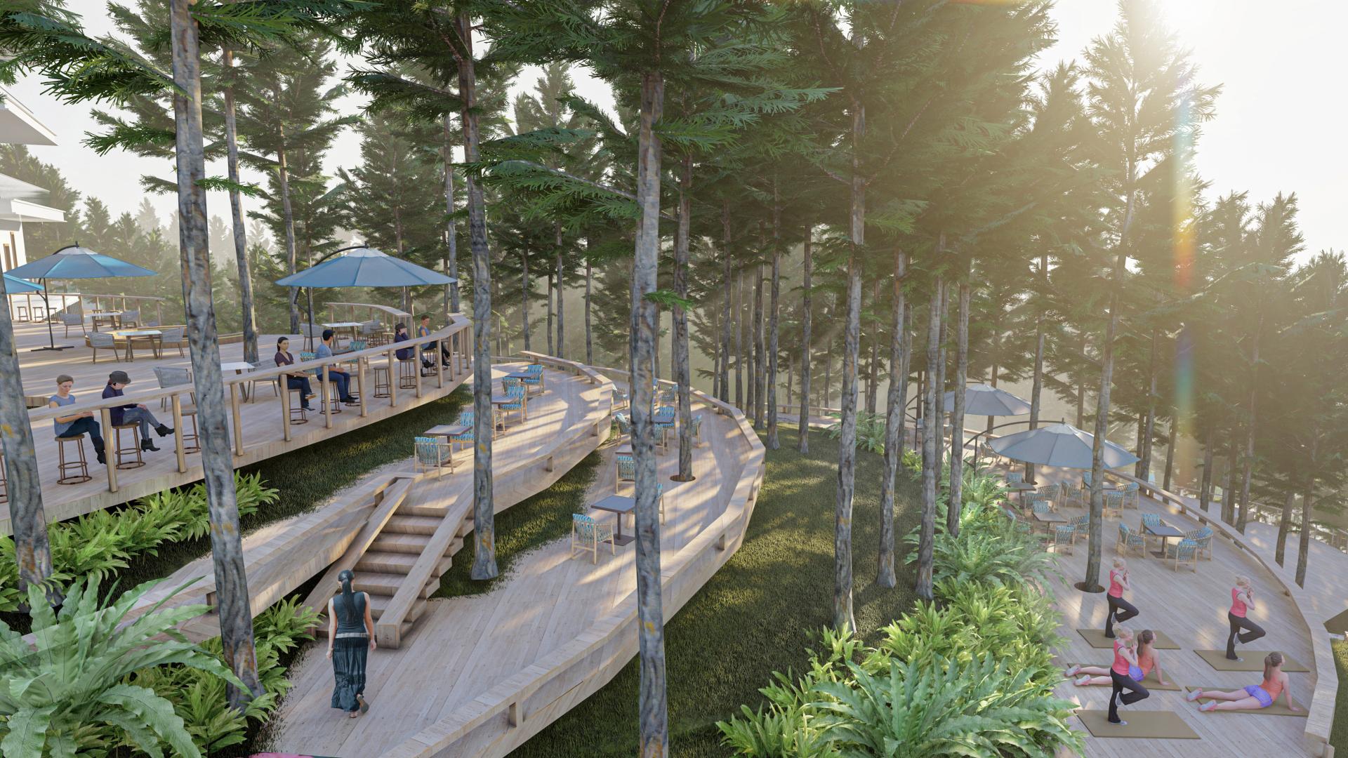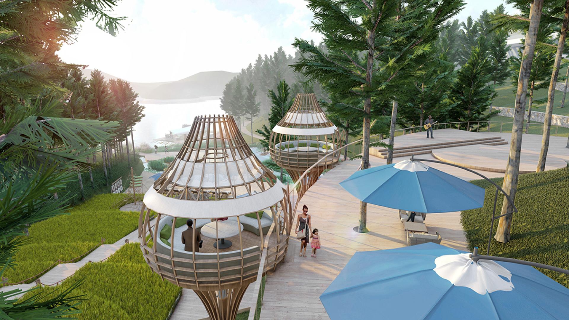 The site planning maximizes lake views while skillfully addressing elevation changes. Spacious outdoor dining and relaxation areas are integrated into the main restaurant and bar platforms, surrounded by plants to create a pleasant dining environment with the lake and mountains as a natural backdrop. The lakeside trail and grassy terraces connect the lakefront vistas with the mountain landscape, creating a fluid connection with the natural surroundings. The pine forest restaurant platform leverages natural elevation differences, using native wood and tree canopy cover to create a welcoming, open dining and leisure atmosphere. The specially designed artificial wetland system not only supports water sports activities but also deepens the resort's ecological interactions, reflecting its commitment to sustainable development.