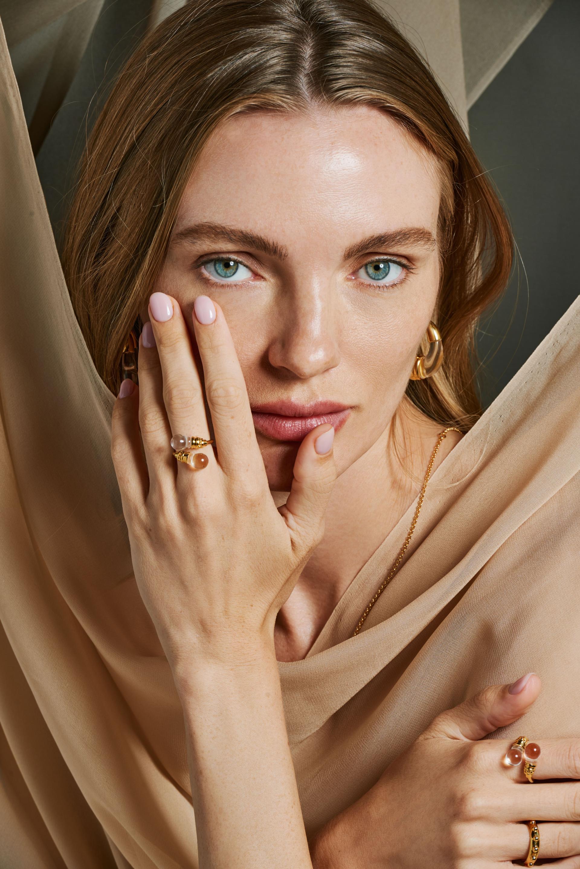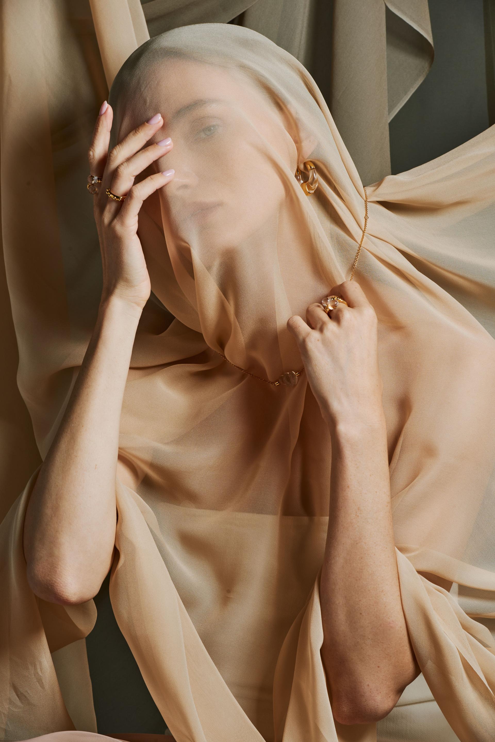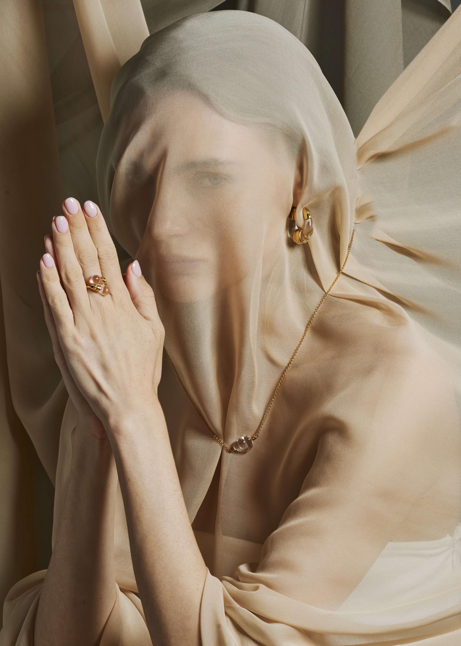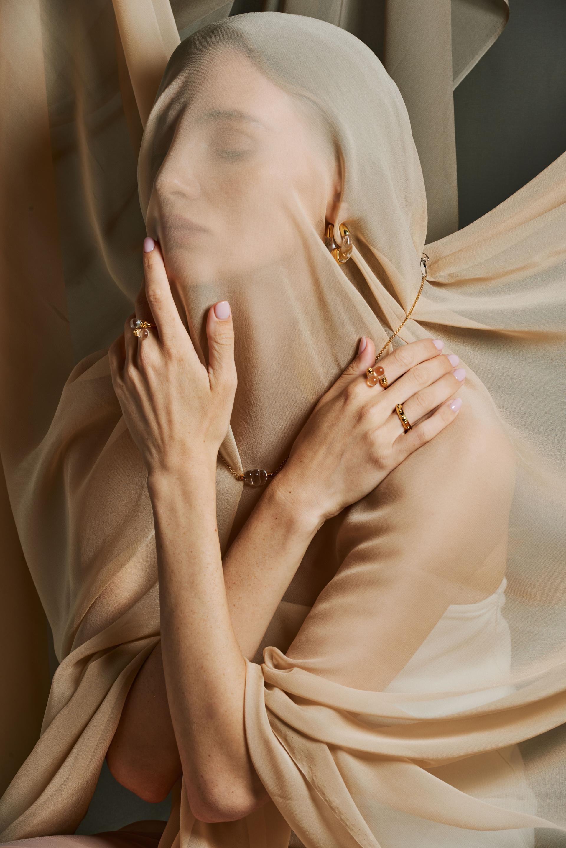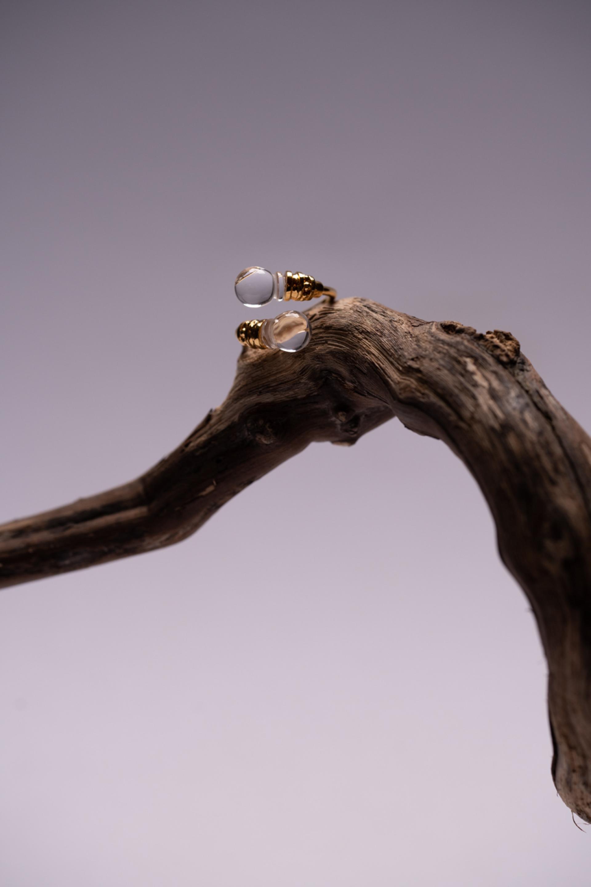 The Aqua Ring is a unique crystal ring in the Sand and Foam jewelry collection, inspired by Kahlil Gibran's poetry collection Sand and Foam. The designer uses the natural elements of "sand" and "foam" as metaphors, symbolizing how individuals, like sand, are small in society, while things, like foam, are fleeting and illusory.