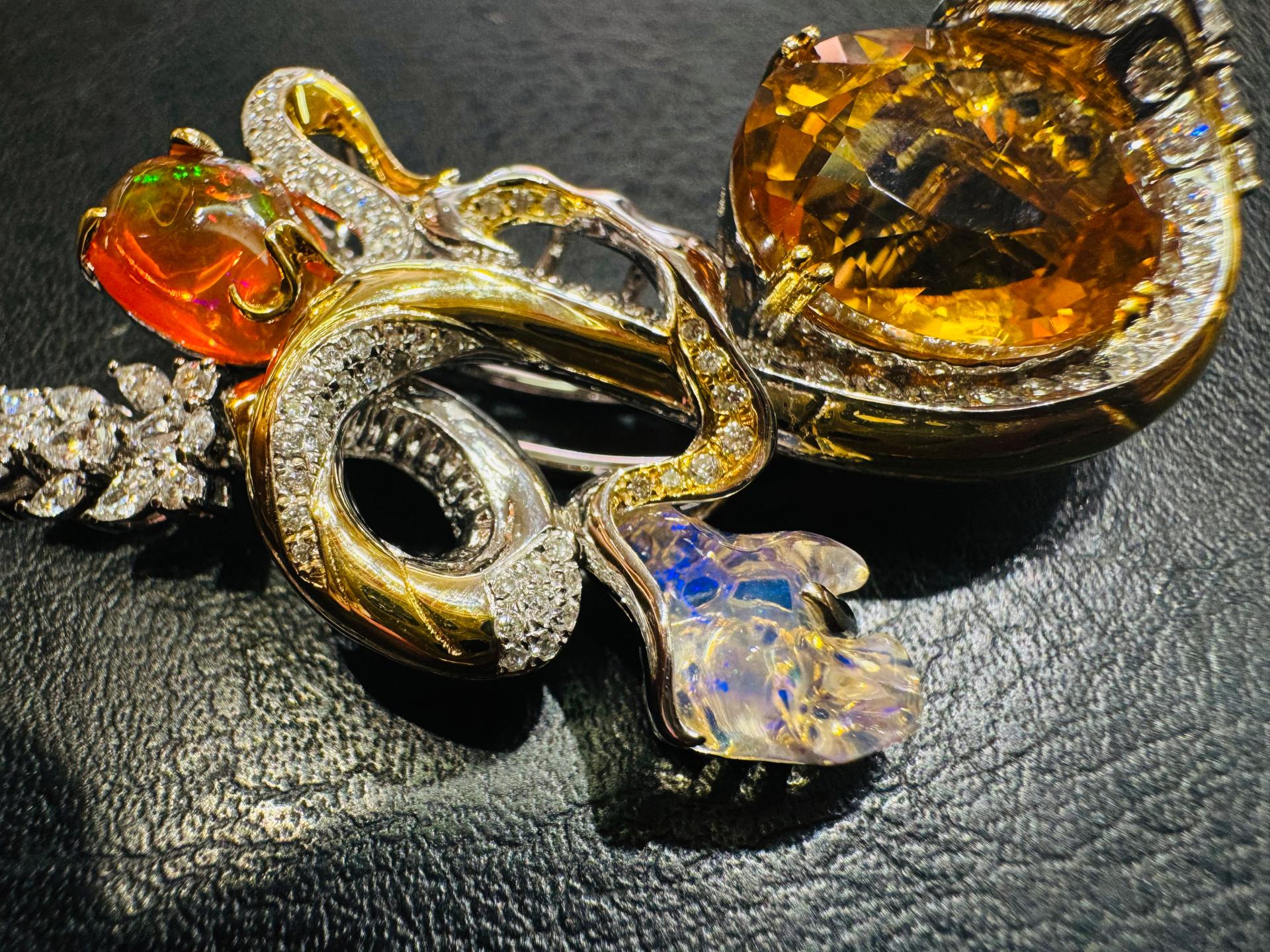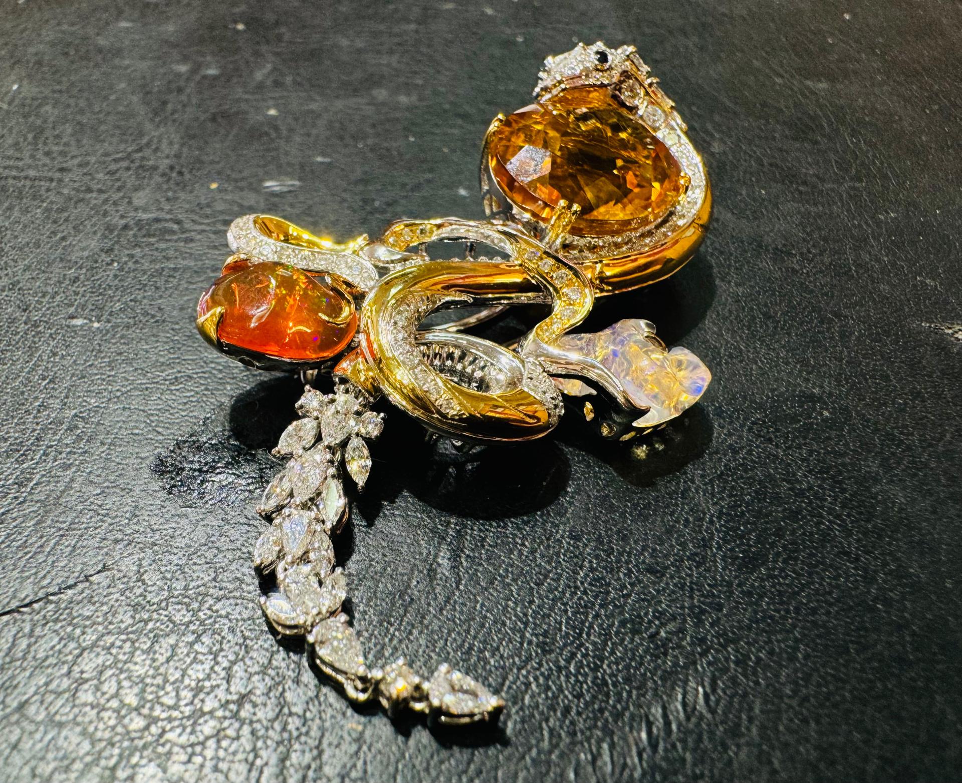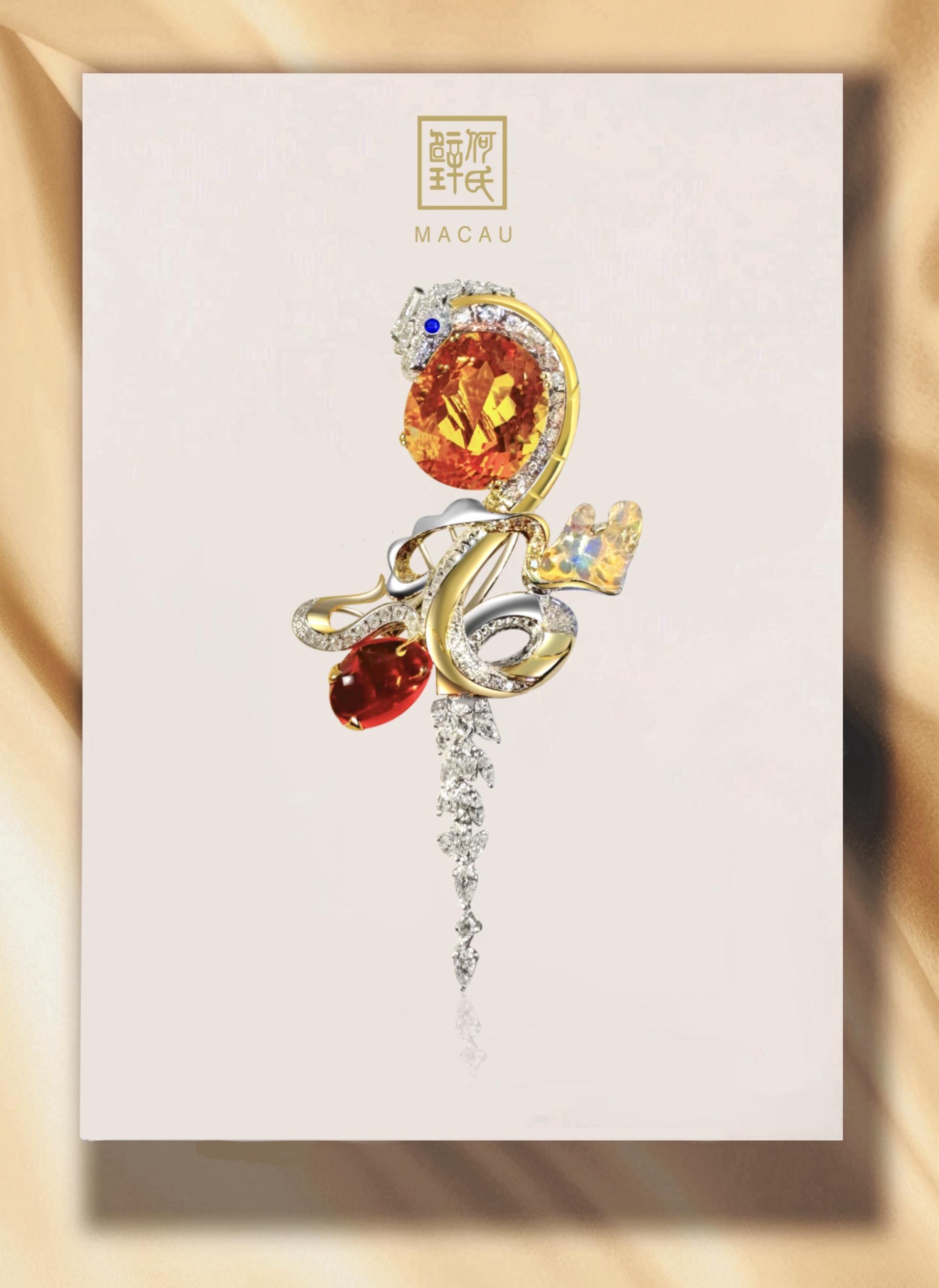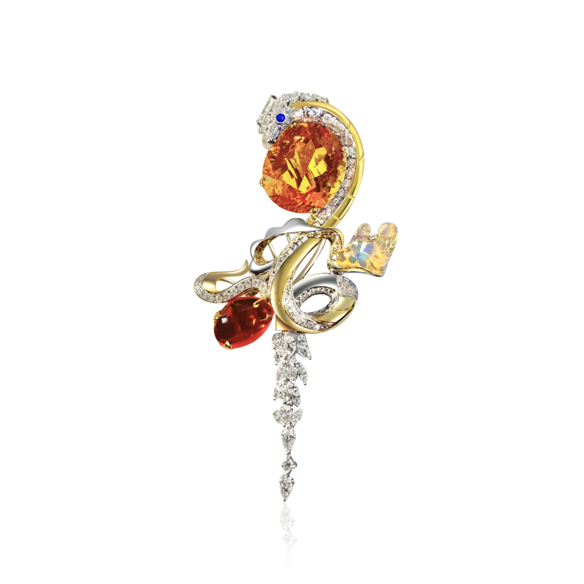 The Serpent of Transcendence brooch is inspired by the fluid elegance of the cursive Chinese character for snake, embodying the essence of transformation. A brilliant diamond crowns the serpent’s head, signifying the first spark of metamorphosis, while its gilded, intricately engraved scales symbolize resilience and untapped potential. Encircling the serpent are radiant clouds sculpted from fire opal, representing prosperity and boundless fortune.