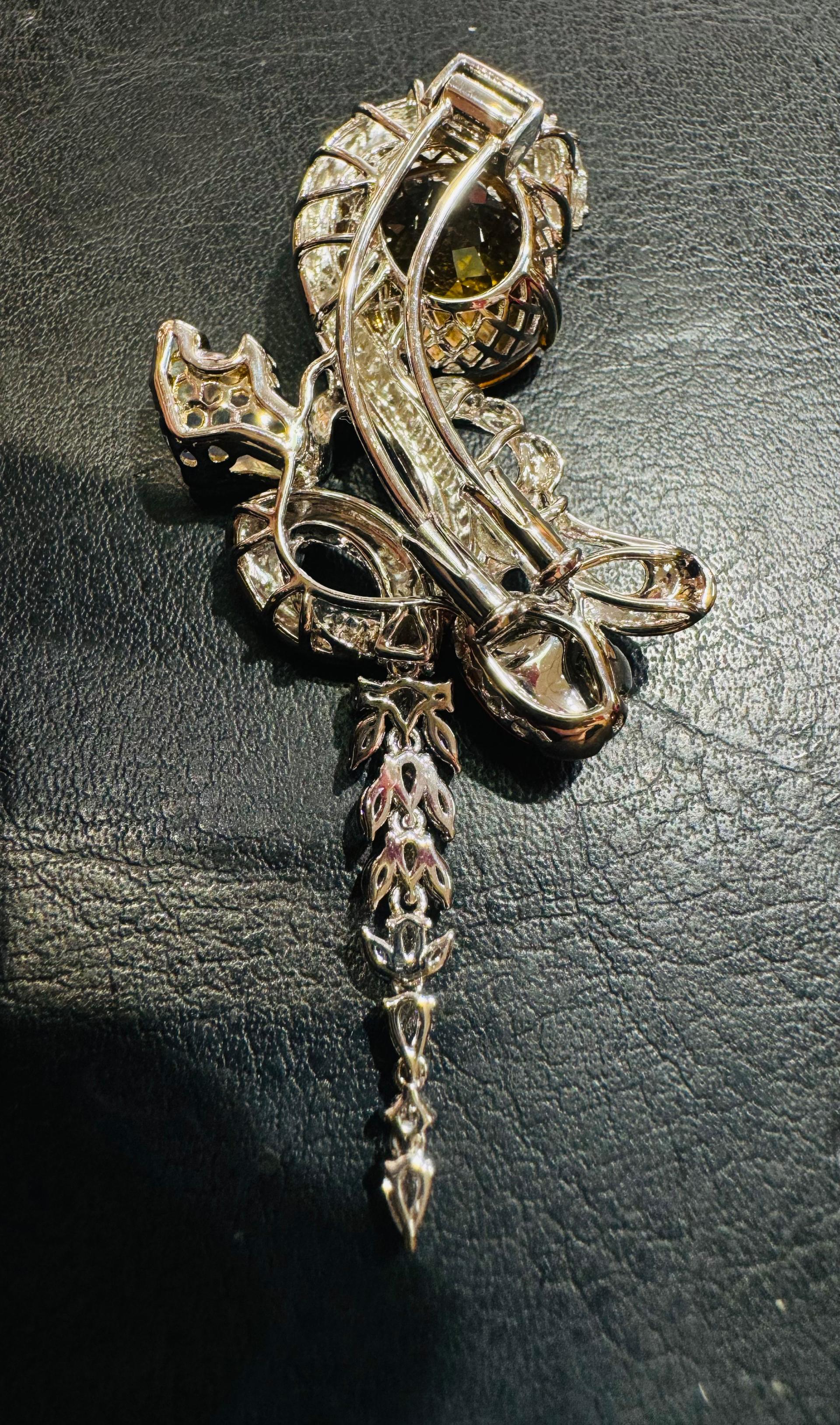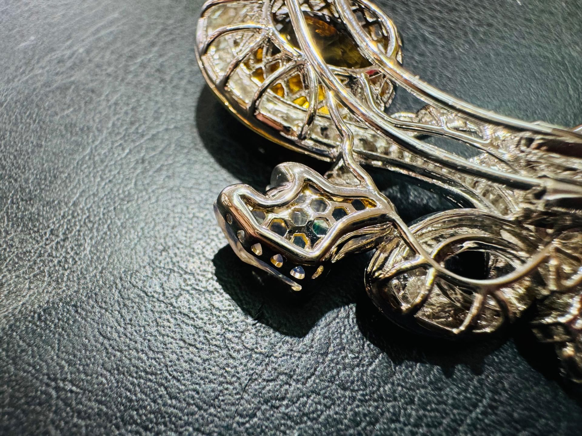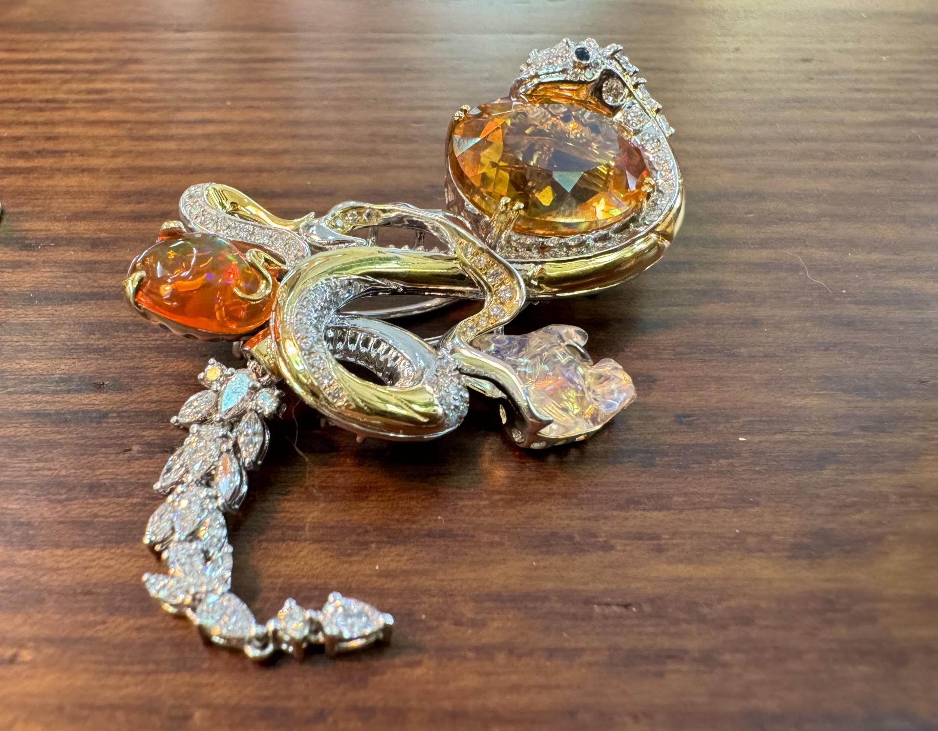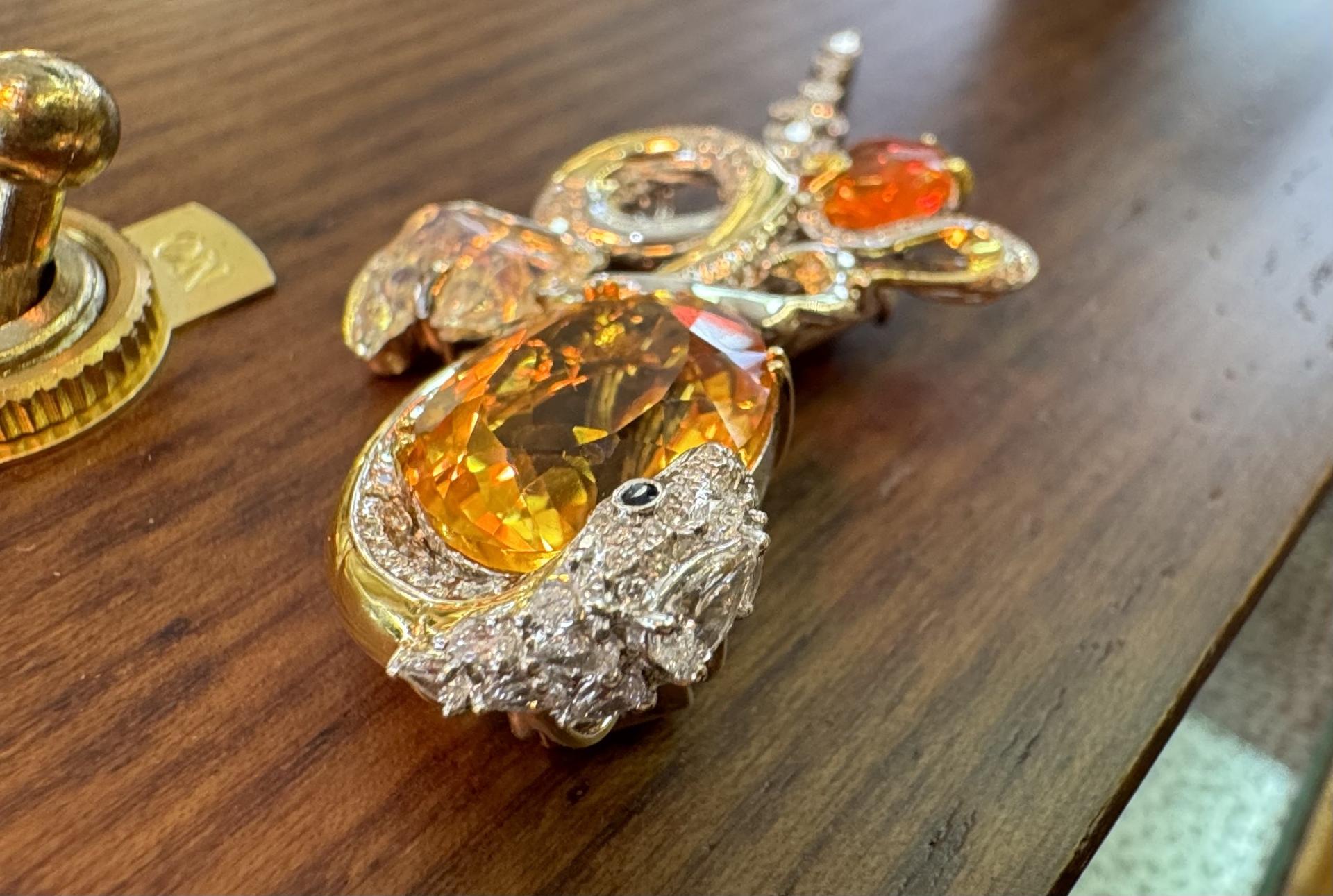The Serpent of Transcendence brooch is inspired by the fluid elegance of the cursive Chinese character for snake, embodying the essence of transformation. A brilliant diamond crowns the serpent’s head, signifying the first spark of metamorphosis, while its gilded, intricately engraved scales symbolize resilience and untapped potential. Encircling the serpent are radiant clouds sculpted from fire opal, representing prosperity and boundless fortune.
