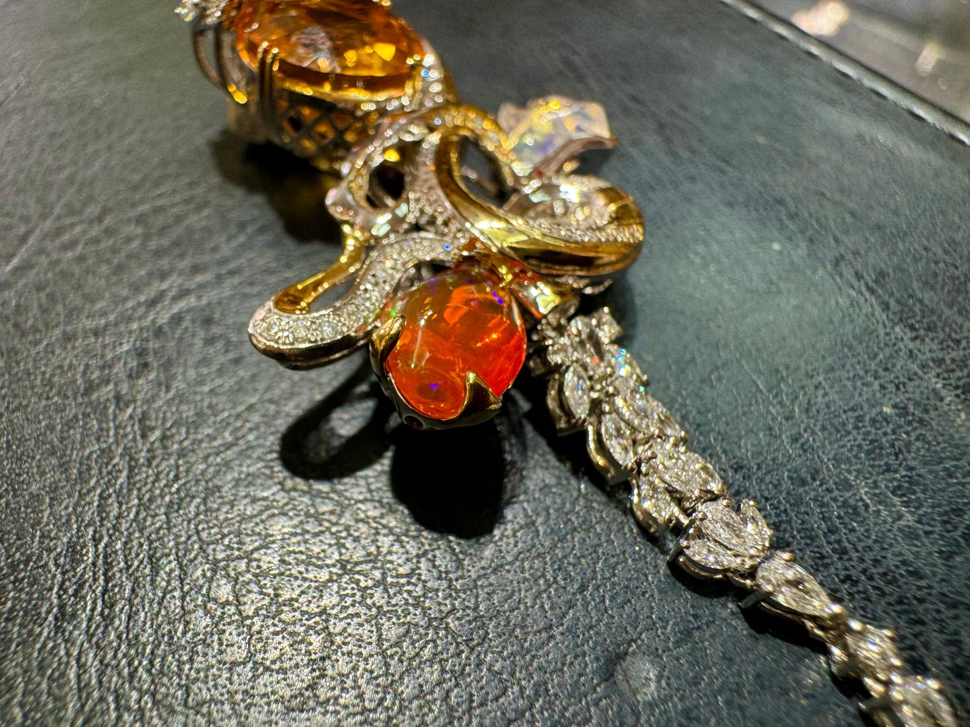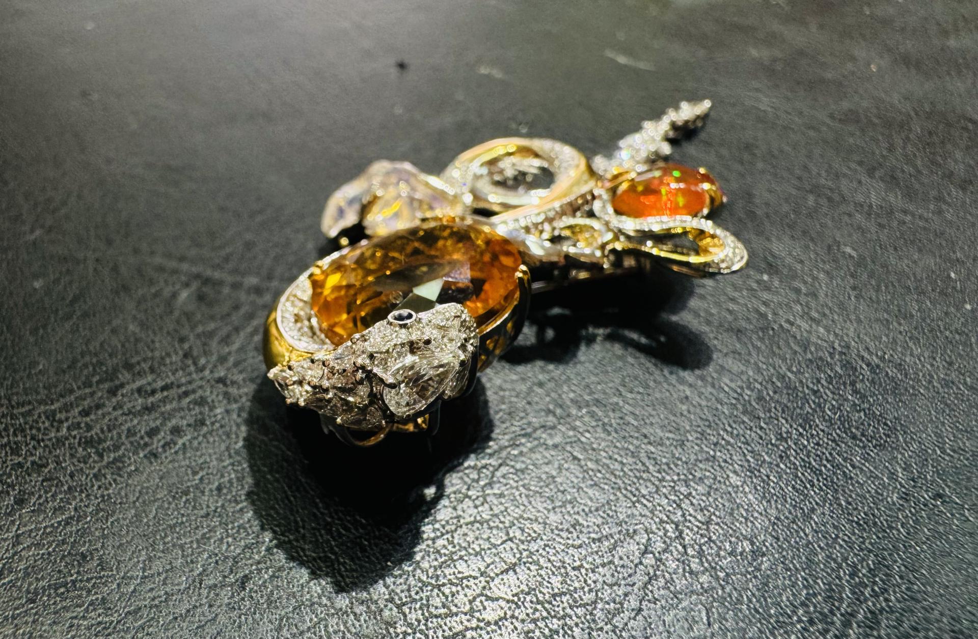 The brooch’s asymmetrical composition features natural, freeform fire opal, which shifts in color with every movement, enhancing its dynamic energy. Seamlessly blending the artistry of traditional Chinese ink aesthetics with haute joaillerie craftsmanship, the piece transforms jewelry into a three-dimensional calligraphic masterpiece.