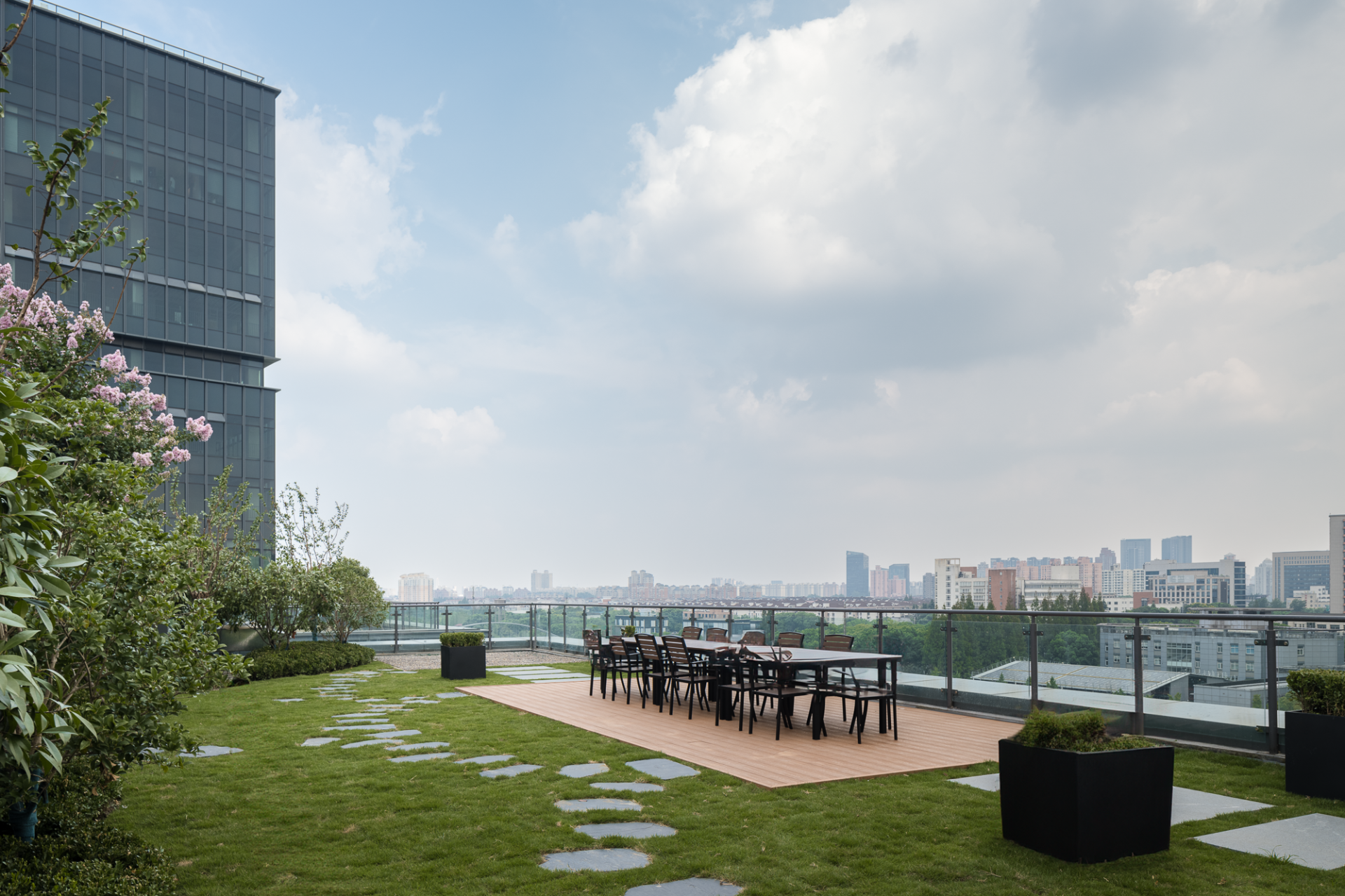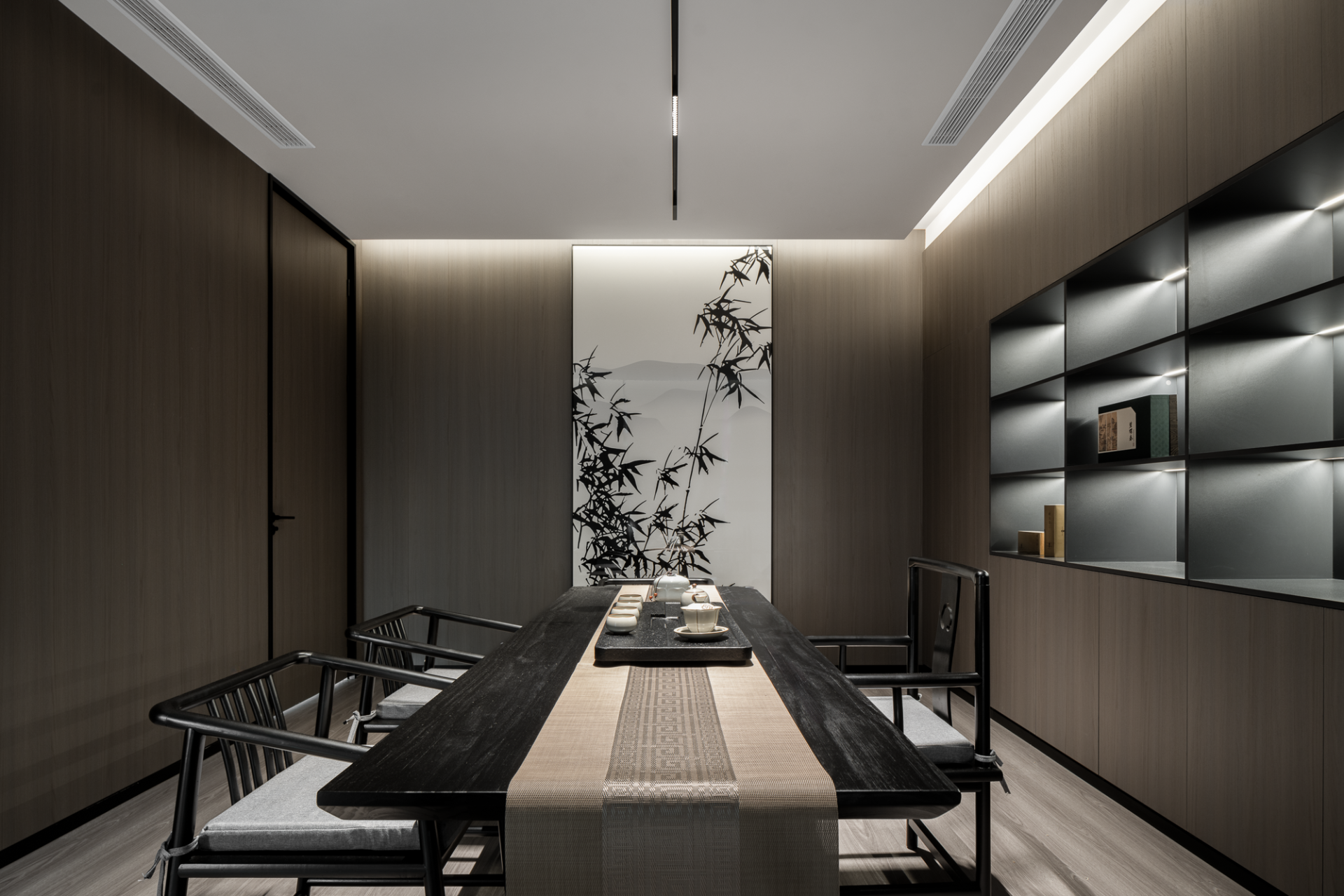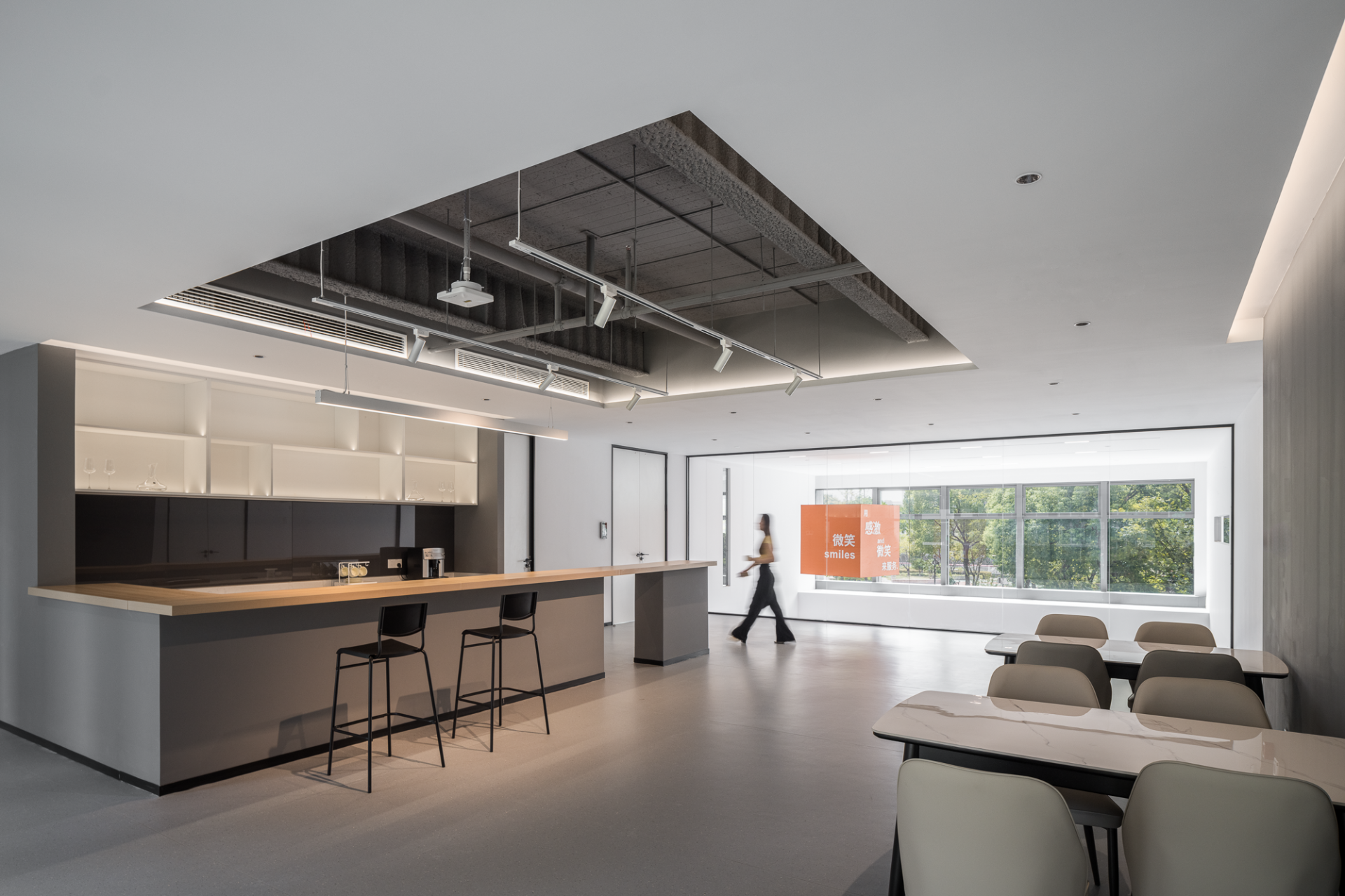 The 1F lobby with a high ceiling and suspended boxes not only broadens the view but also showcases the company's smiling service philosophy. The multi-functional area's glass curtain wall brings in natural light, promoting visual interaction between floors and creating an open atmosphere. The 2F space is characterized by a grey and white color scheme, making it feel spacious. The central island bar and movable furniture make the space flexible and versatile. Sound-absorbing felt is used on the walls of the training room to balance the comfort of the office environment. The 3F large meeting room features an innovative curved glass partition, creating a bright and spacious atmosphere. The unique curved elements add a modern aesthetic touch. The 4F open work area combines open and closed spaces, with an integrated rest area to facilitate employee communication and collaboration, embodying the "people-oriented" culture. The 5F space is ingeniously divided, with a bare ceiling design adding vitality. The stepped seating and window-side bar create a relaxing corner. The 6F executive floor adopts a dark wood grain finish to create a stable tone. The tea room's dark color scheme and wooden furniture, combined with hand-painted murals, exude cultural charm. The meeting room's simple style and floor-to-ceiling windows enhance comfort. The rooftop terrace integrates the city and nature, with grey glass curtain walls reflecting the river view, meeting the needs of relaxation and team building, and highlighting its multi-functional appeal.