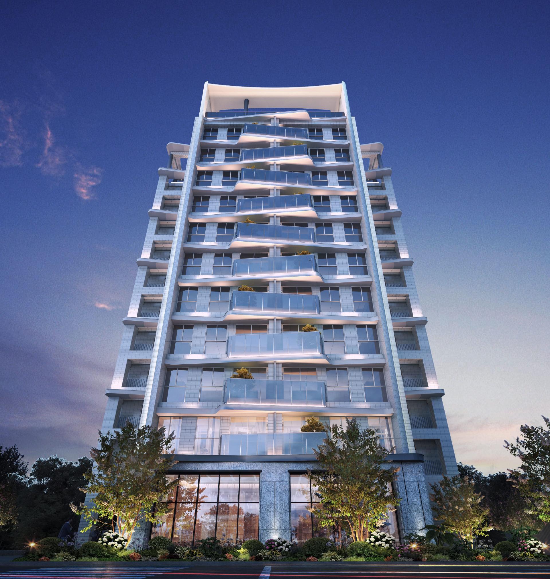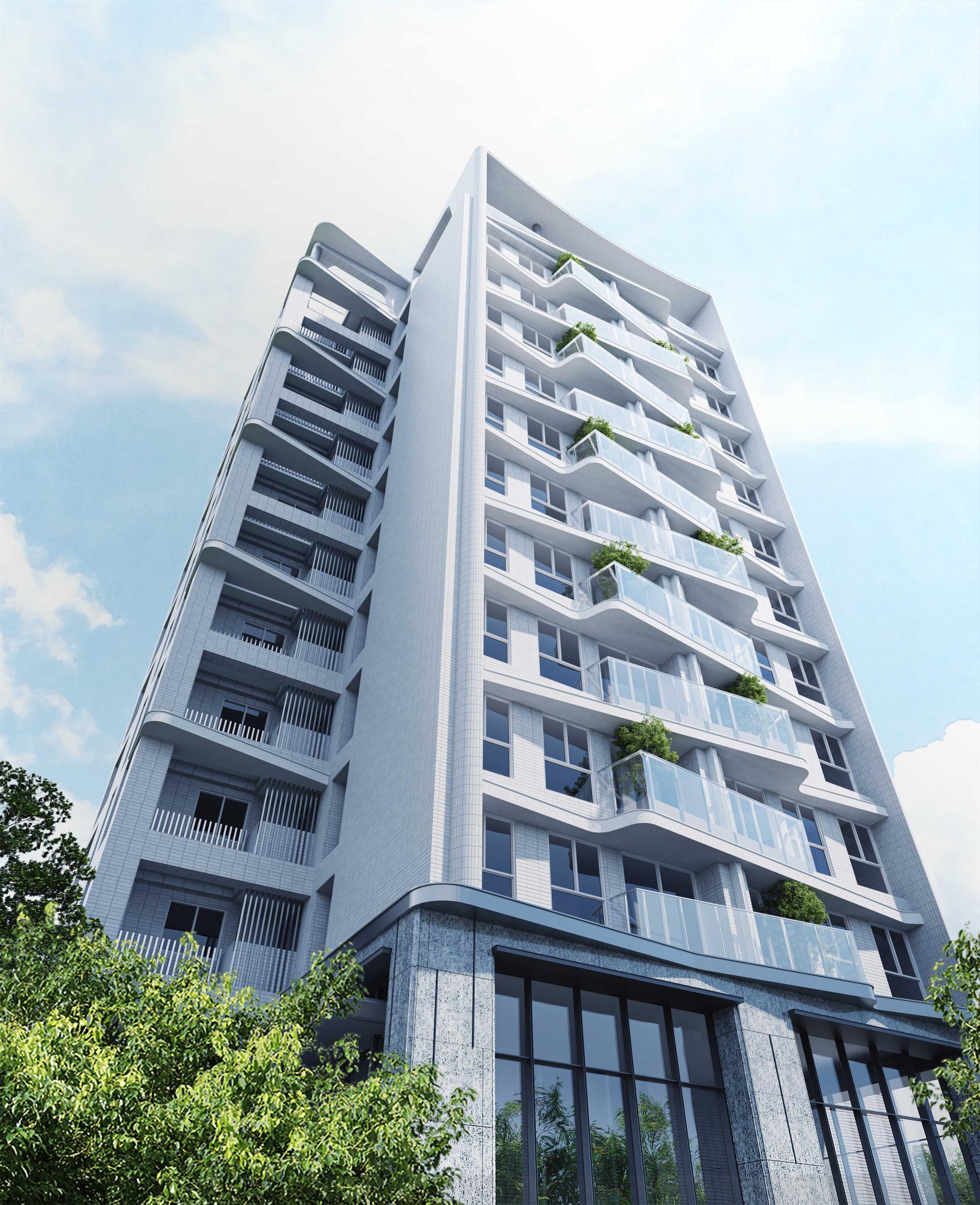 tall with 11 floors above ground and 1 floor underground, with 40 residences. In harmony with low-density development and high green coverage in 14th Redevelopment Zone, it cultivates a tranquil and poetic atmosphere, offering a prestigious and private living experience.