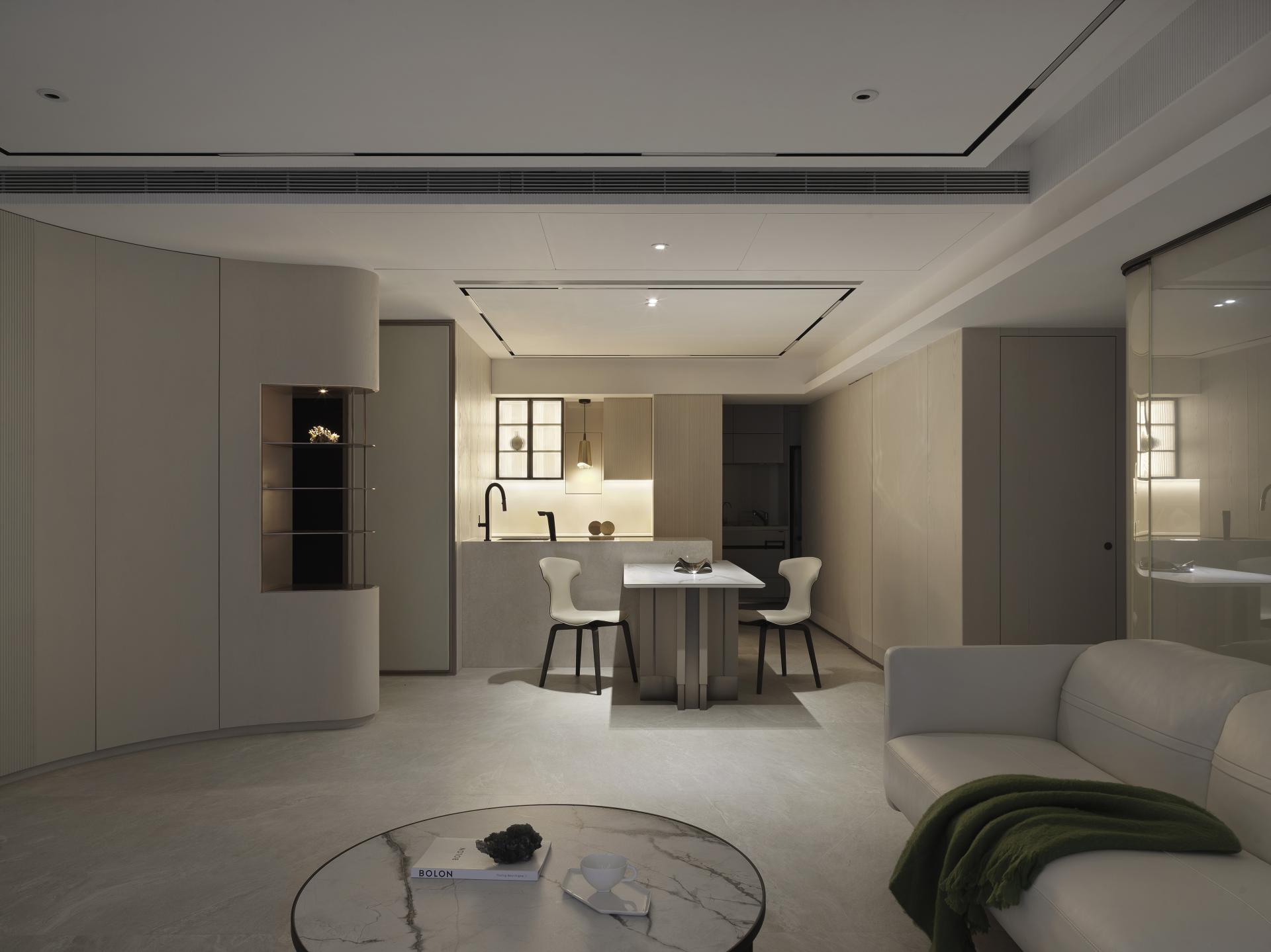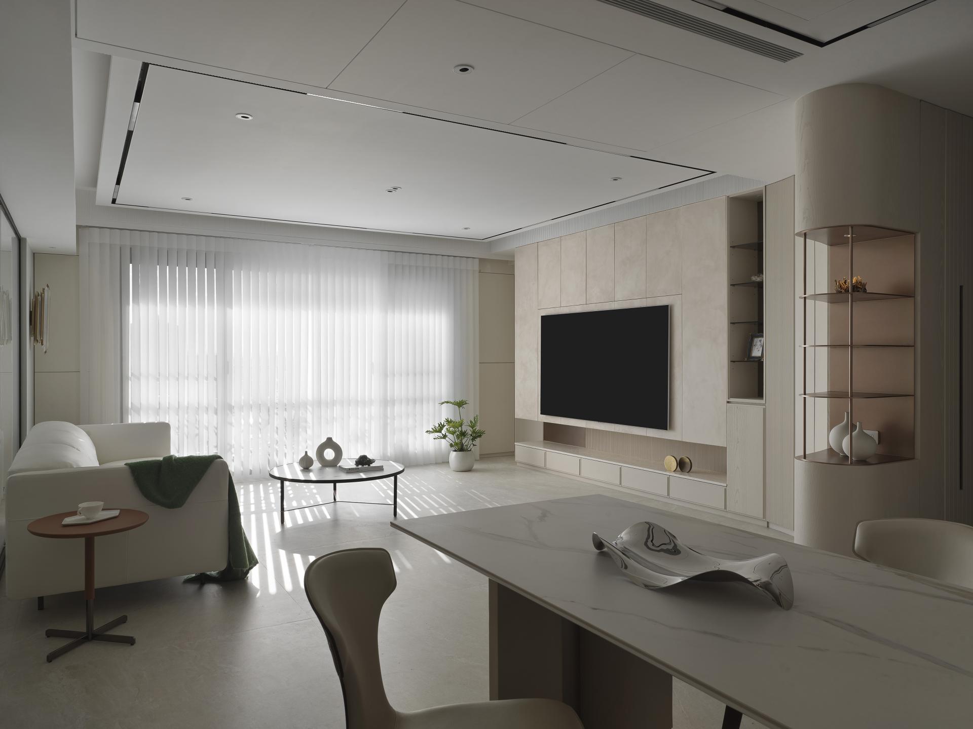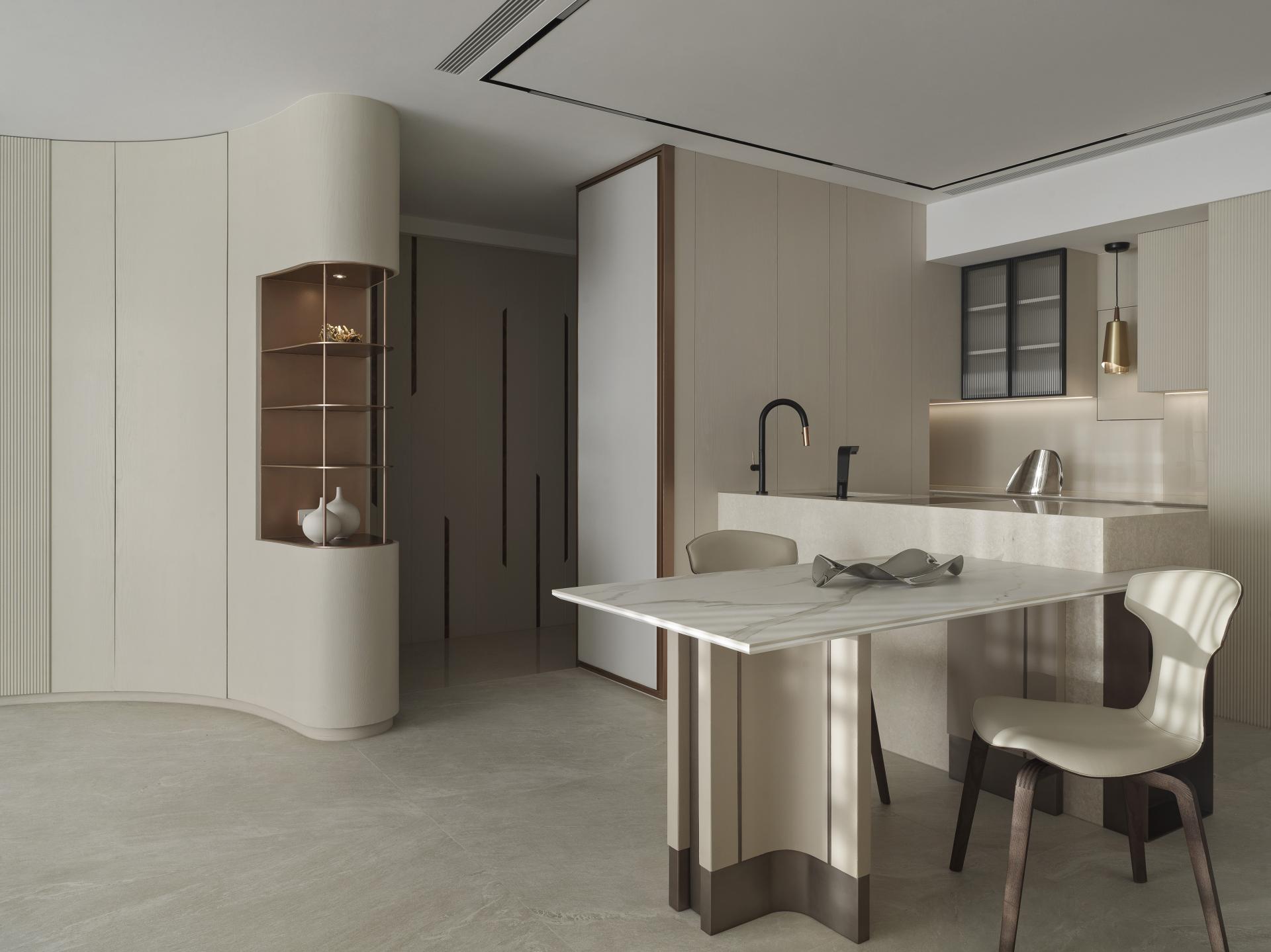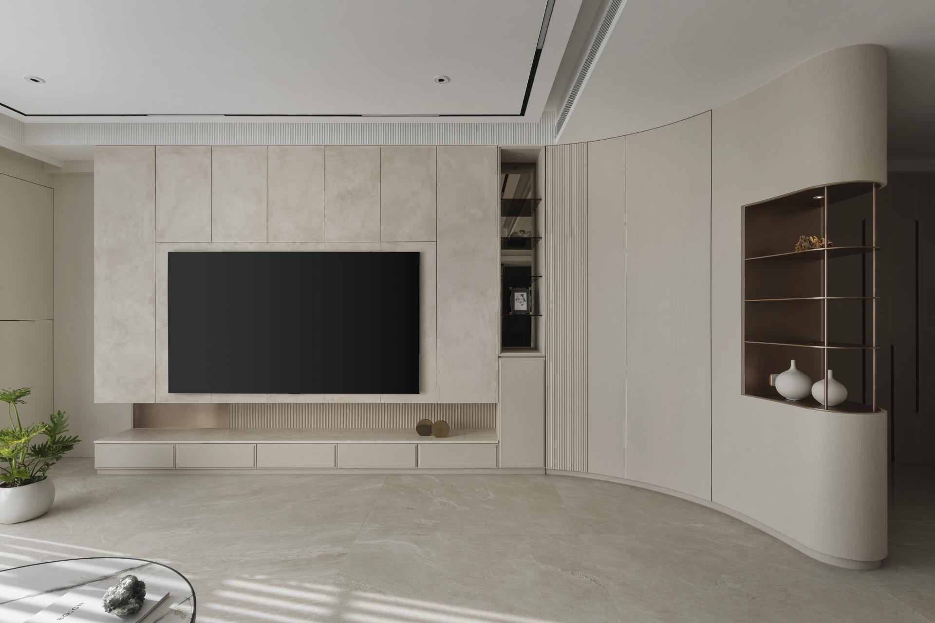 To address the need for a functional entryway buffer, the designer expertly positioned a curved corner cabinet, adorned with a meticulously crafted arched design, at the end view of the entrance. This thoughtful configuration delineates the transition from the corridor to the living room, while the fluid, sweeping curves seamlessly integrate the cabinet with the adjacent TV wall. This design marvelously mitigates the rigidity often associated with rectangular layouts and sharp cabinet corners and introduces a sense of harmony and fluidity. Enhanced by a serene, neutral color palette, the main communal area—designed as the heart of family gatherings—radiates a soft, welcoming ambiance, fostering a bright and inviting environment for a family of four.