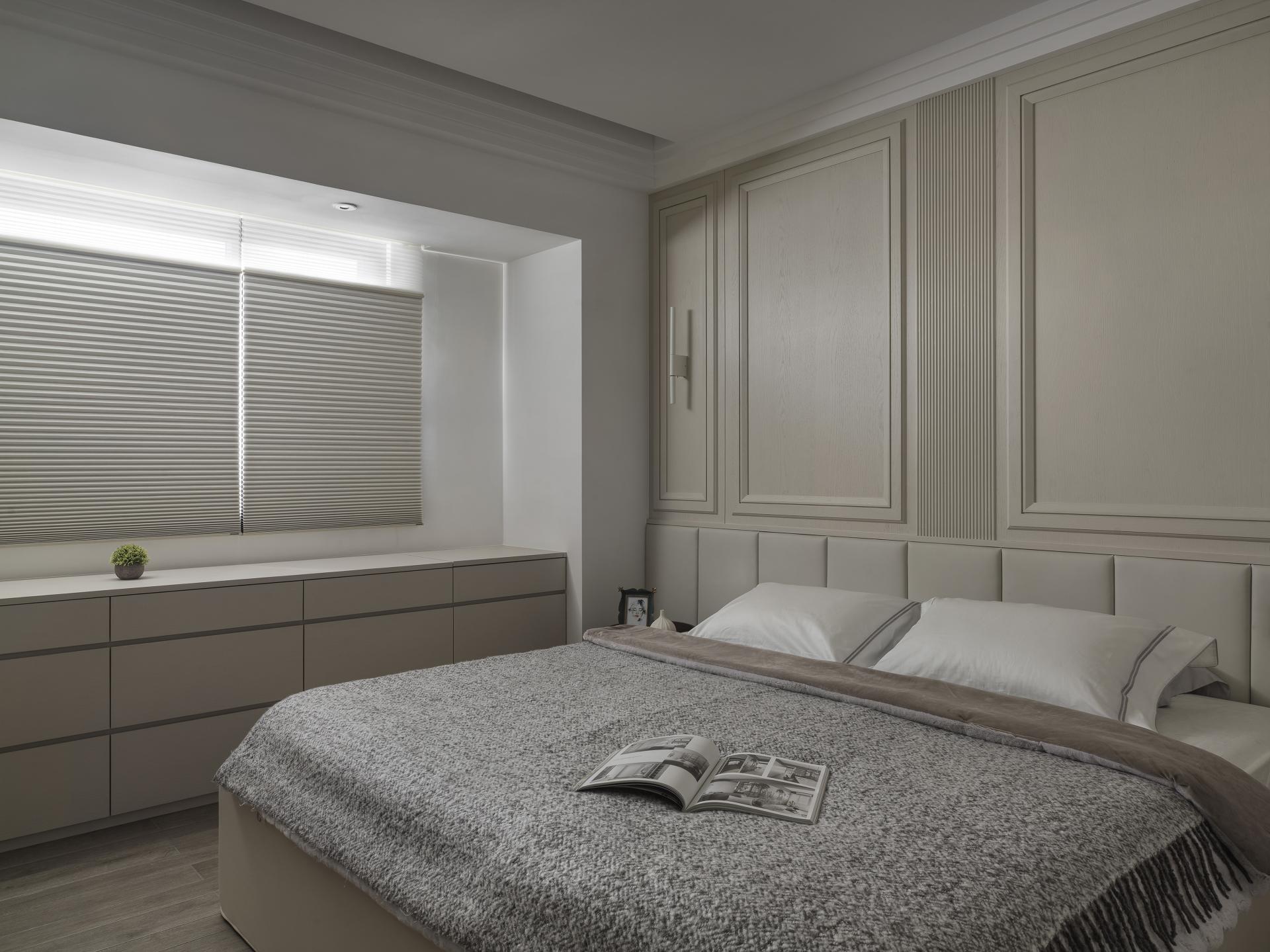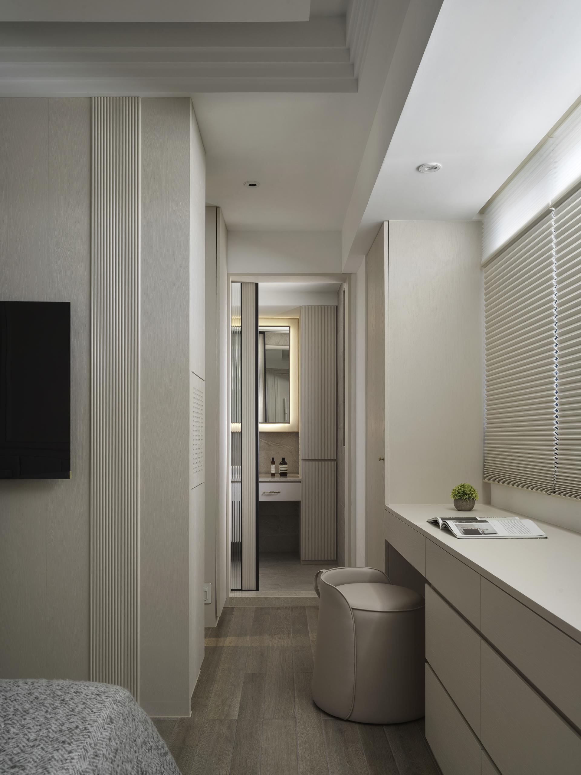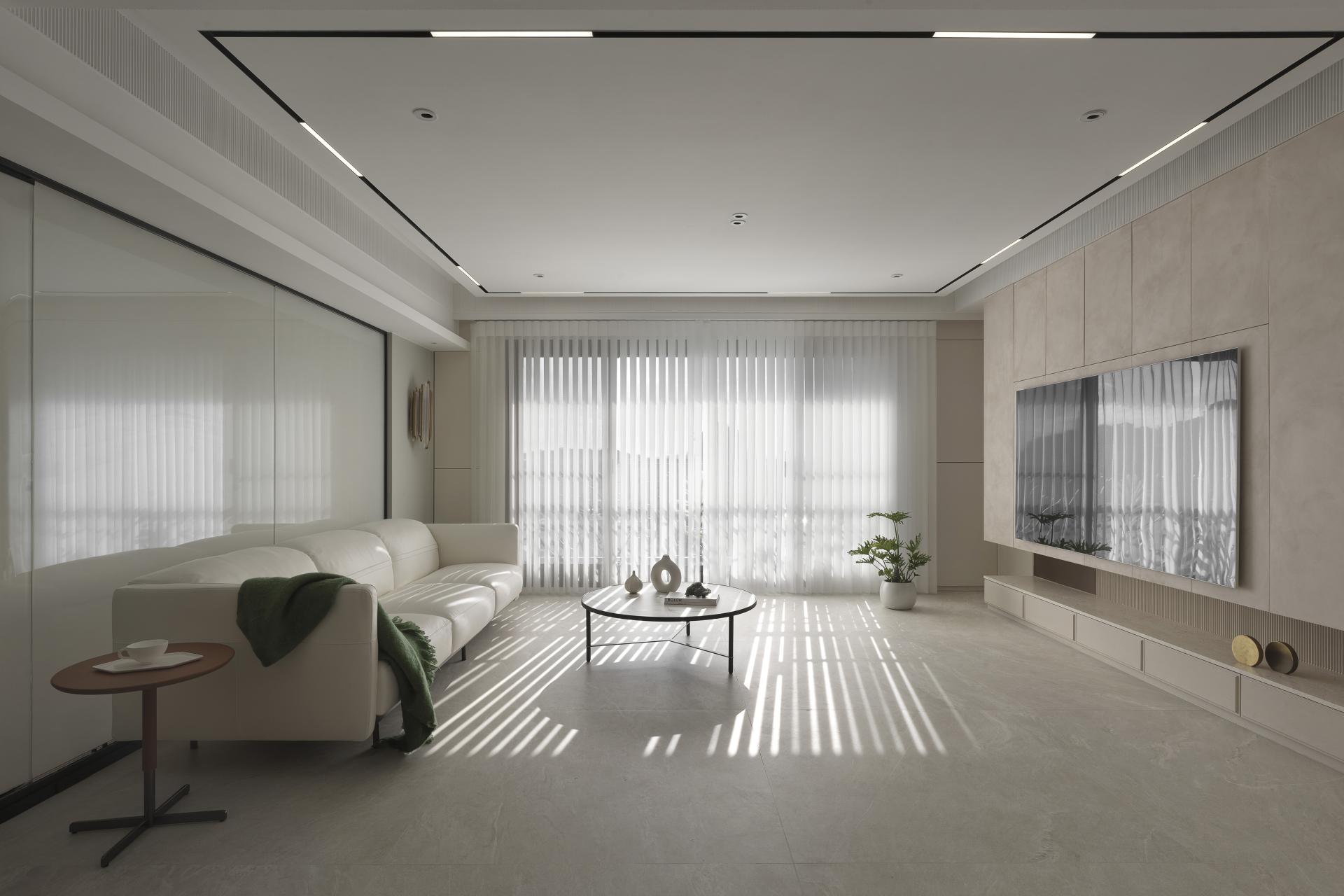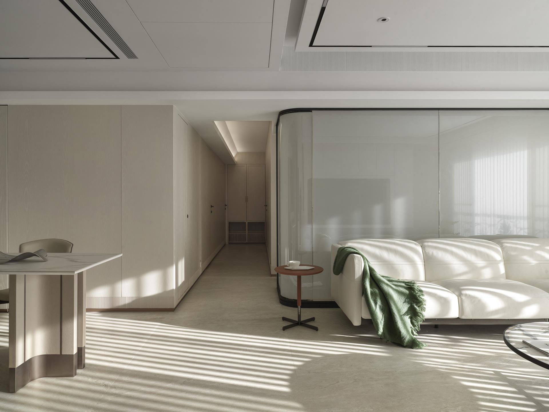 To address the need for a functional entryway buffer, the designer expertly positioned a curved corner cabinet, adorned with a meticulously crafted arched design, at the end view of the entrance. This thoughtful configuration delineates the transition from the corridor to the living room, while the fluid, sweeping curves seamlessly integrate the cabinet with the adjacent TV wall. This design marvelously mitigates the rigidity often associated with rectangular layouts and sharp cabinet corners and introduces a sense of harmony and fluidity. Enhanced by a serene, neutral color palette, the main communal area—designed as the heart of family gatherings—radiates a soft, welcoming ambiance, fostering a bright and inviting environment for a family of four.