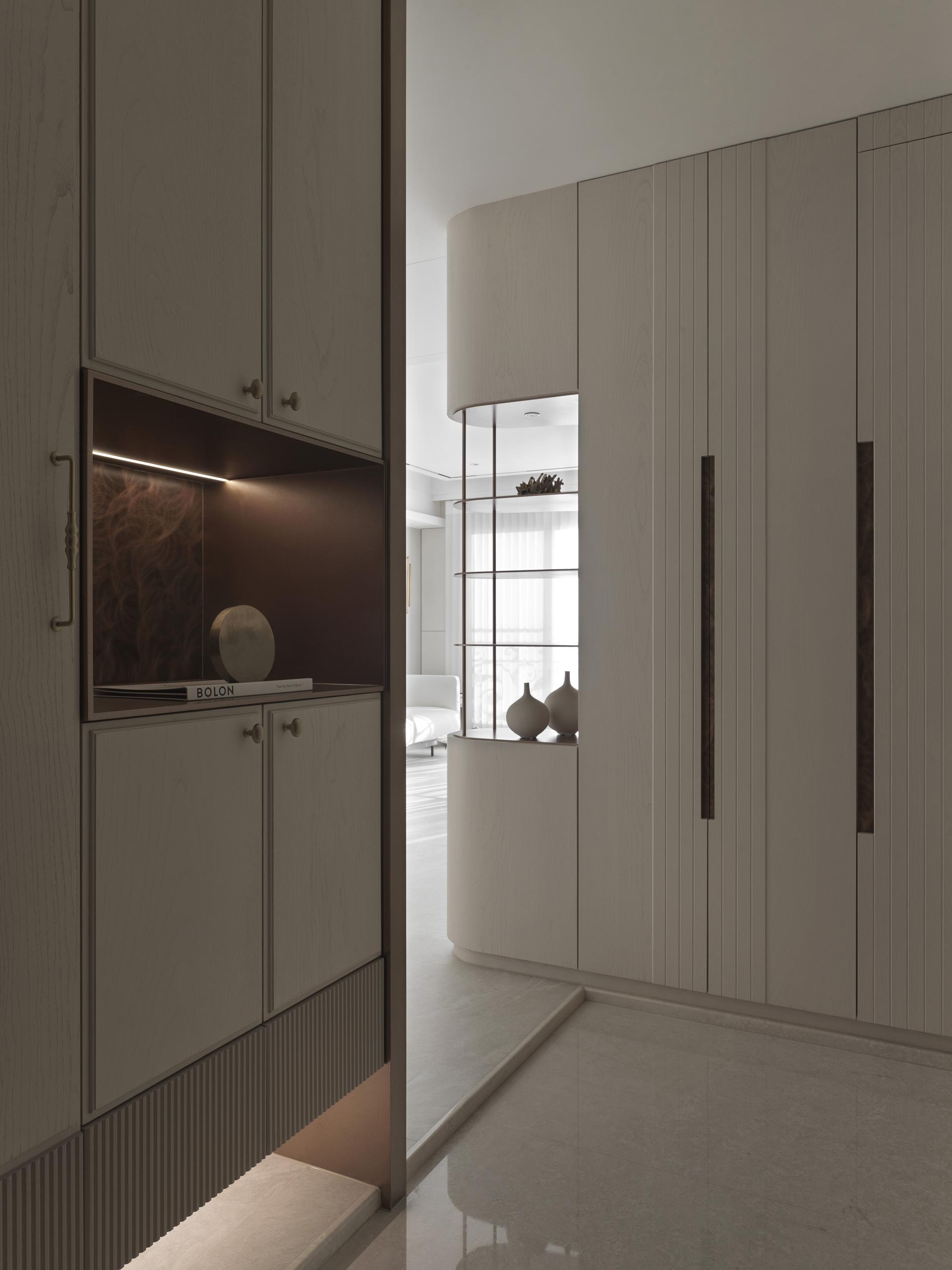 The homeowner’s vision of a serene dreamland, defined by understated elegance, guided the design ethos. Beige was chosen as the dominant hue, creating a foundation imbued with warmth while preserving an air of purity. This tranquil palette is enriched by the subtle interplay of tonal moldings, curvilinear accents, and an exquisite selection of materials—including wood veneer, stone, metal, and artistic coatings. Together, these elements craft a sophisticated and textured ambiance where vertical and horizontal lines converge to produce a harmonious and layered visual experience.