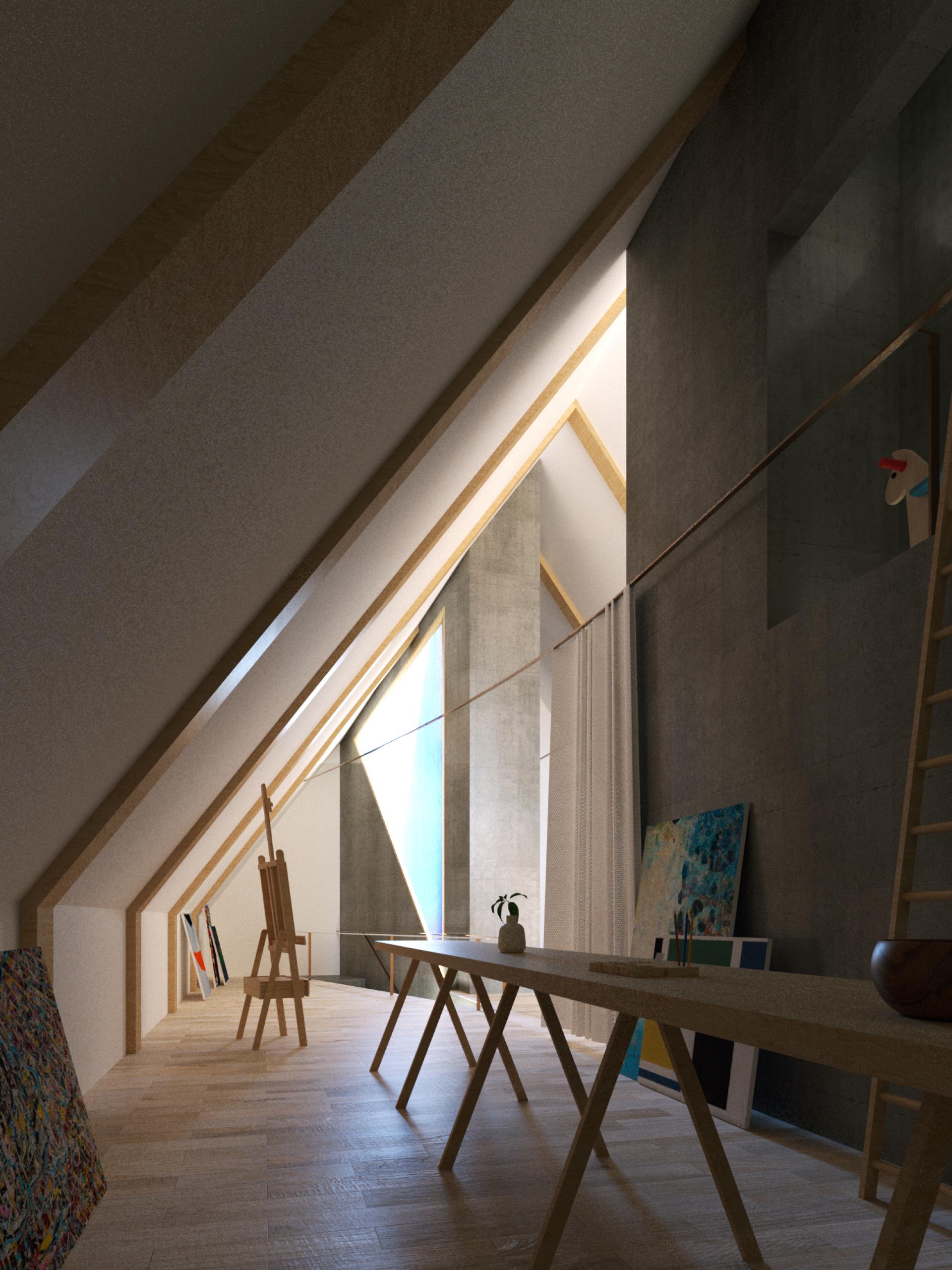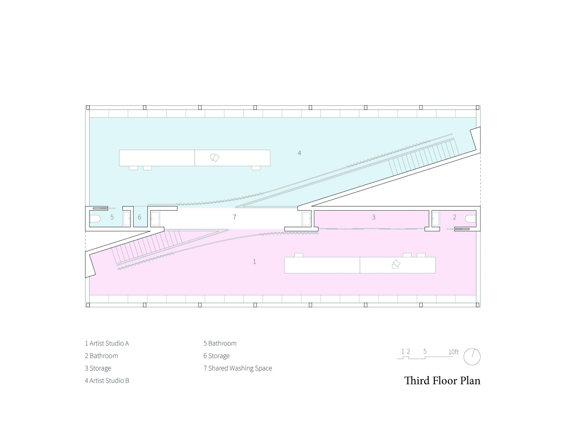 On the third floor, the layout features two dedicated studio spaces for the artists. The design transitions from expansive areas on the lower levels to more intimate and private work zones above, with a clear shift from communal interaction to personal privacy.
