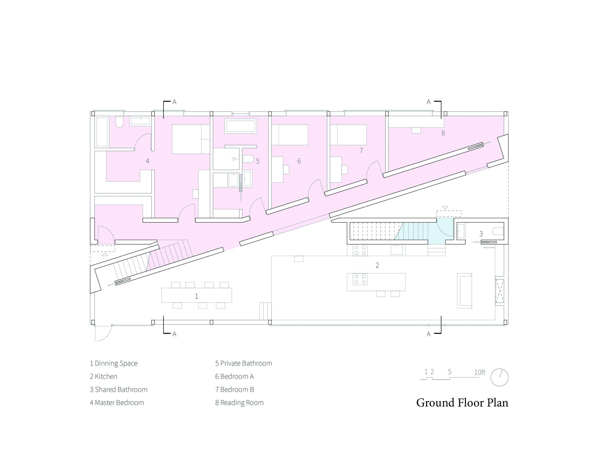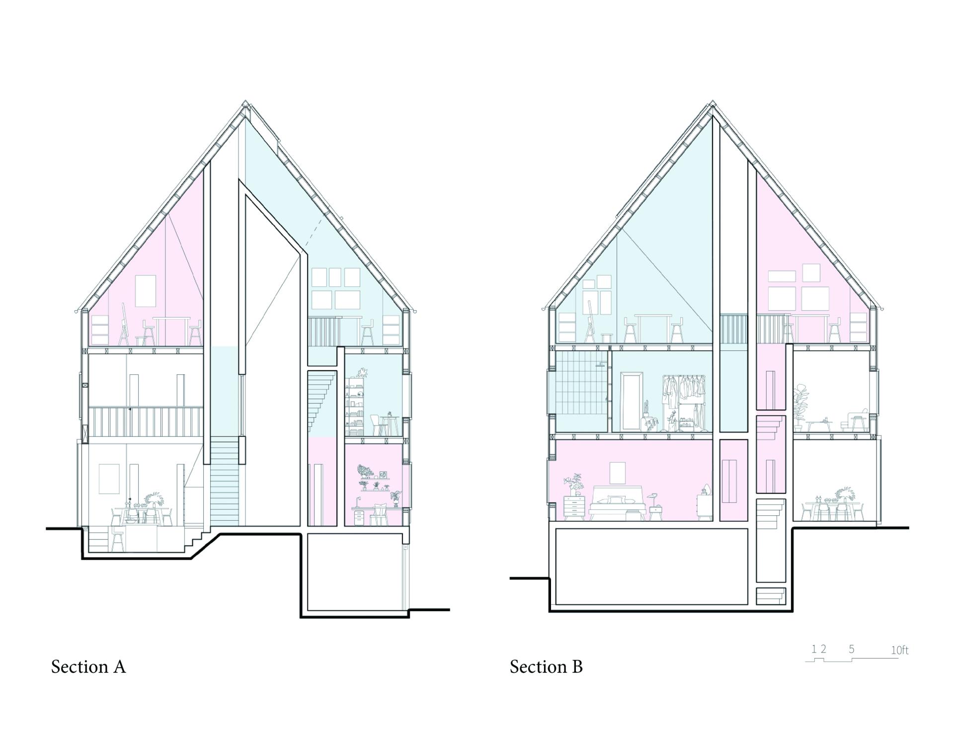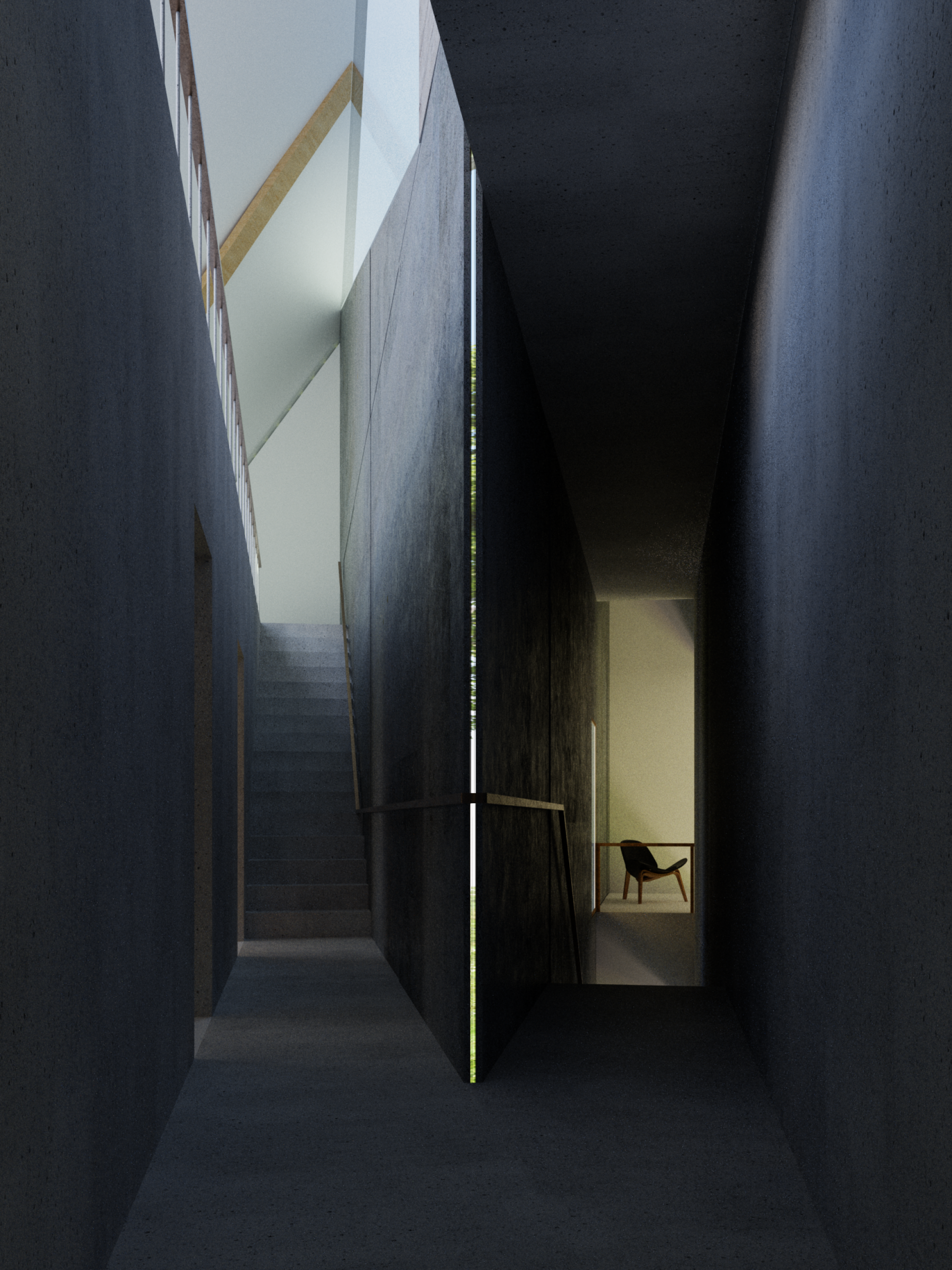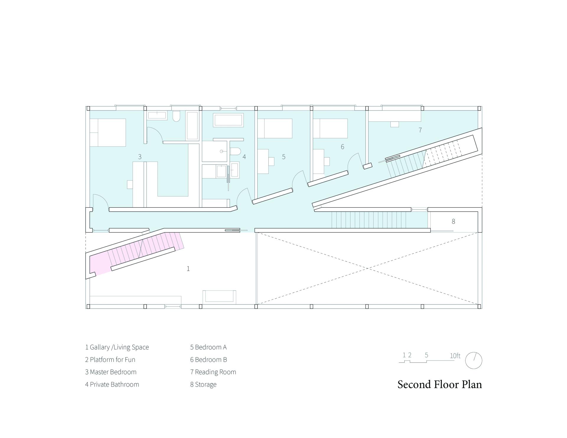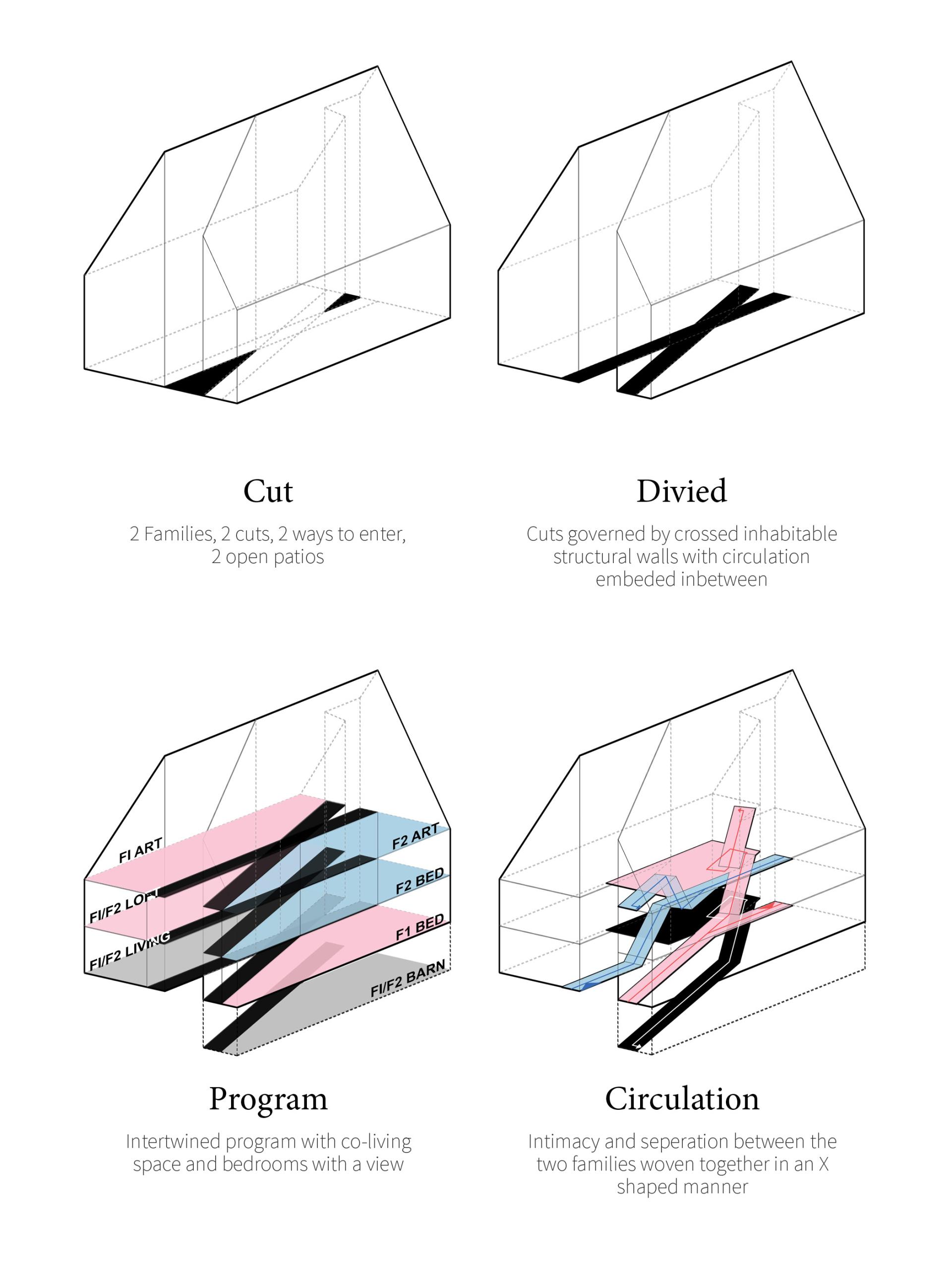 The entrance to the interior is defined by the "X" cut, leading visitors into the space through a small porch that serves as an entry point. Each family enjoys independent and dynamic circulation within the "X," allowing for seamless movement through the various functional areas of the house. The intersection of the "X" not only facilitates the flow of natural light into the circulation areas but also provides glimpses into the daily lives of the residents.