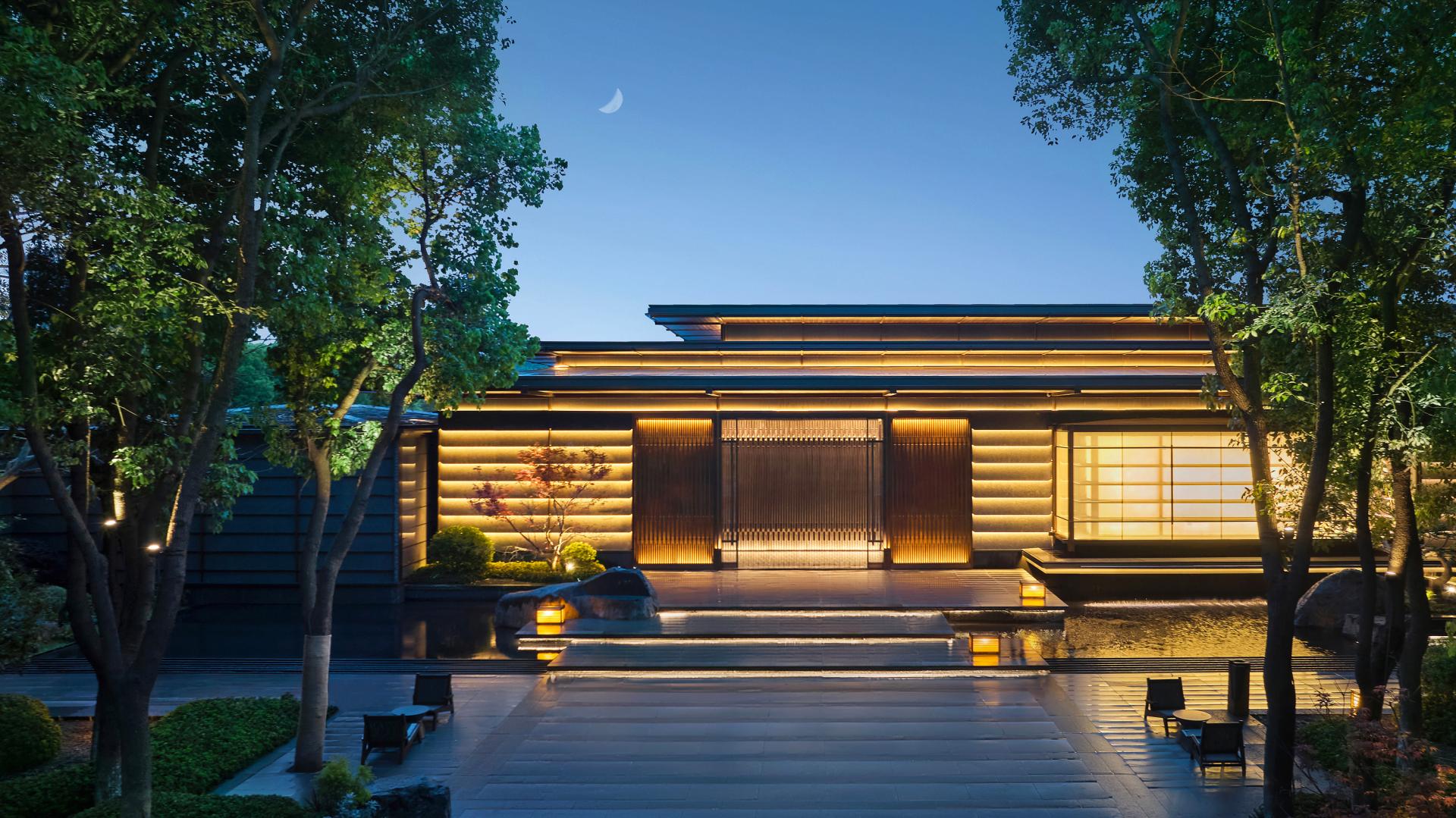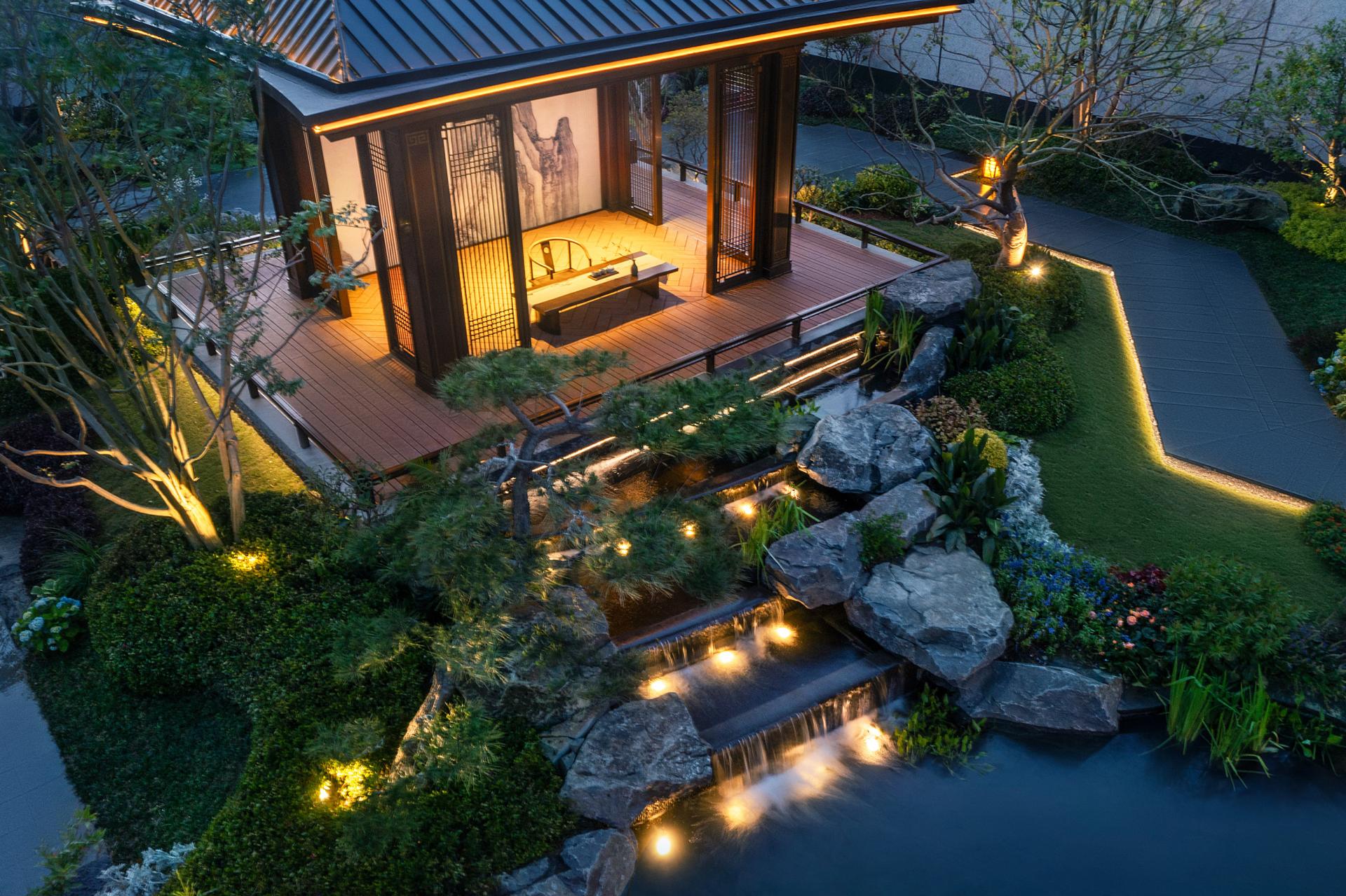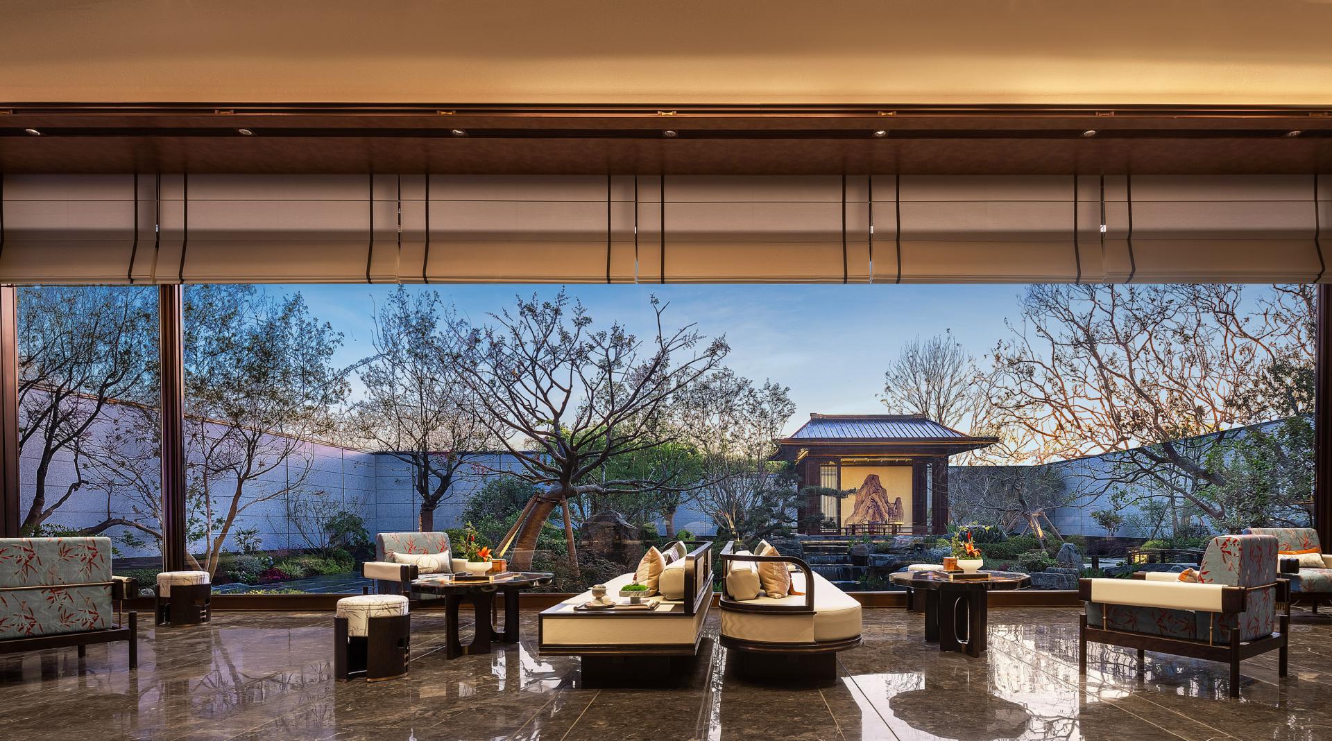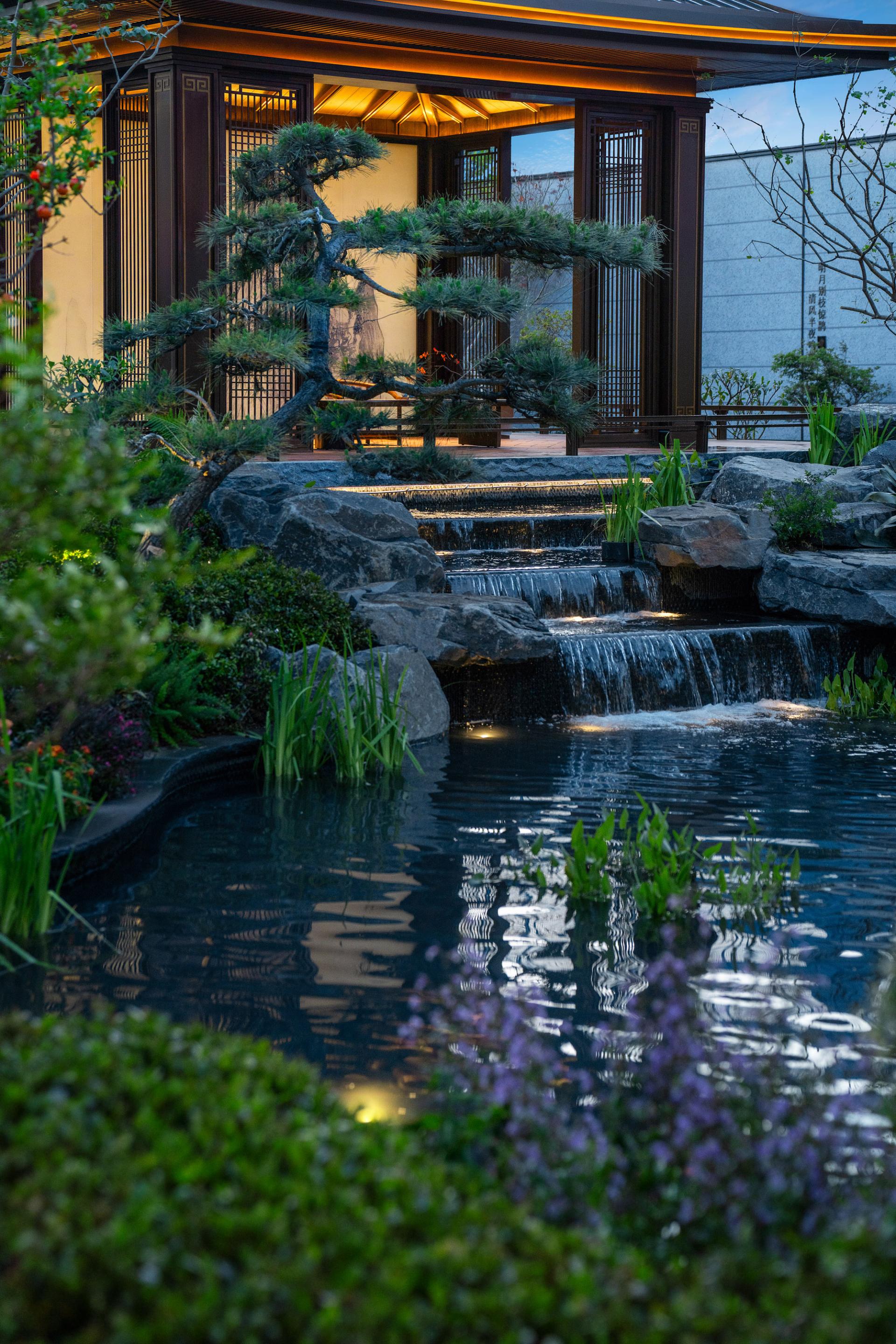 In architectural design, traditional sloped roofs and double eaves are abstracted into stacked flat roofs, embodying a understated Eastern aesthetic. The front facade incorporates Chinese-style floor lamps, and features a multi-layer exterior, with an outer layer of wired glass and an inner layer of translucent stone glass. The cantilevered cavity includes light strips, creating a dynamic sense of depth and layering. The palace lanterns, combined with cascading water features, become a striking visual focal point for the city. The building's main body is clad in stacked blue granite, with alternating lighting replacing seams, and light strips hidden behind the granite to create a concealed lighting effect. A 15-meter ultra-large glass window faces the inner courtyard, seamlessly blending indoor and outdoor spaces and offering views of an Eastern garden landscape.