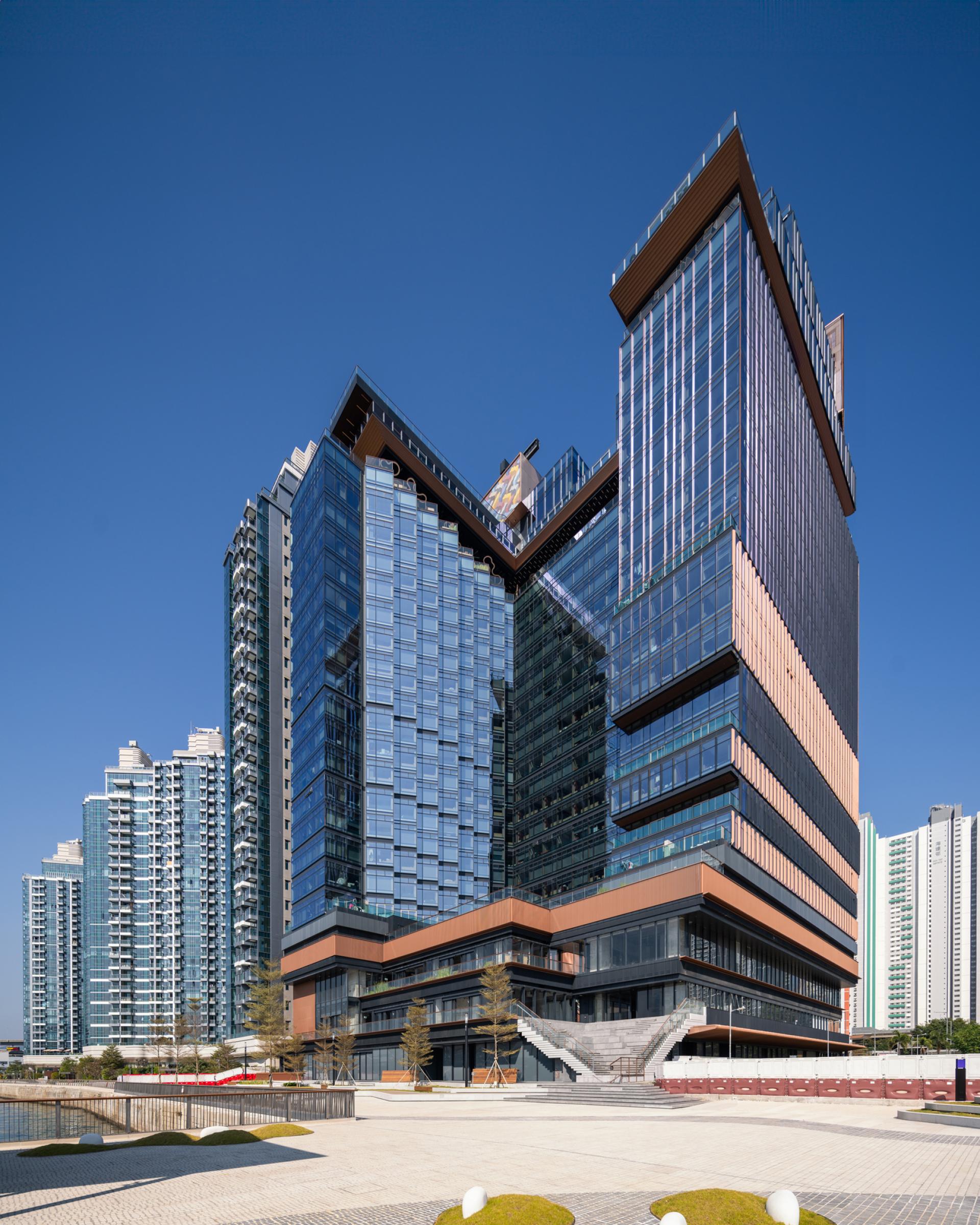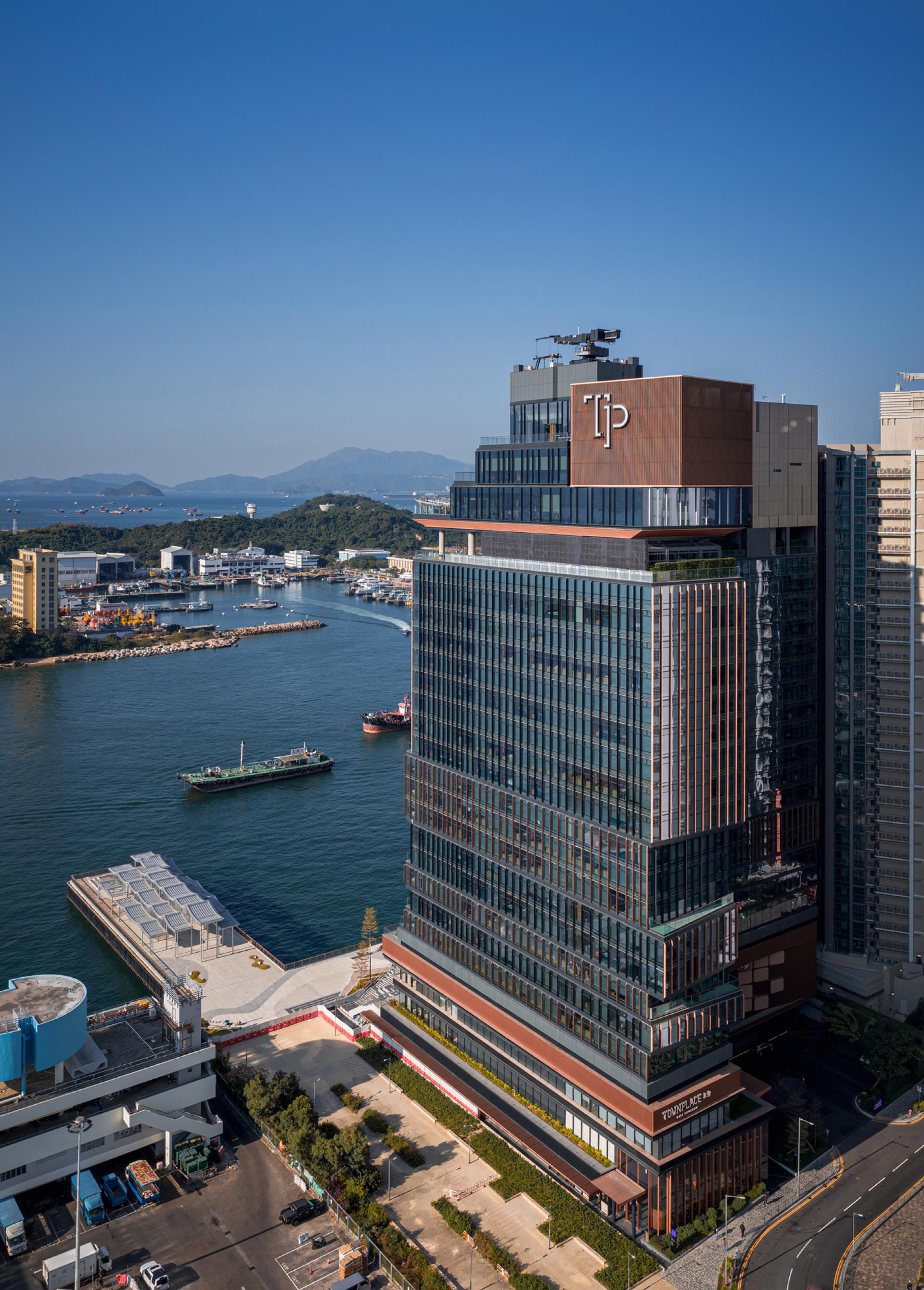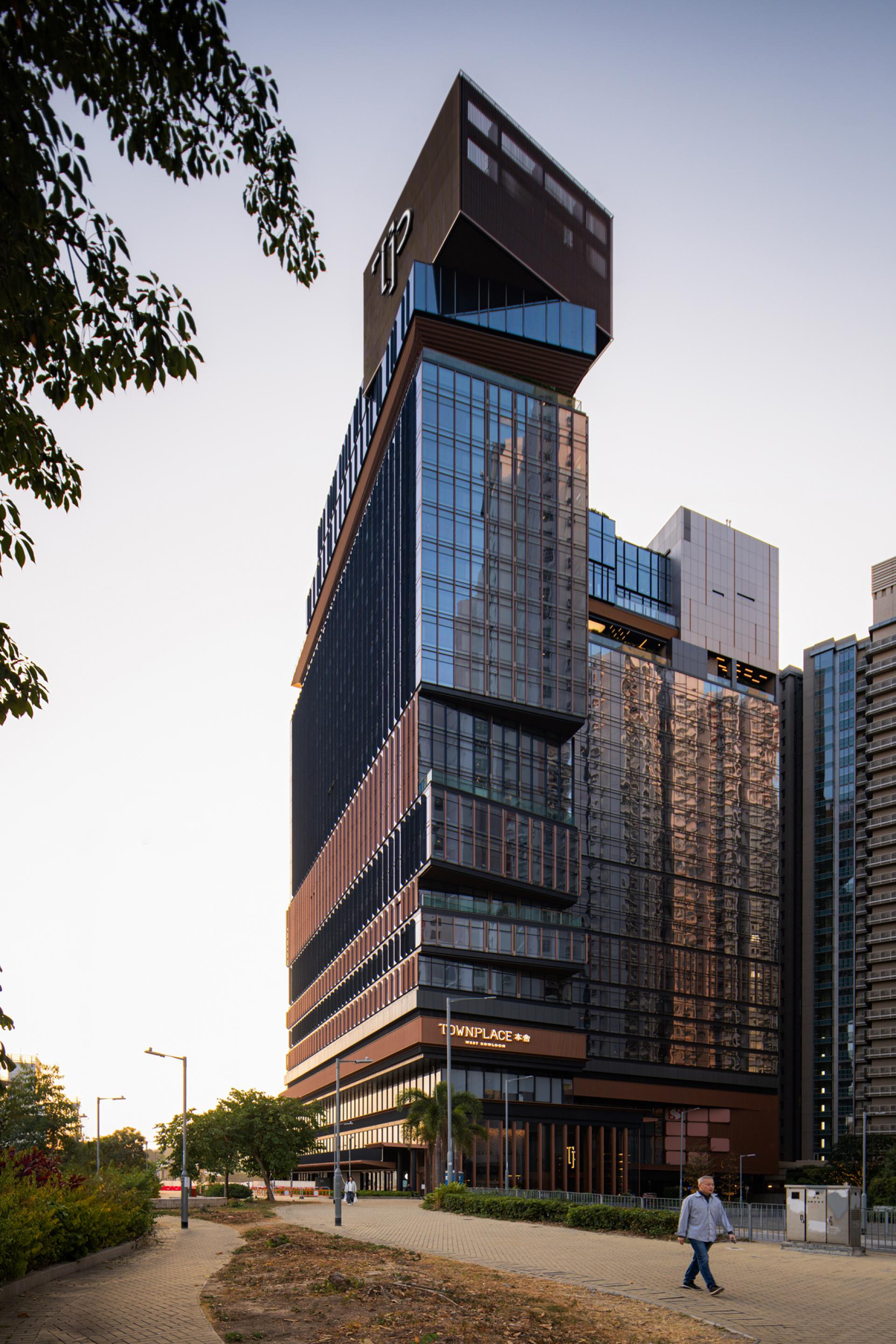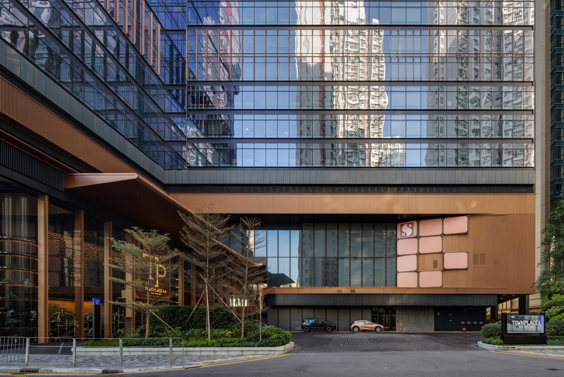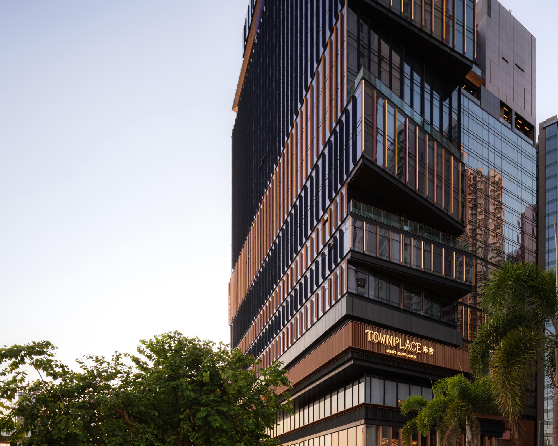 TOWNPLACE West Kowloon is a modern living destination located in Nam Cheong, designed with a promenade concept. The building offers both long-stay hotel services along with recreational amenities to create an interactive community. Its distinctive H-shaped design ensures panoramic sea views, a treat for all residents. The façade seamlessly blends glass panels with copper gold fins, optimizing heat regulation. The 26-storey building connects to the public promenade and F&B area with a greenery landscape that stretches to the tower. The design offers a variety of options, including studios and 1, 2, and 3-bedroom units. The elevated clubhouse showcases a lush sky garden and multi-level terrace, boasting breath-taking vistas of Victoria Harbour. The prominent roof feature, stands as a distinctive landmark in the cityscape, promising a dynamic and coveted living experience.