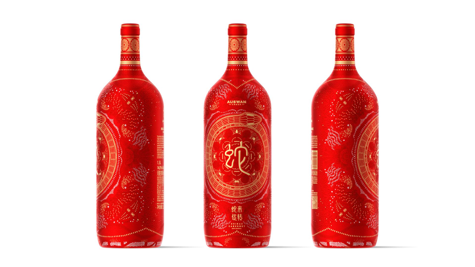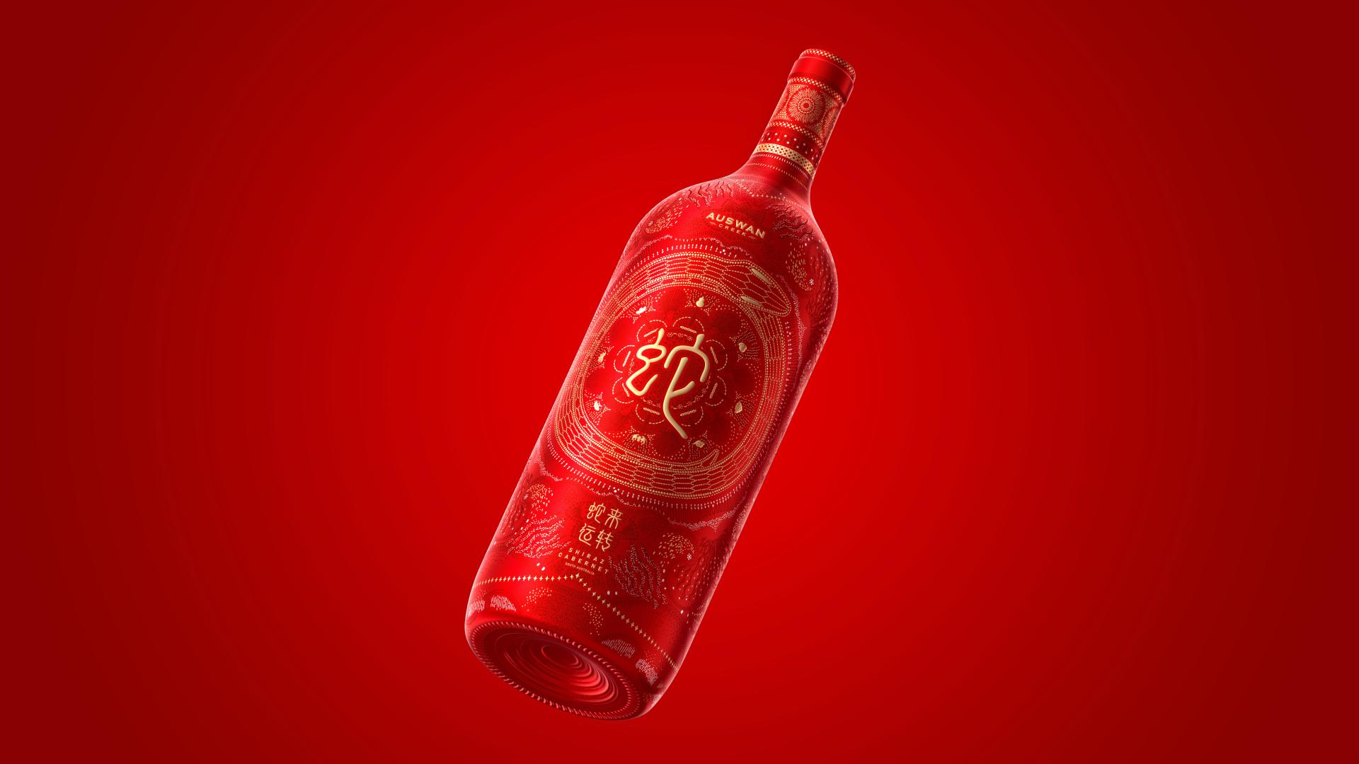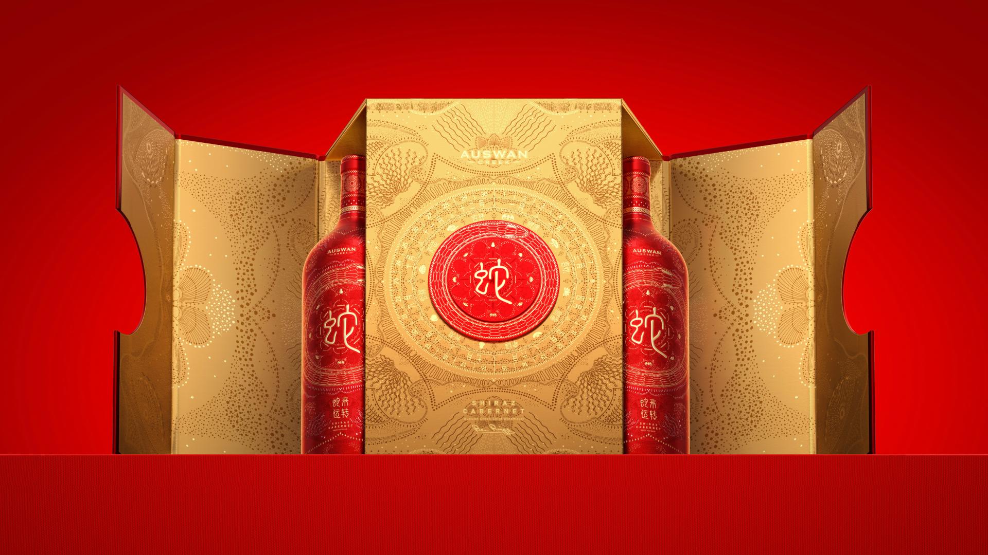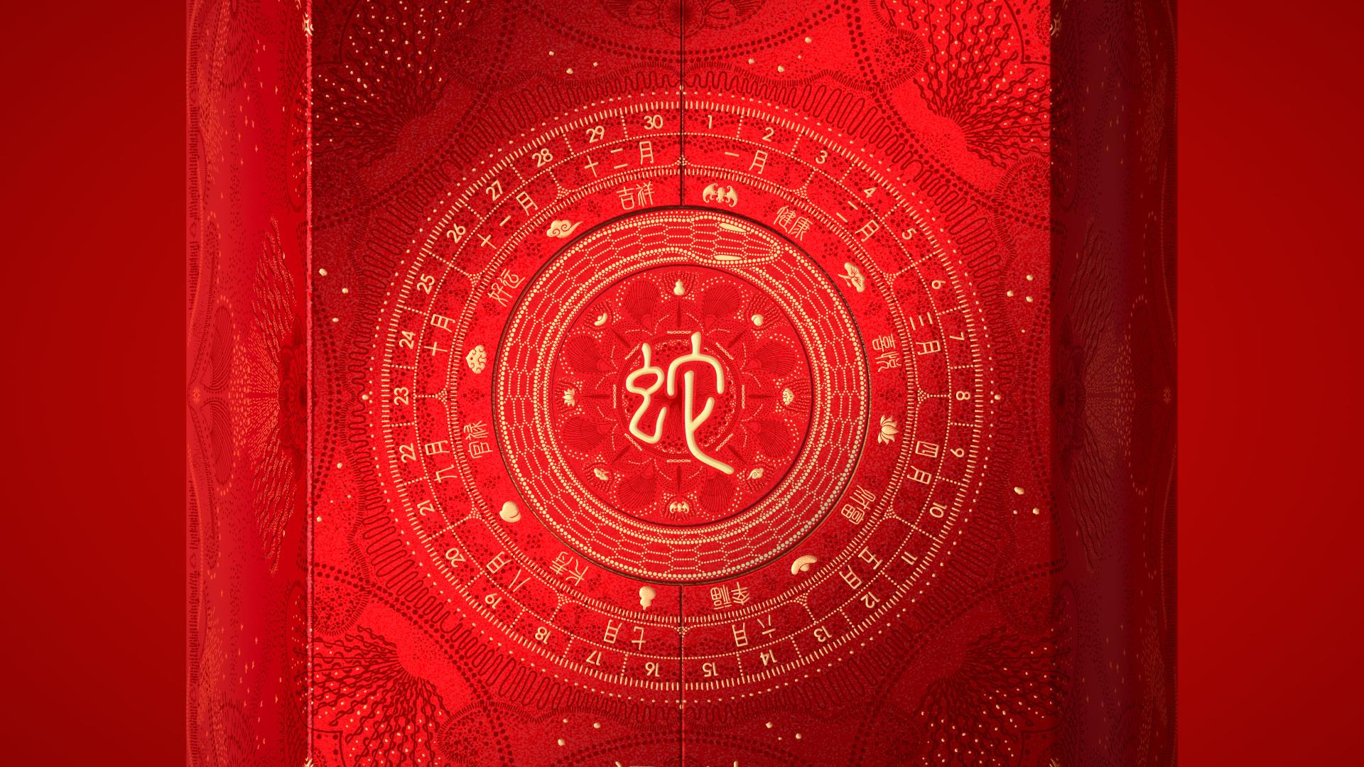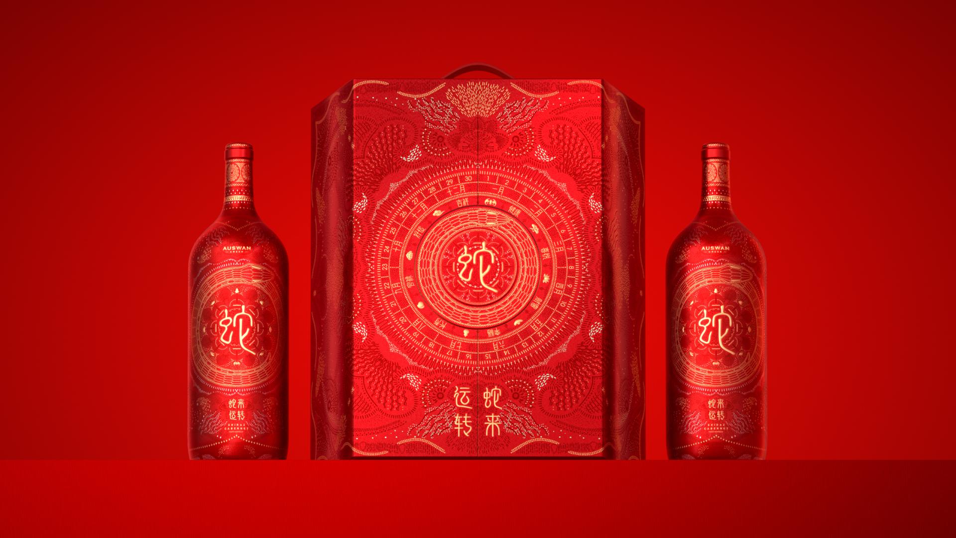 This is a red wine packaging designed for the Chinese Year of the Snake, tailored for festive visits during the Spring Festival. The theme "She Lai Yun Zhuan" (Fortune’s Turn with the Snake) cleverly homophones with the Chinese idiom "Shi Lai Yun Zhuan" (Fortune’s Turn), blending traditional auspicious patterns with a classic red-and-gold color scheme. The outer box features a rotatable "Fortune Wheel" with a serpent-shaped pointer that aligns with 12 months and eight symbolic blessings (e.g., "Wealth in January"), creating a personalized ritual of wishes.