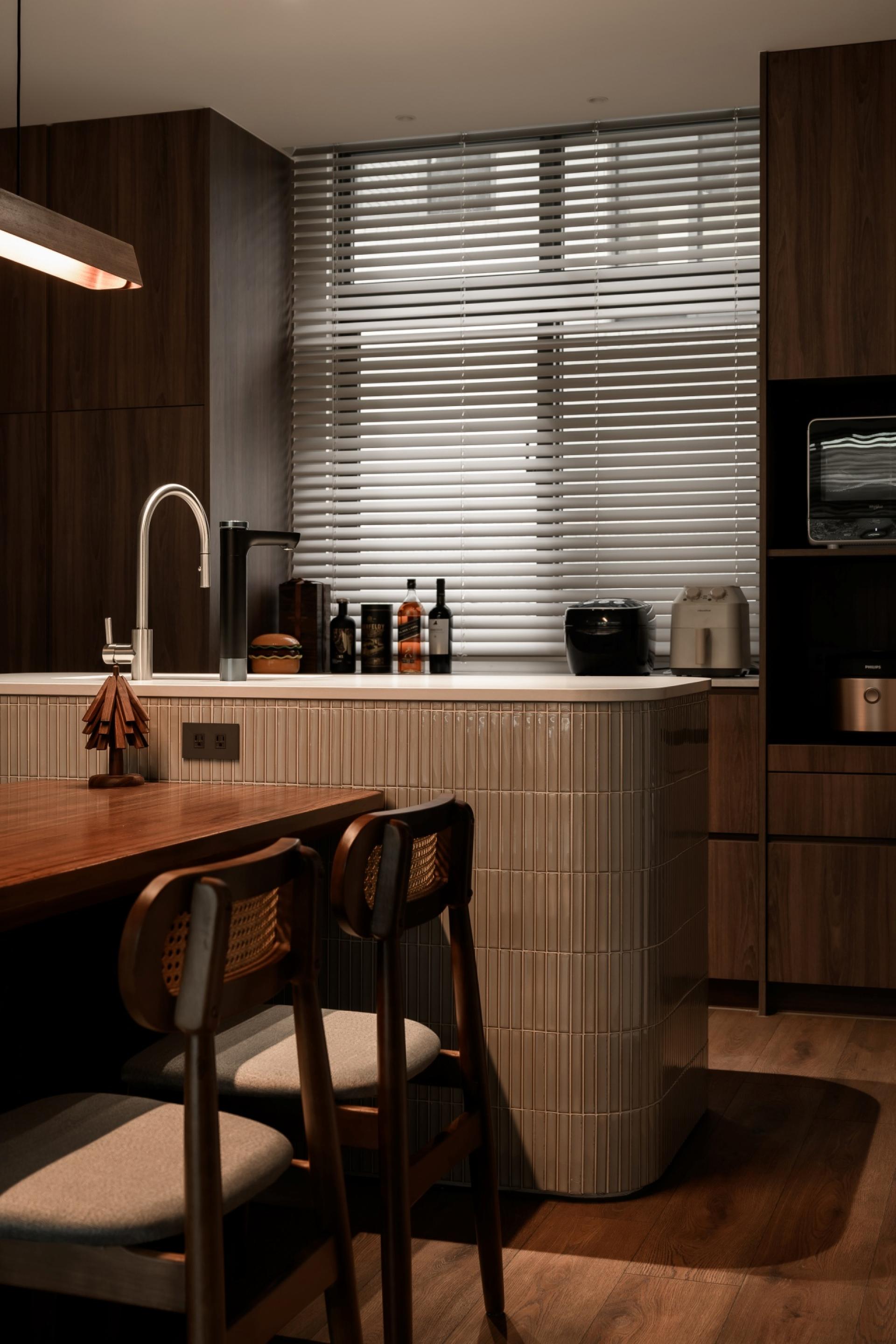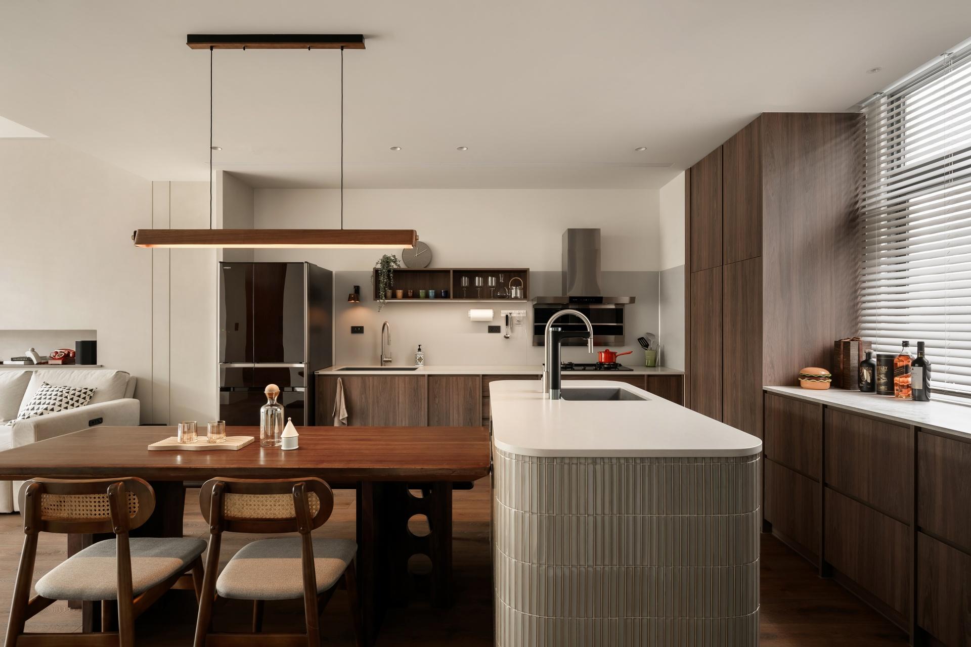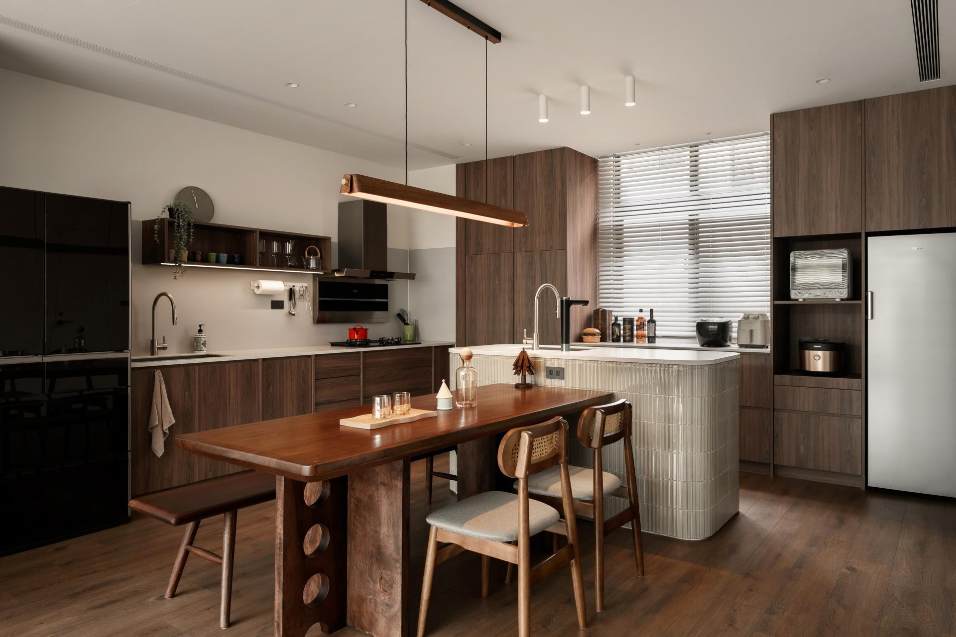 In the dining room and kitchen, the central island with smooth, curved edges creates a soft, welcoming look. Its surface is wrapped in kiln-changed tiles which reveal subtle variations in colors under the interplay of warm and natural light. The natural wooden dining table paired with rattan chairs can create an inviting and rustic dining atmosphere.