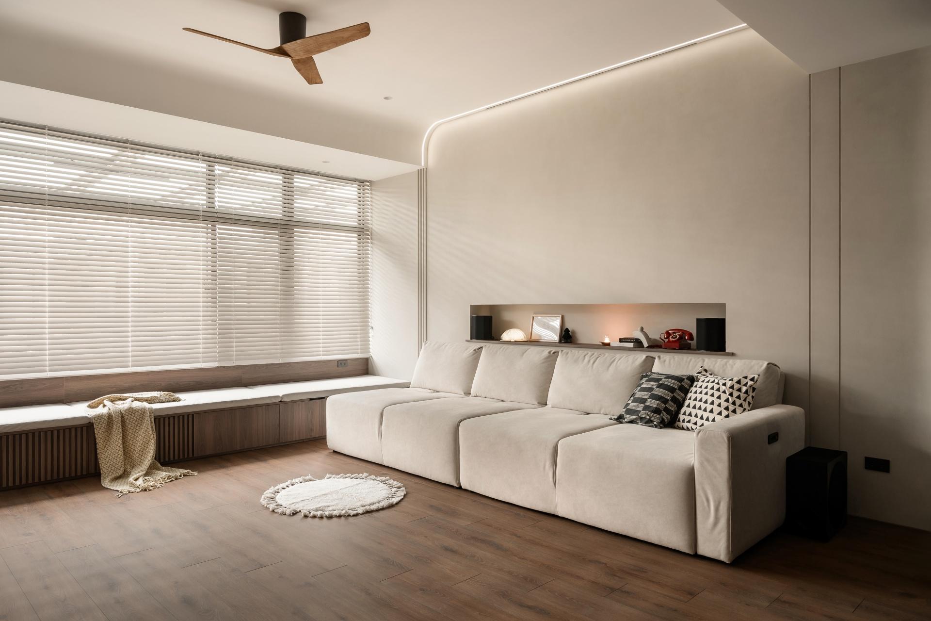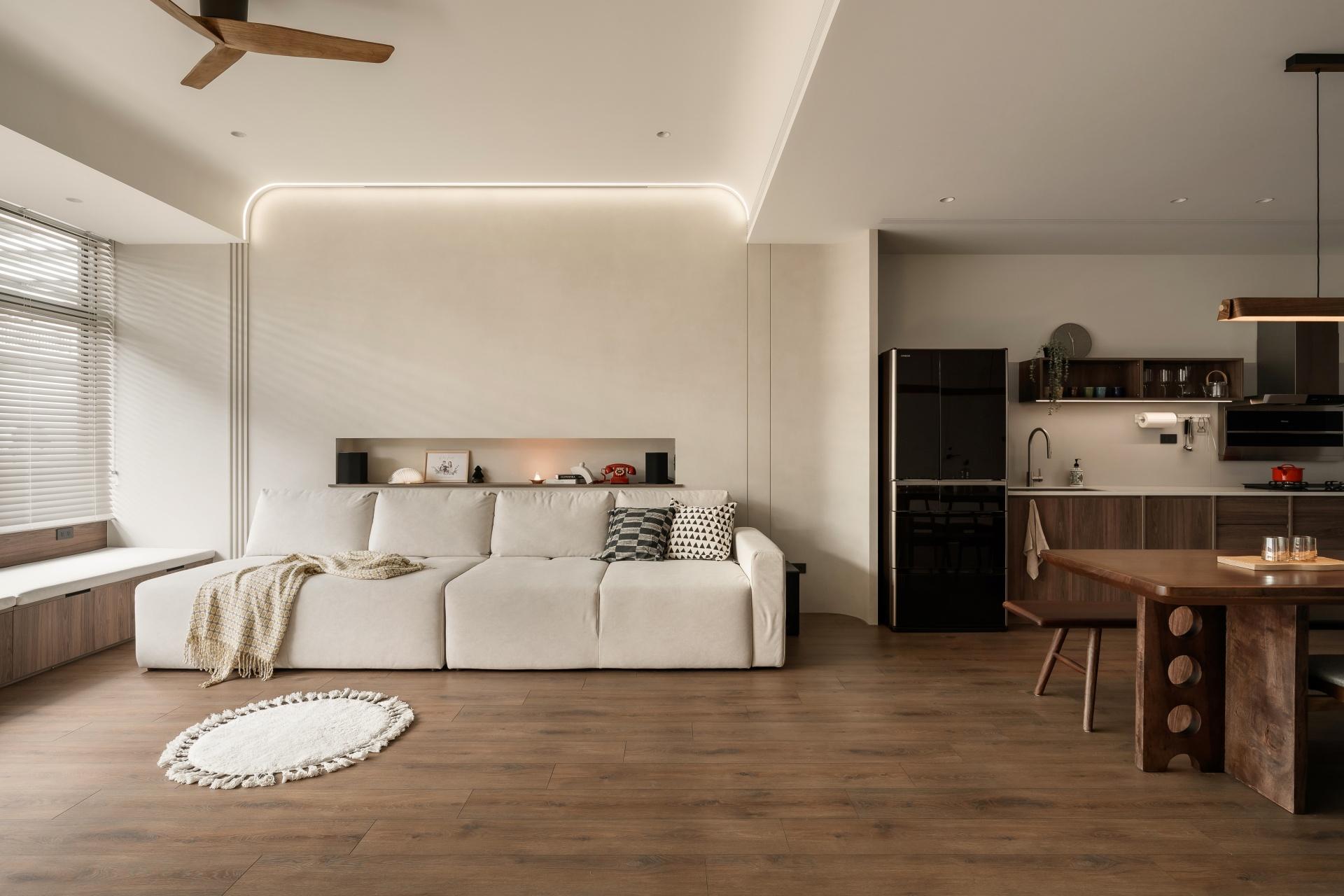 Since the original TV wall is relatively small, the design extends its surface to establish a more cohesive look while discreetly blocking direct views into the living room, enhancing the sense of privacy. A smooth archway unfolds, gracefully offsetting the presence of a low beam while elegantly defining the transition between the entryway and the living room. On the ceiling, curves, with their soft, undulating lines, naturally evoke a sense of calm and continuity, offering a visual and tactile antidote to the sharp edges and straight lines. The LED light strips create a relaxed and pleasant environment. Unlike a protruding shelf, the wall behind the sofa with a recessed niche ensures a clean facade, preserving the simplicity of minimalist aesthetics.