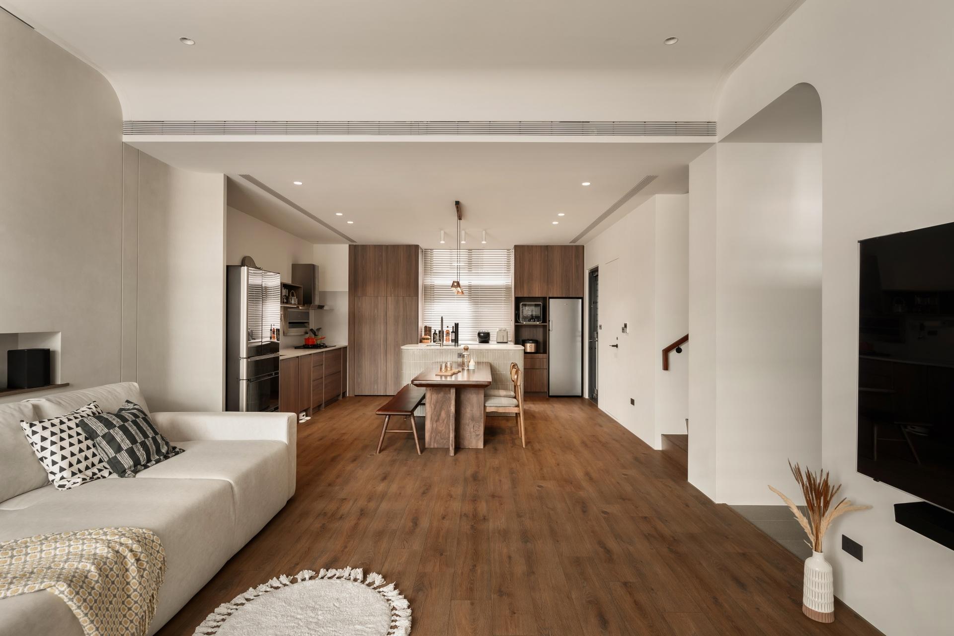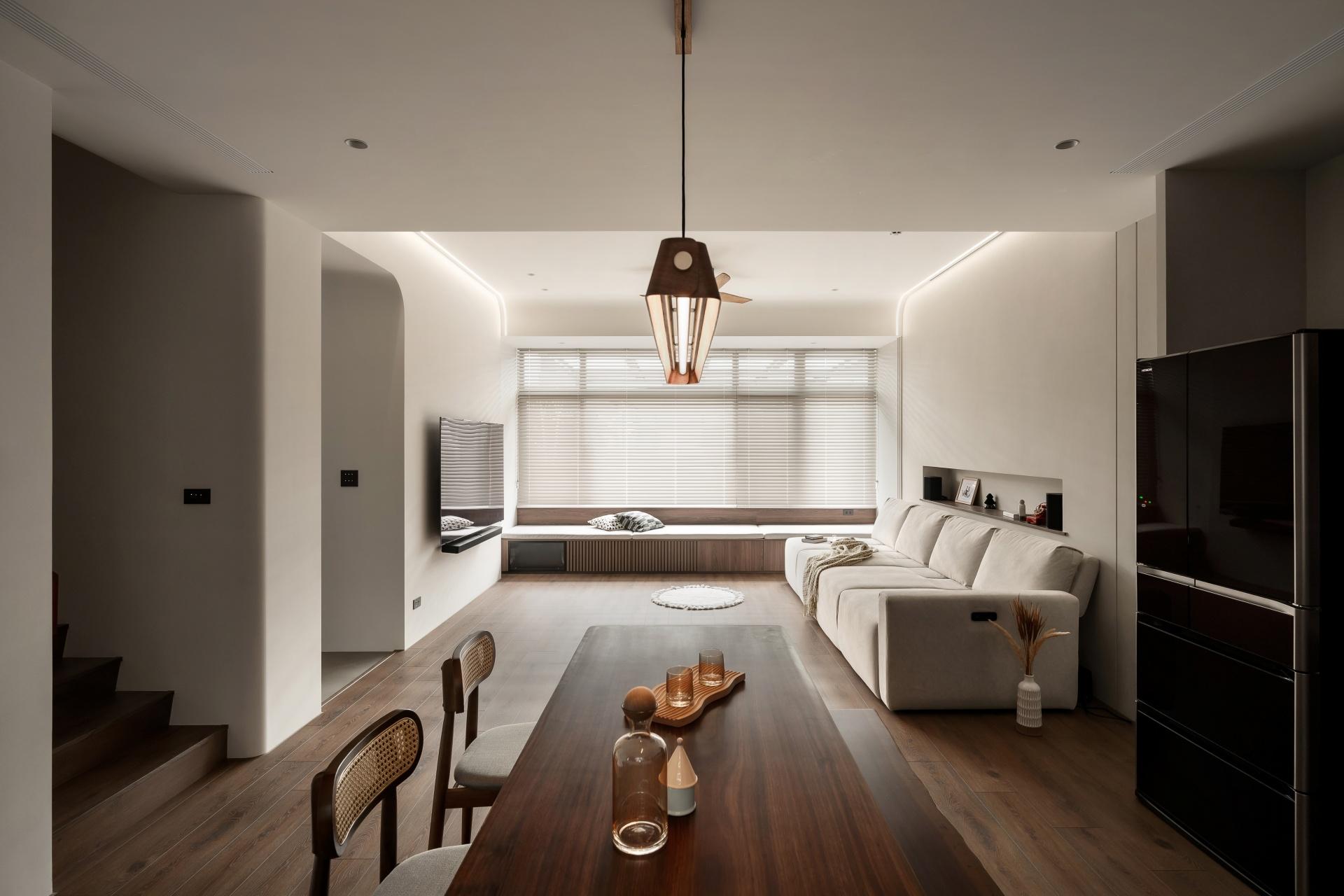 In this three-story residence, a vintage minimalist style sets the tone, complemented by the LED light strips, arched doorway, linear details, and ceiling fan. The dark wooden flooring, an upholstered sofa, and rattan furniture pieces further enhance the serene and restorative ambiance at home. The first floor serves as a communal space, where an open layout not only creates a clear line of sight, but also a smooth passage for movement. To ensure greater privacy, the second and third floors are designated exclusively for private use. Each level is thoughtfully designed to serve a specific function, catering to the homeowner's lifestyle and unique needs.