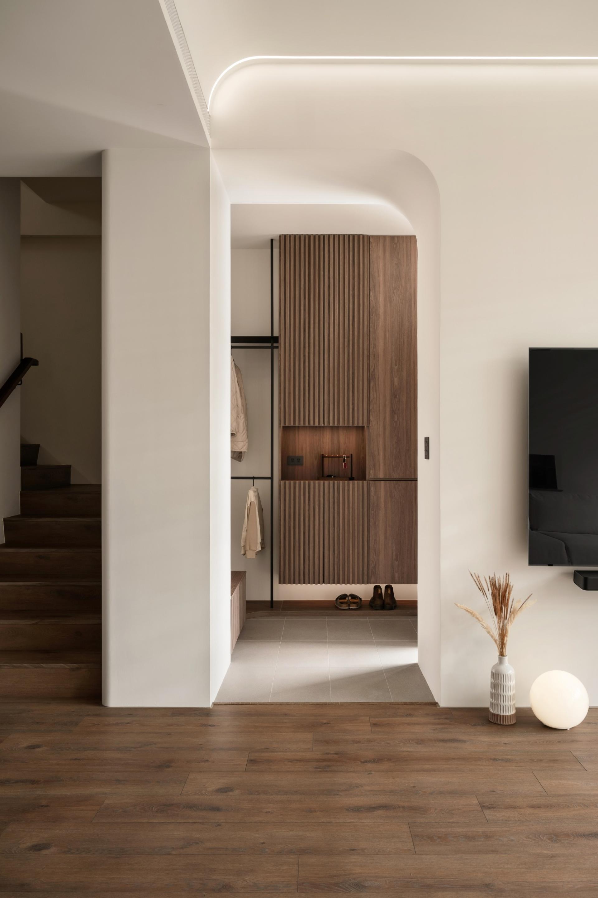Upon opening the door, the gray flooring subtly defines the mudroom, creating a seamless transition from the bustling outdoors to the warm and inviting interiors. A suspended deep brown shoe cabinet reduces the visual weight, while its openwork base extends seamlessly into a built-in wooden shoe bench. The use of consistent materials effectively fosters a sense of flow that gently guides the eye inward.