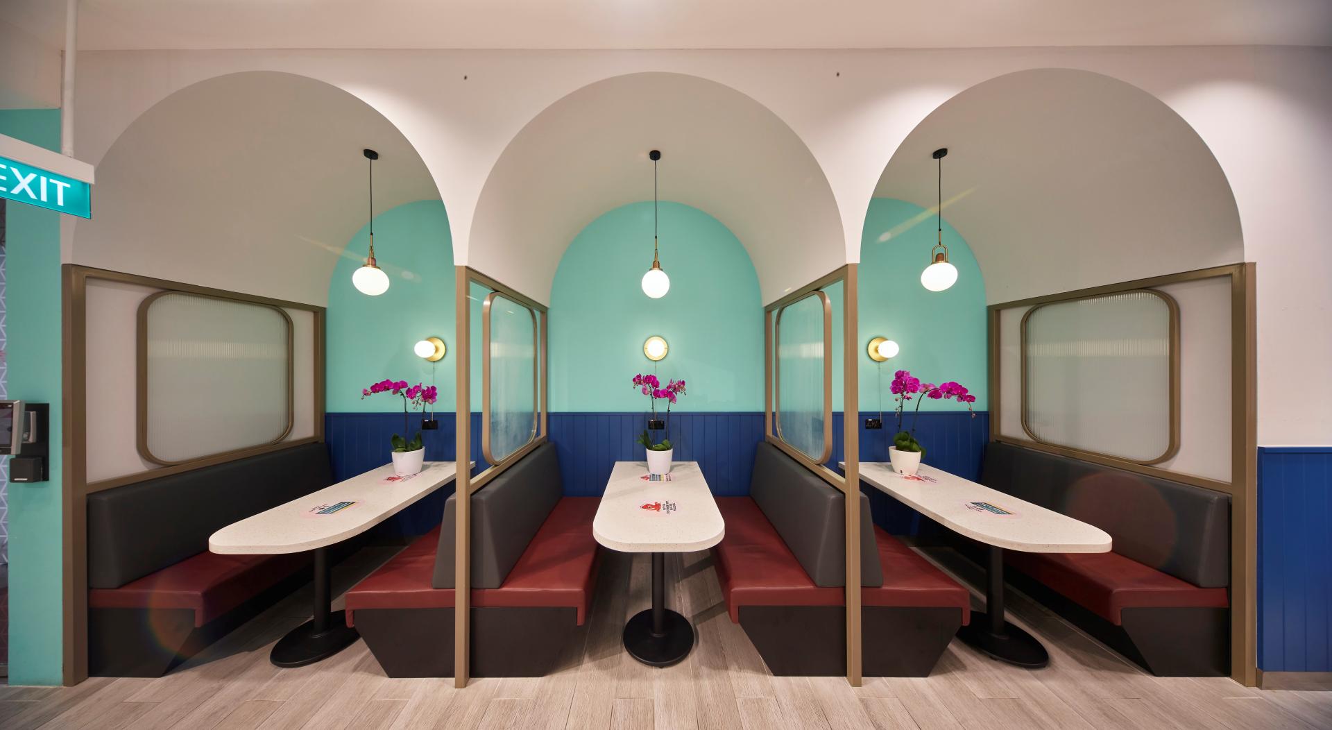 Inspired by Parisian café culture, the e-Café features varied seating options to accommodate different needs. The open dining area includes bistro-style seating and café banquettes, perfect for casual meetings or larger town hall events. Private booths, designed with curved arches and gold frames, offer a sense of exclusivity for intimate discussions or focused work. The design palette combines modern light greens and soft blues, establishing a soothing yet contemporary atmosphere that aligns with CIMB’s brand.