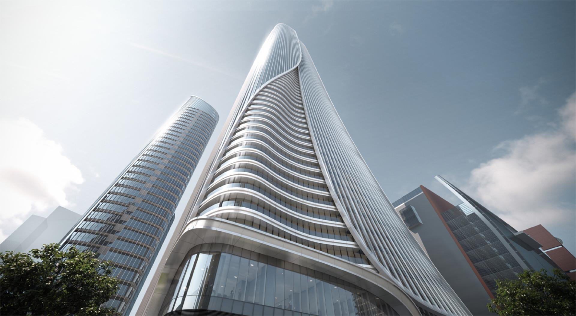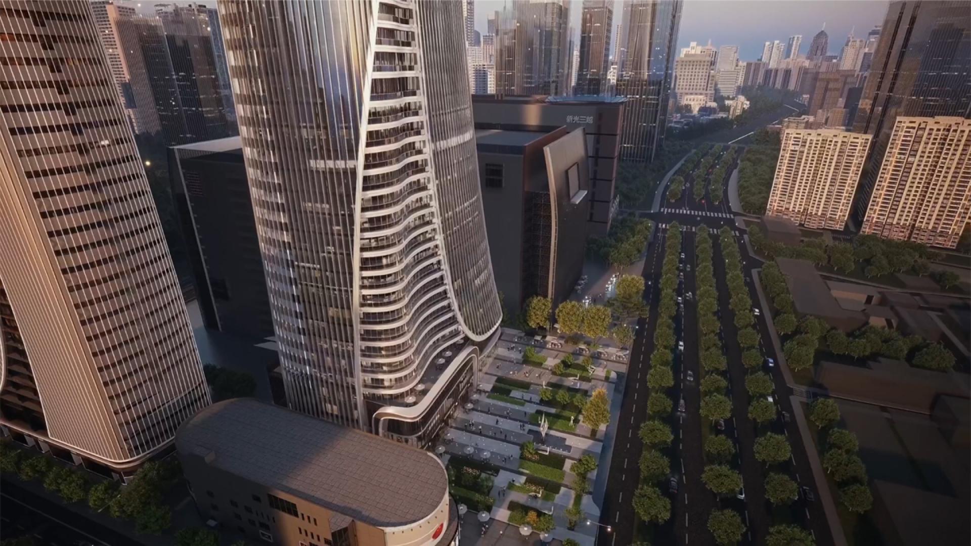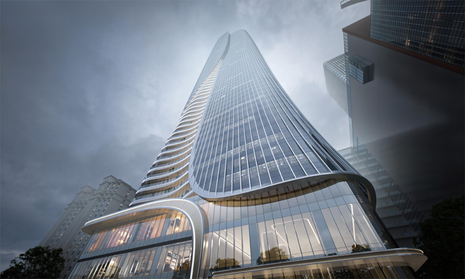 Drawing inspiration from the poetic imagery of mountain waterfalls (“A silver cascade plummets from the heavens”), the design features a sleek, curved silhouette with rounded corners. Its silver-gray glass façade, accented by vertical mullions and gradient calligraphy-inspired edges, mirrors the sky while evoking cascading water. The tower’s four subtly varied facades create dynamic street-level perspectives, ensuring a memorable identity from every angle. The north elevation, facing Taiwan Boulevard, showcases a sculptural interplay of overlapping curved panels and terraced balconies, resembling a waterfall split by rocks. The south façade, oriented toward the CBD, employs softer curves to harmonize with its business-centric surroundings.