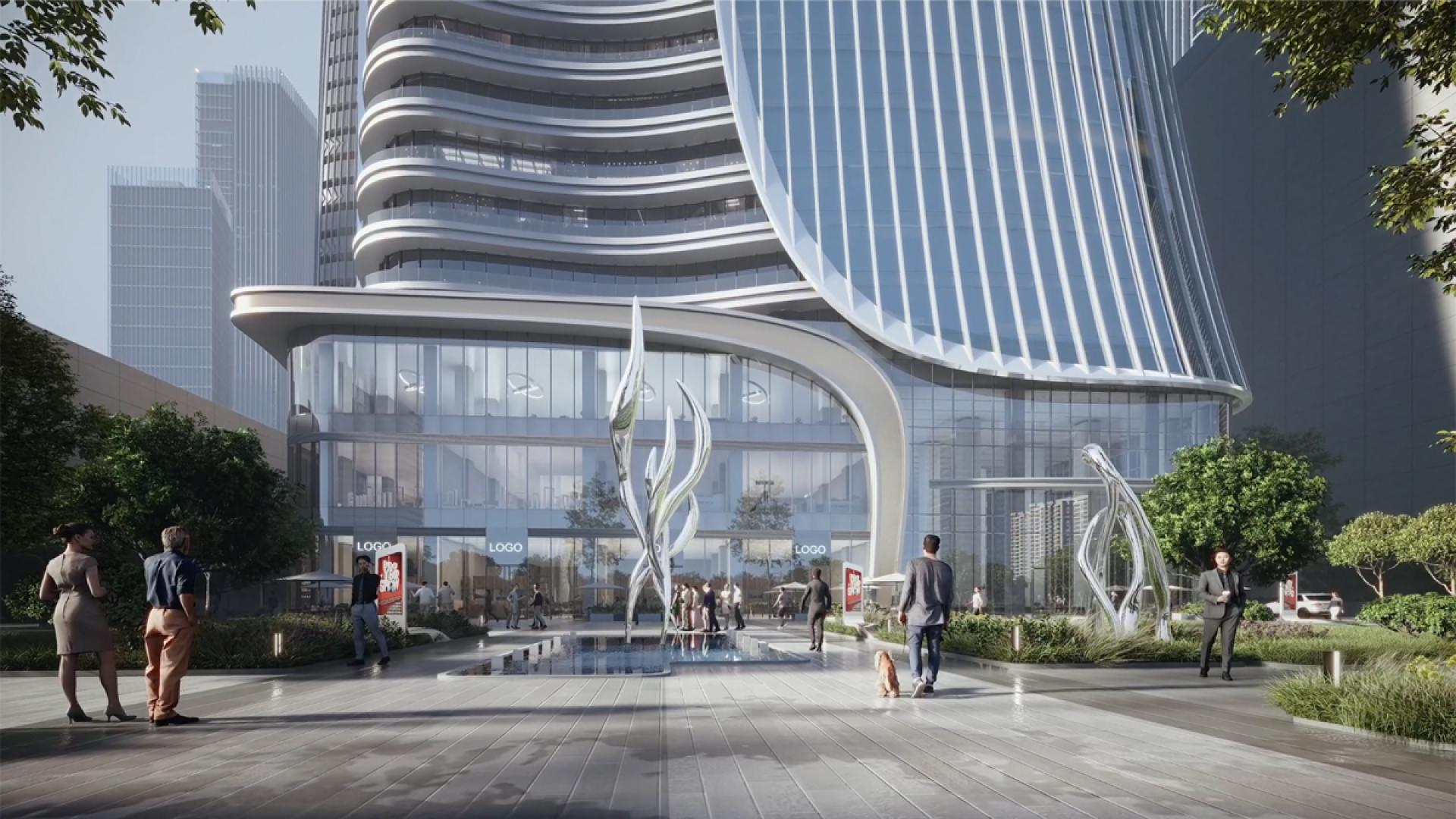 Functionally, the tower integrates ground-level retail spaces with upper office floors, each with dedicated entrances to ensure operational efficiency. A triple-height office lobby, clad in champagne gold metal and stone, offers a luxurious arrival experience. Landscaped plazas with linear patterns guide pedestrian flow, enhancing urban connectivity and visual coherence.