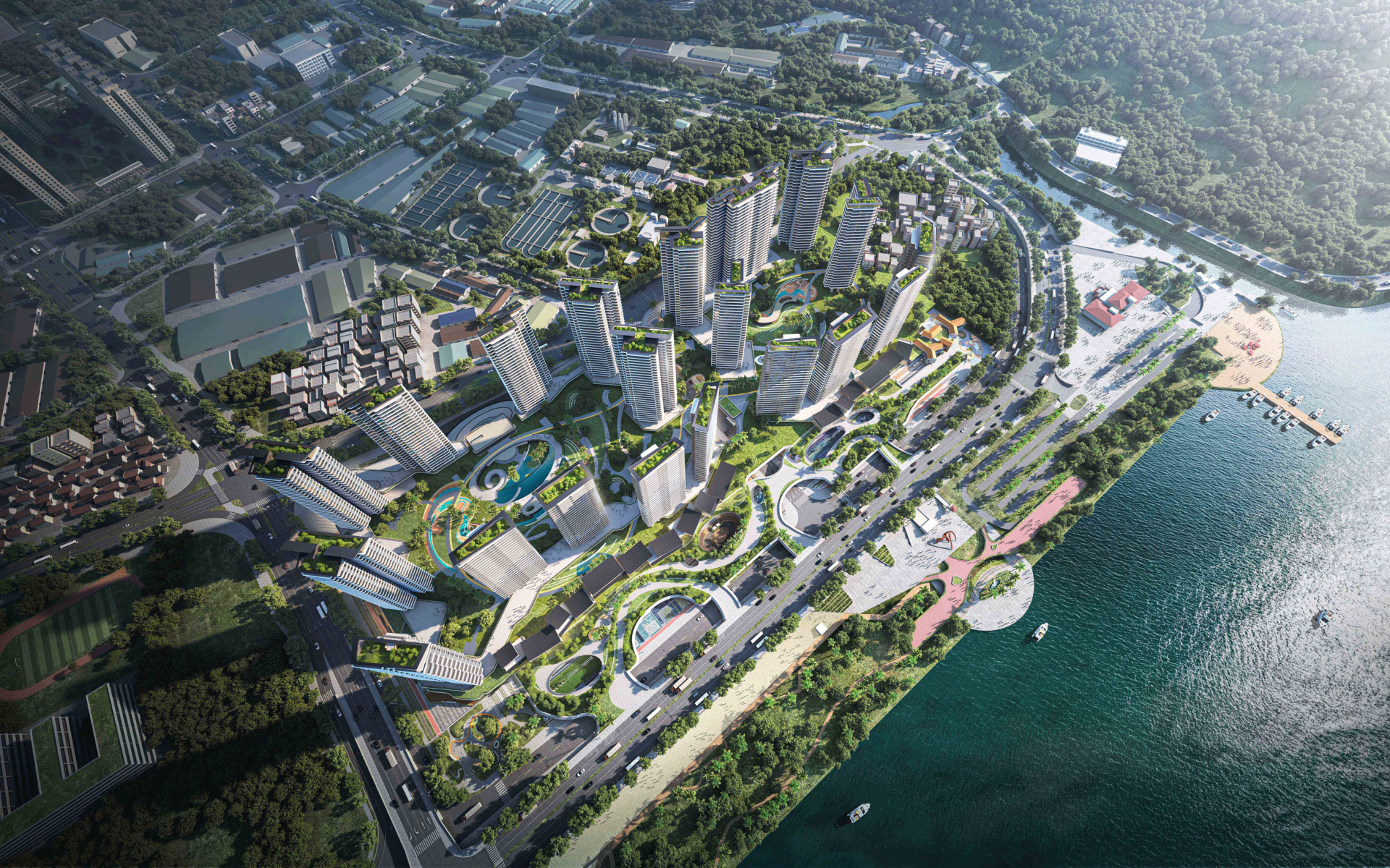 1.Stitching Urban Spaces: Drawing inspiration from Boston's Emerald Necklace, the West River is utilized to connect urban public spaces, creating a significant city-level public space node along the Zhaoqing riverside.