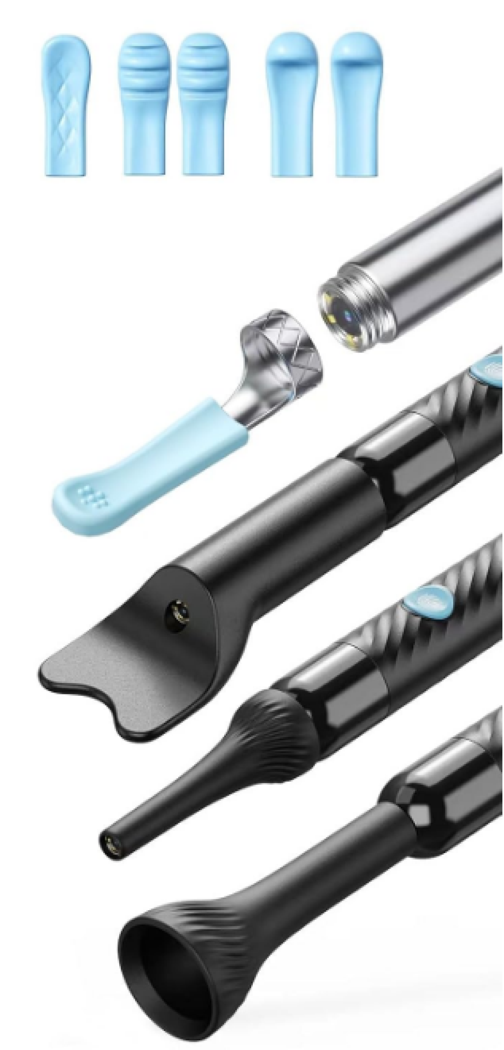 The device features a streamlined body design with a matte, non-slip texture, balancing a futuristic look with comfortable grip. The interchangeable silicone ear scoop covers are color-coded (blue/pink/transparent) to distinguish their functions, providing an intuitive user experience. The IP67 waterproof casing is seamlessly integrated, with the lens and ear scoop designed as a single unit to minimize redundant parts. The simple appearance makes it easy to clean, and it is well-suited for both modern home and travel settings.