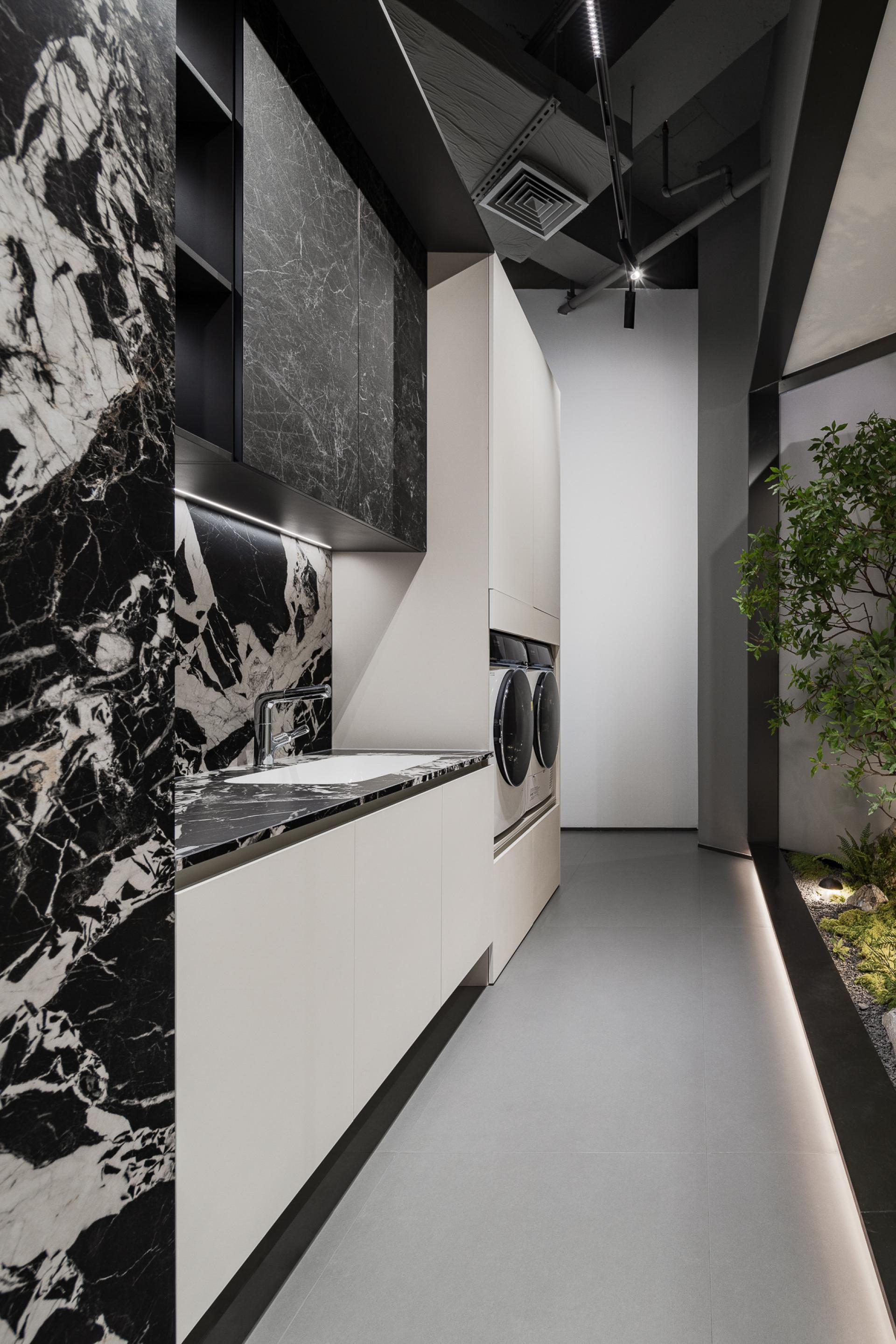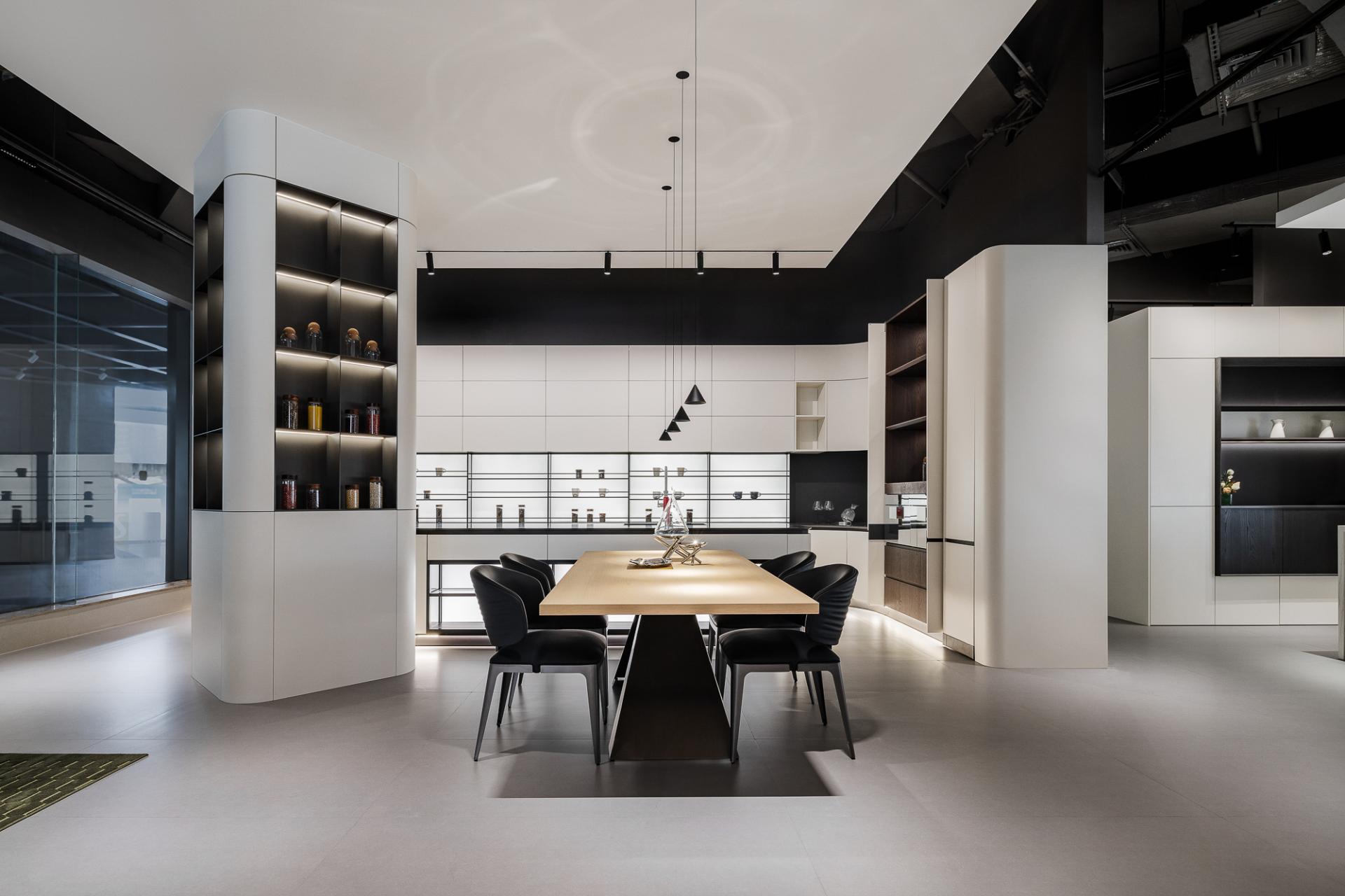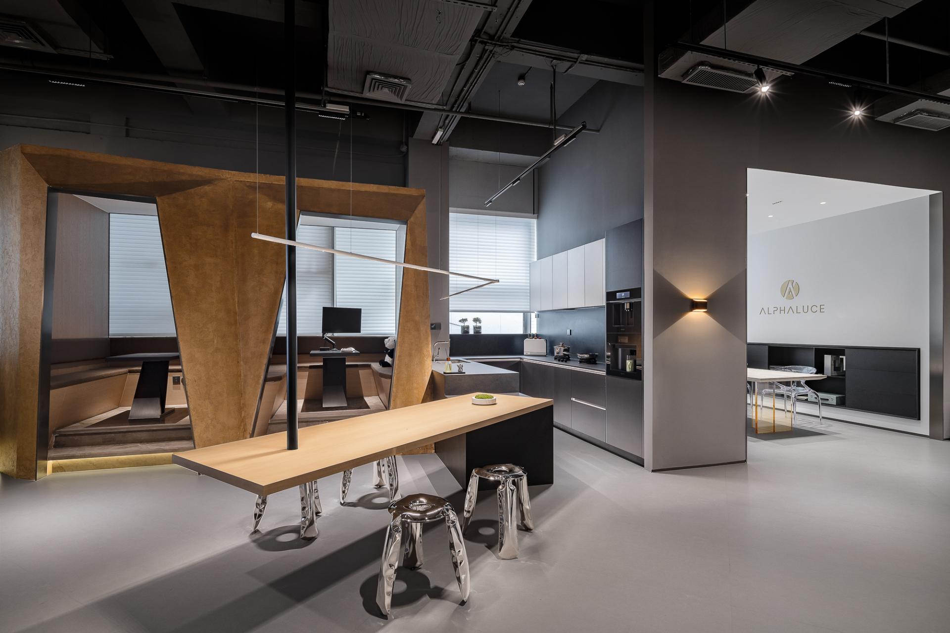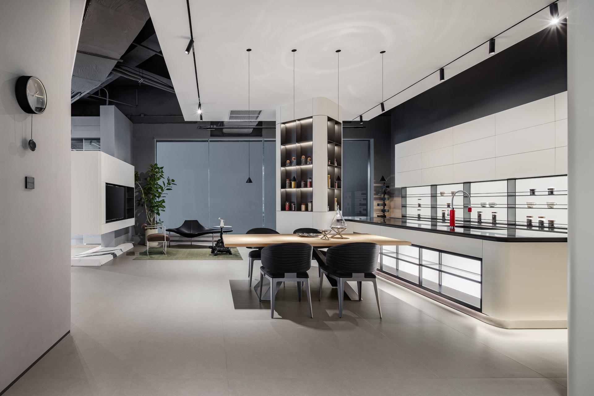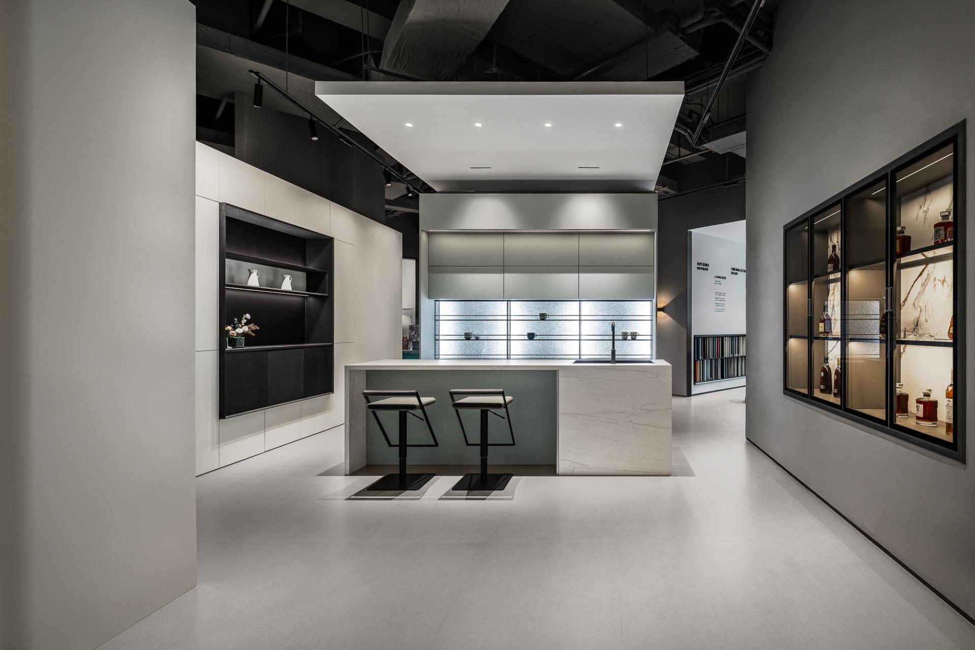The designers from Homu Space Design have broken away from traditional functional layouts and skillfully designed the visiting circulation route. They have artistically integrated the beauty of metal folding lines into the interior space and used the ruggedness of "mountain and stone" elements to highlight the elegance and delicacy of the furniture. This approach perfectly blends aesthetics with practicality. With "creativity, trendiness, and visual appeal" as the core, they have crafted a new image for Aibetter's "high-end integrated kitchen cabinets" showroom. A refined, high-quality, and tasteful living space is vividly presented.