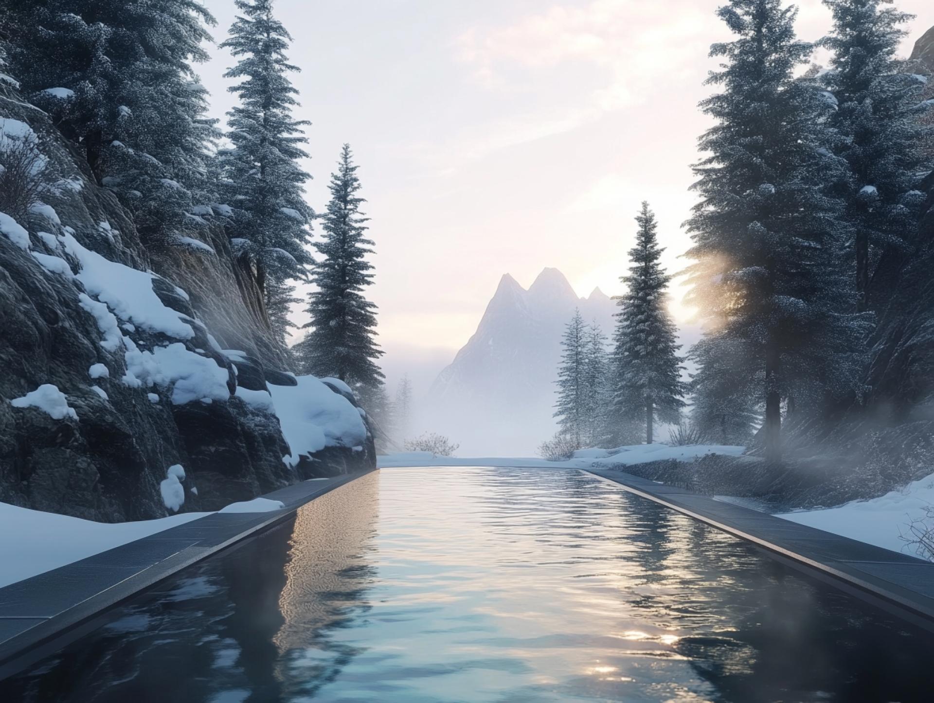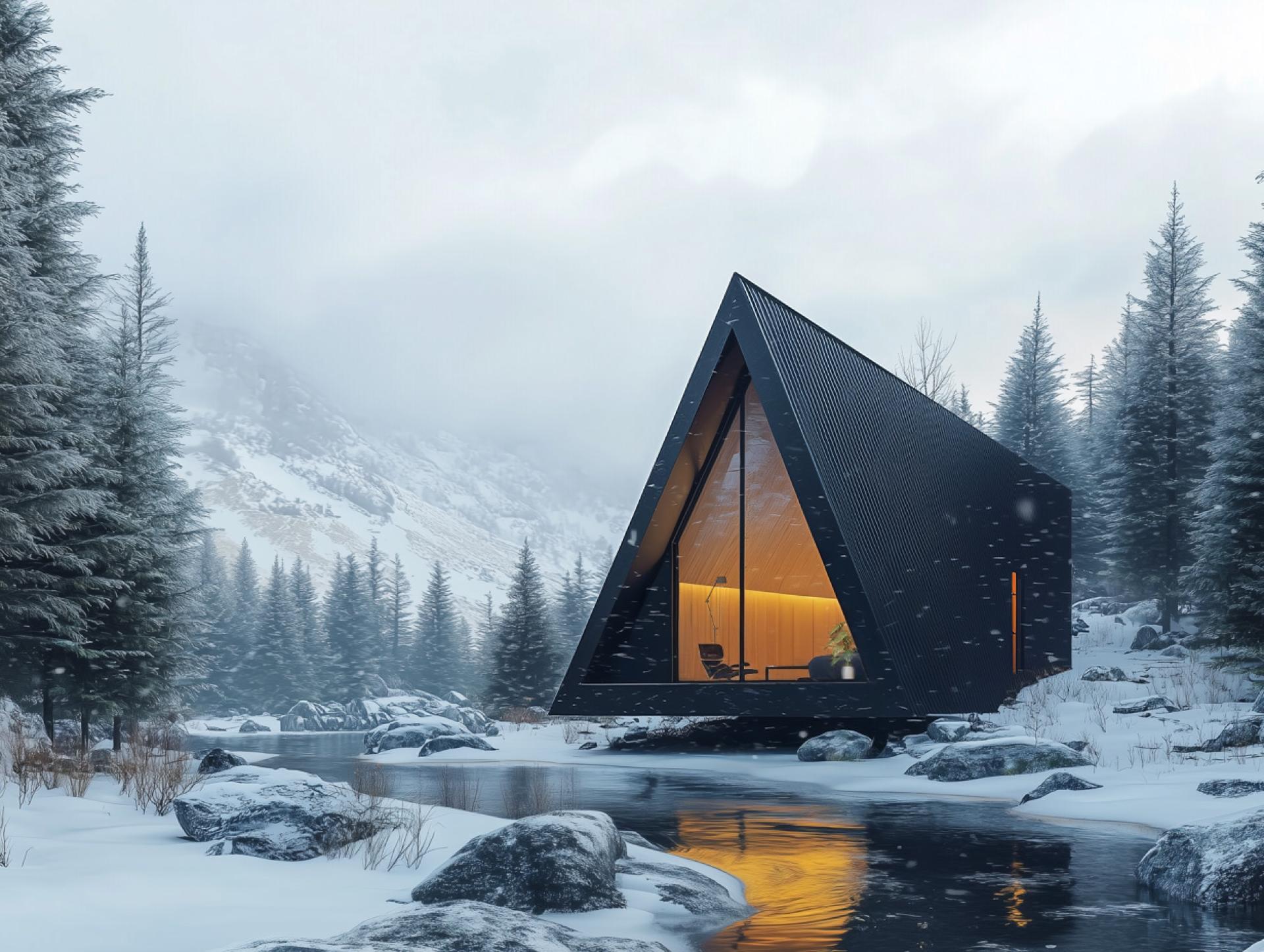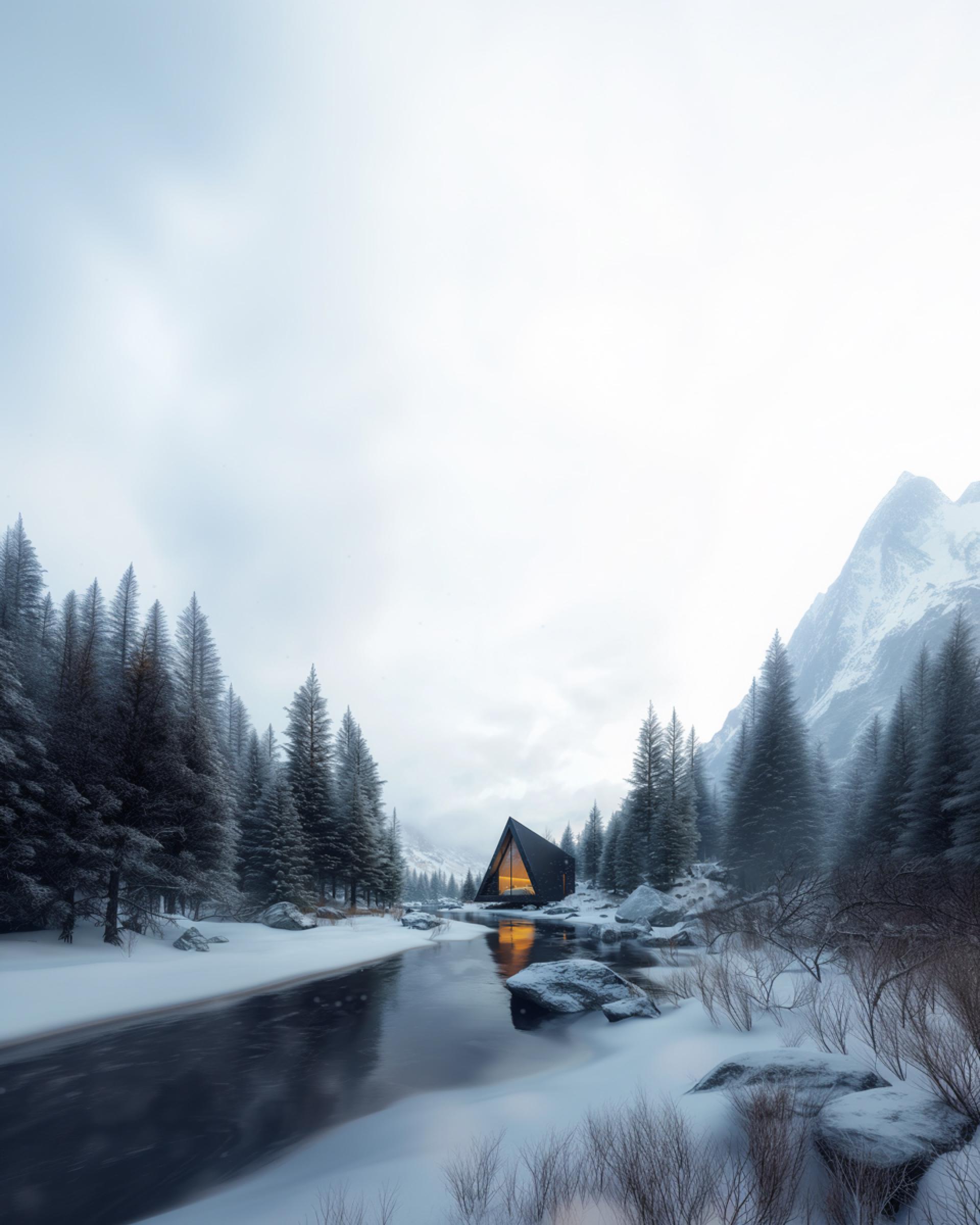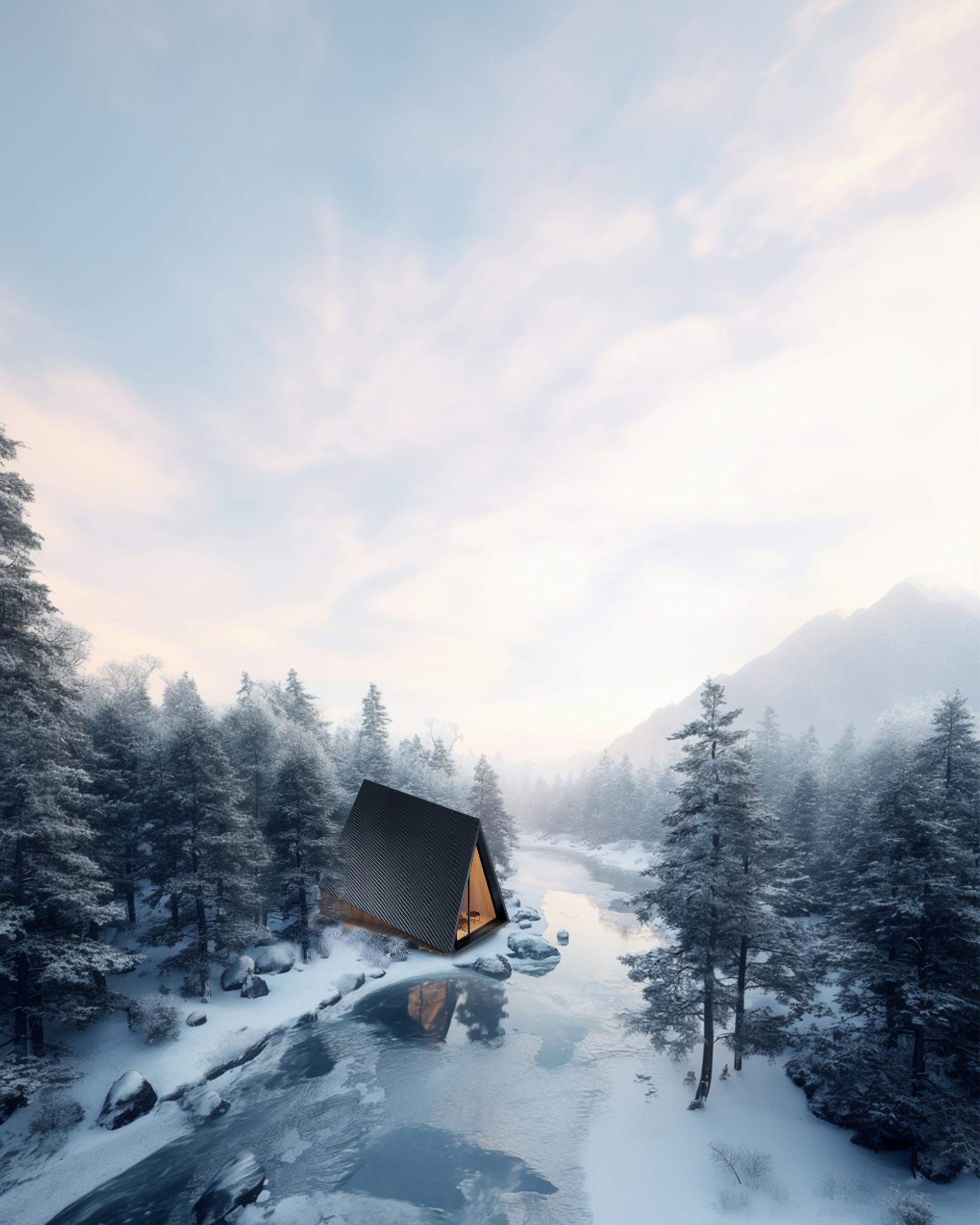 A winding river in the foreground enhances the project’s sense of place, reinforcing its connection to the landscape. Snow-covered evergreens surround the cabin, acting as natural wind barriers while strengthening its environmental integration.