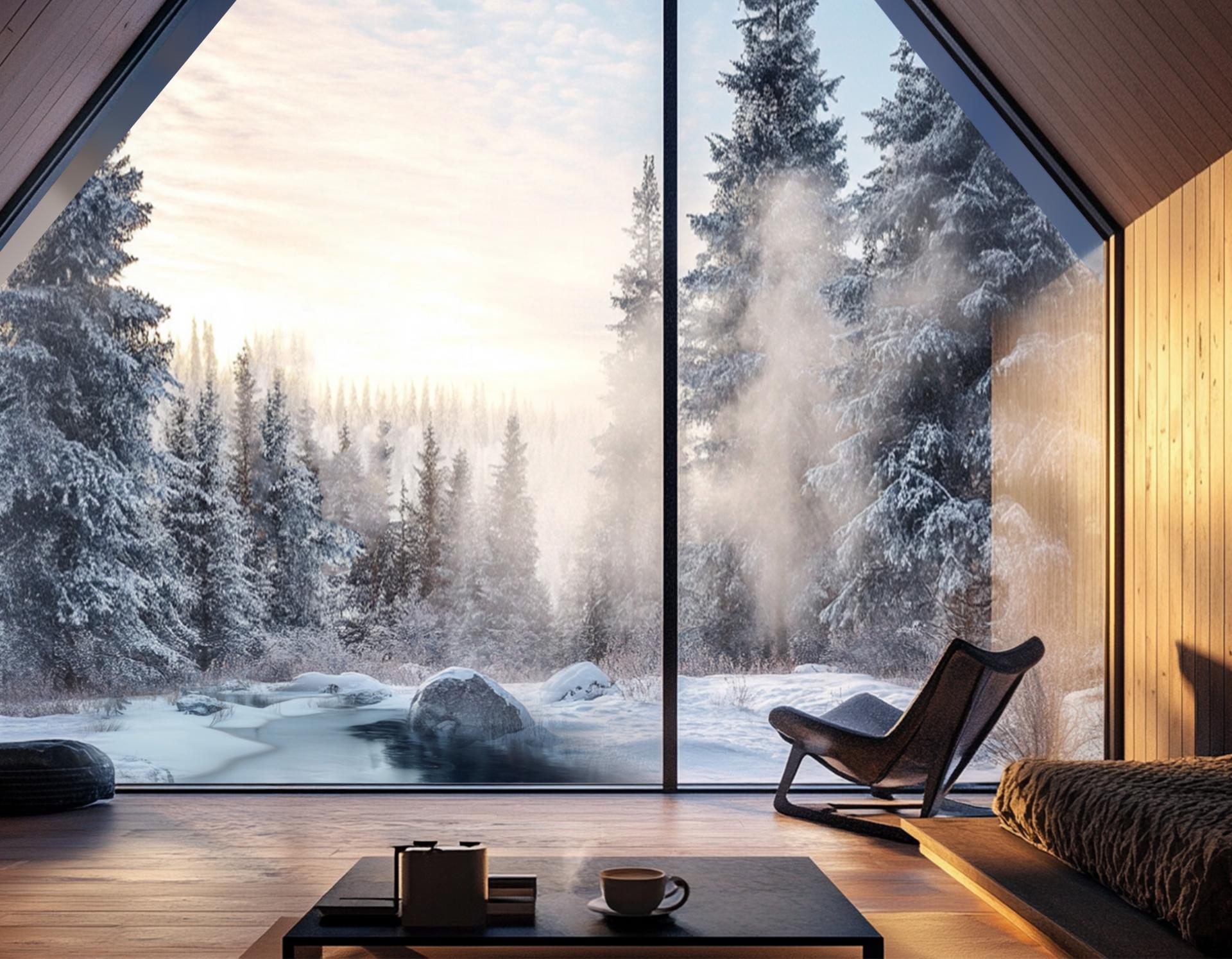 Expansive floor-to-ceiling glass windows frame breathtaking views of the snow-covered forest and a winding river, seamlessly integrating the indoors with the surrounding landscape. These high-performance glazed surfaces optimize passive solar heating, reducing energy consumption while maximizing daylight penetration and panoramic visibility.