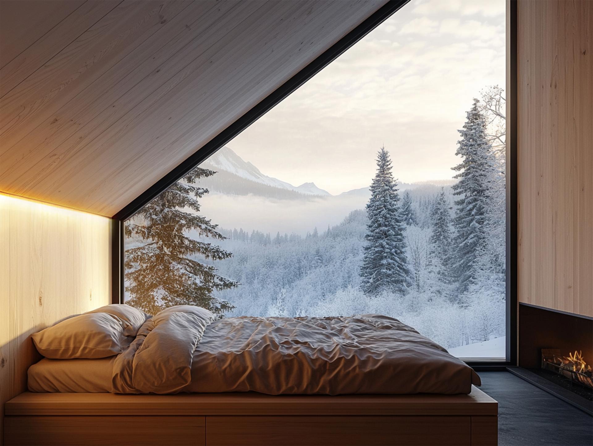 The minimalist interior prioritizes comfort and sustainability, featuring modern lounge chairs, a sleek coffee table, and warm ambient lighting that cultivate a sense of retreat and relaxation. Finishes include sustainably sourced wood paneling, high-performance insulation, and an energy-efficient heating system, ensuring a reduced carbon footprint while maintaining a refined, luxurious atmosphere.