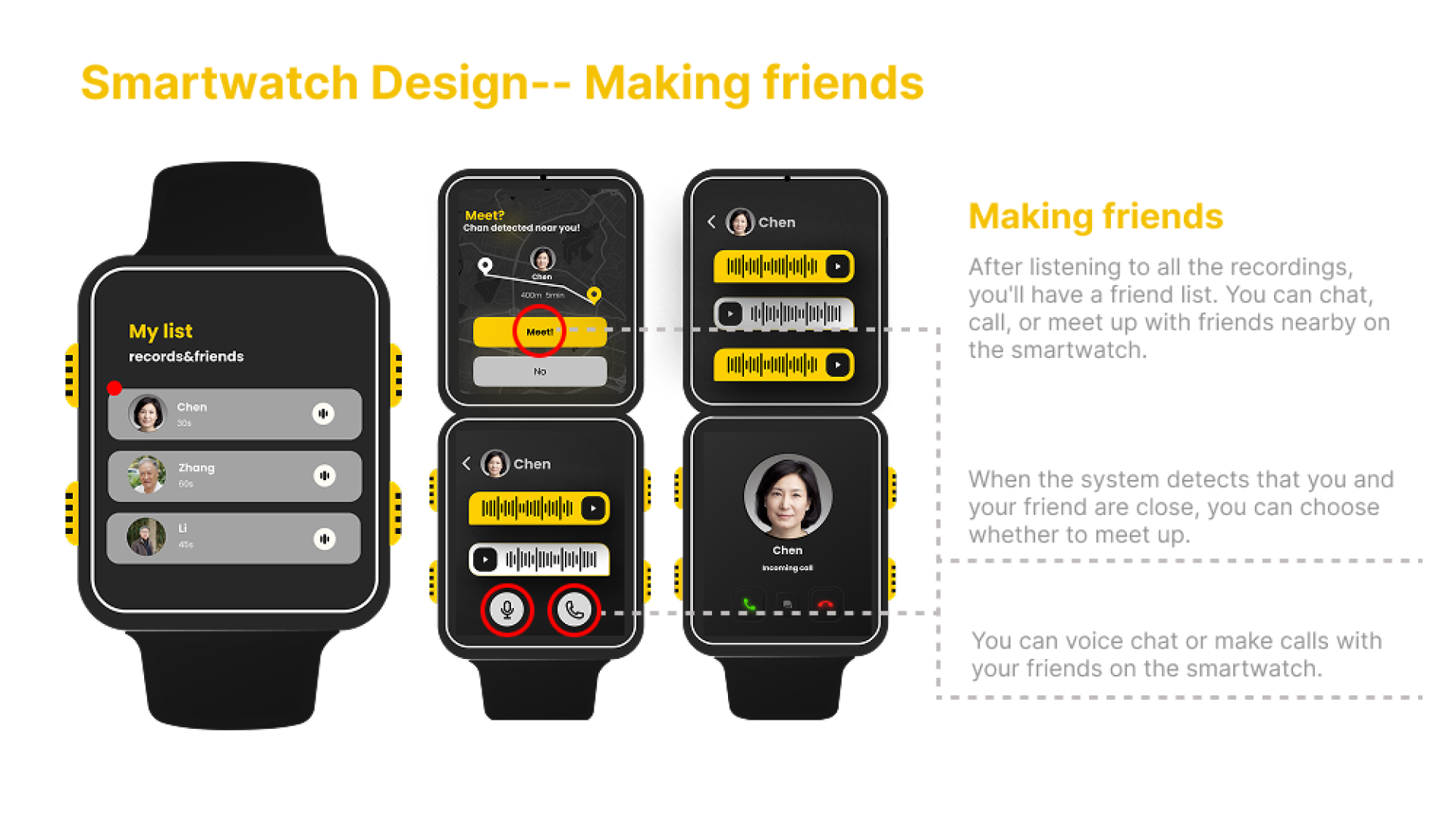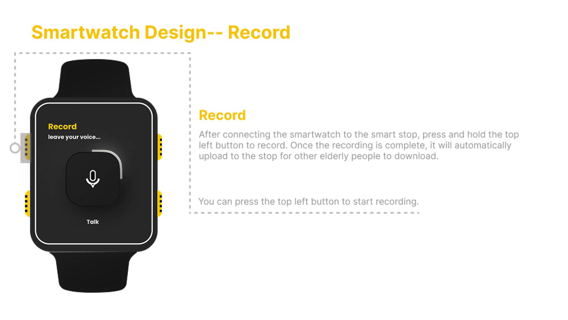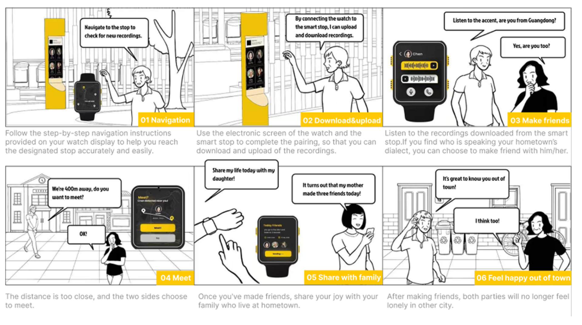 The design includes three key elements: a Smart Stop, a Smartwatch, and a Family App. The Smart Stop is a physical station where elderly people can upload and download dialect recordings, facilitating social connections with others who speak the same dialect. The Smartwatch enables the elderly to record and share their voices, connect with others, and receive updates from their family. The Family App allows family members to stay informed about the elderly's activities and emotional well-being.