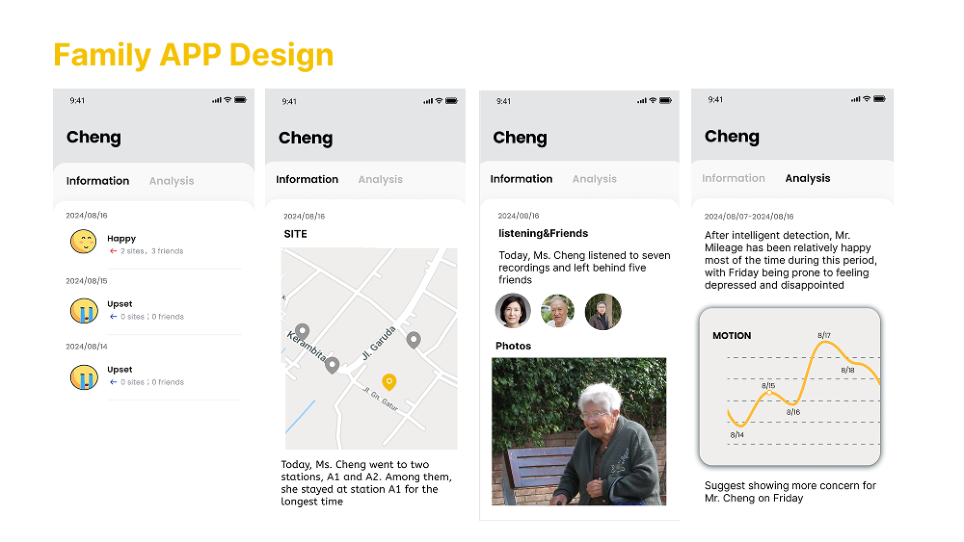The app gives insights into the elderly’s social interactions, location, and well-being, fostering a sense of connection with their family.