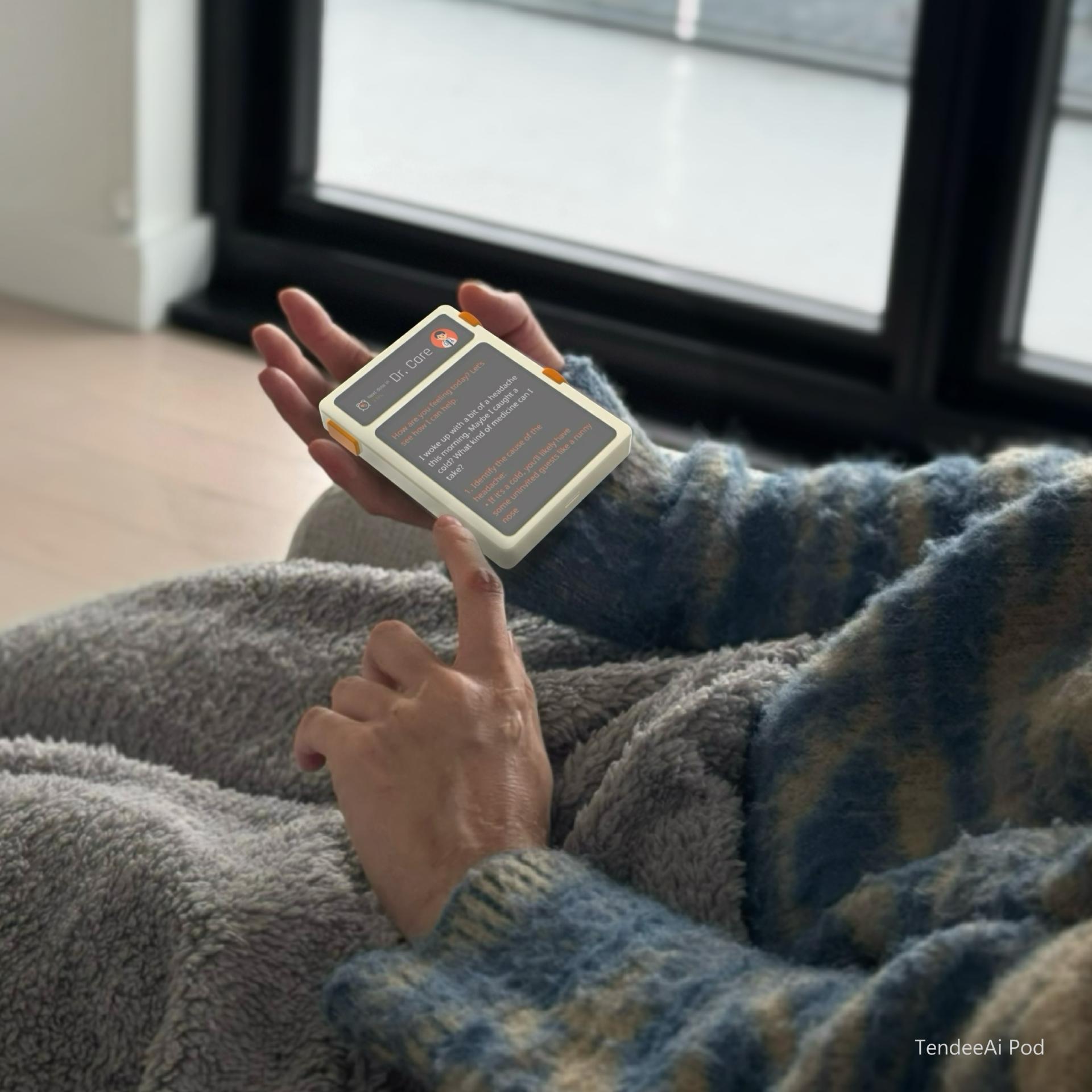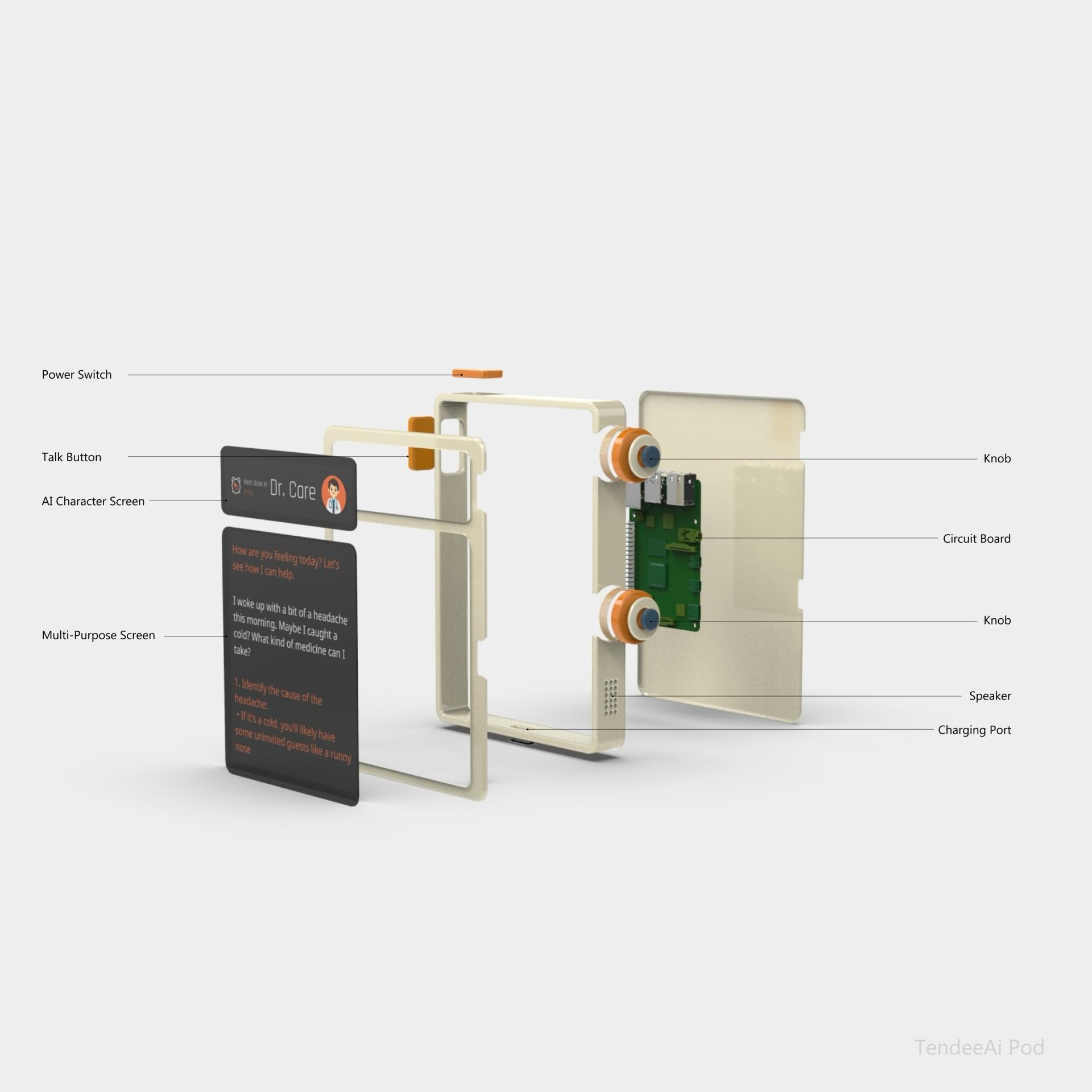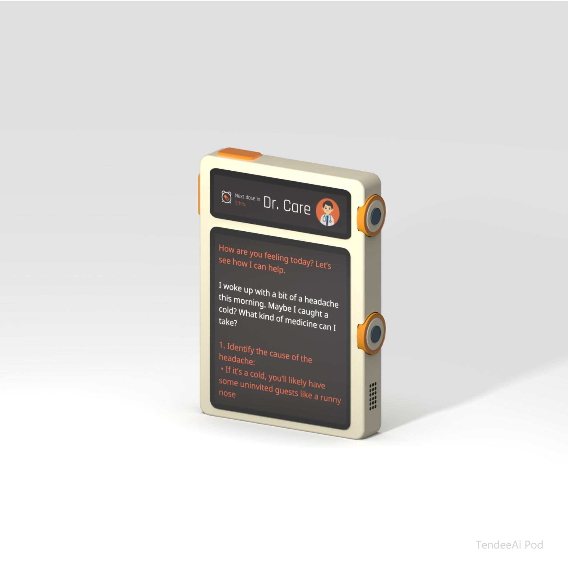 Existing senior mobile phones pose learning challenges due to complex interfaces. TendeeAi Pod solves this with a minimalist design that enhances accessibility, independence, and quality of life. It features a knob to switch between AI personas. Each persona assists with daily tasks such as cooking, health management, and transportation. Its design and communication style align with seniors' cognitive and language patterns, making AI technology more intuitive and user-friendly.
