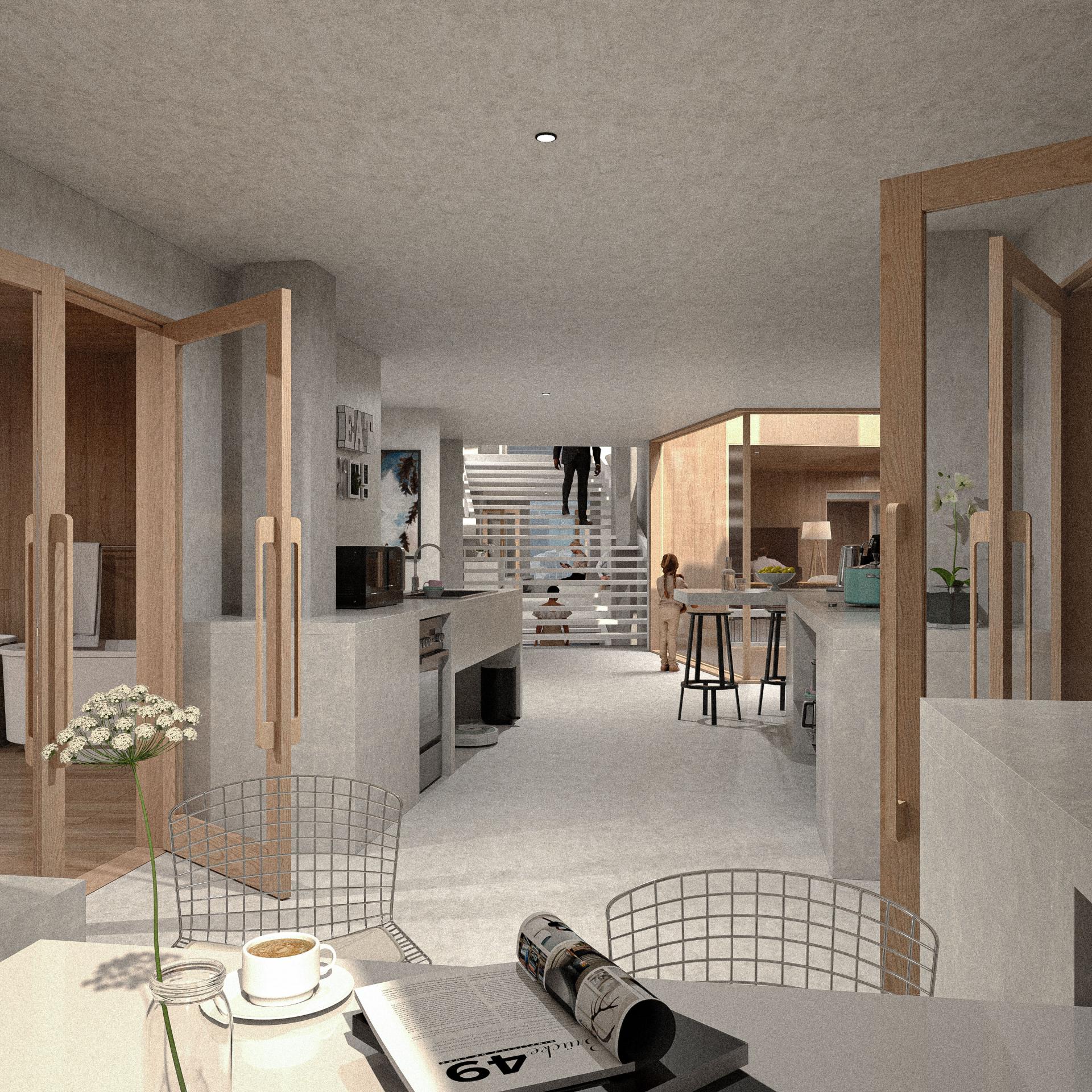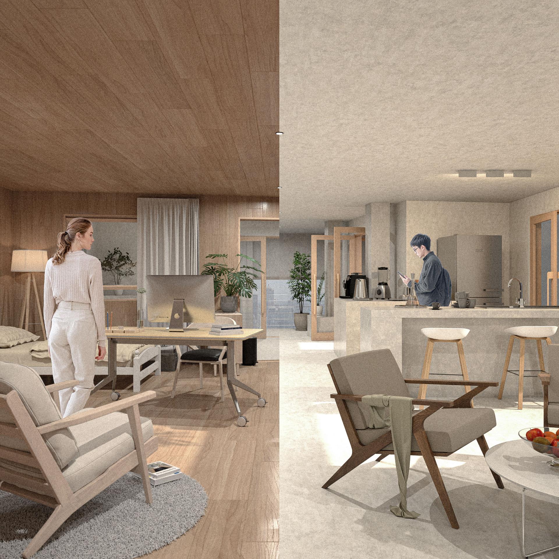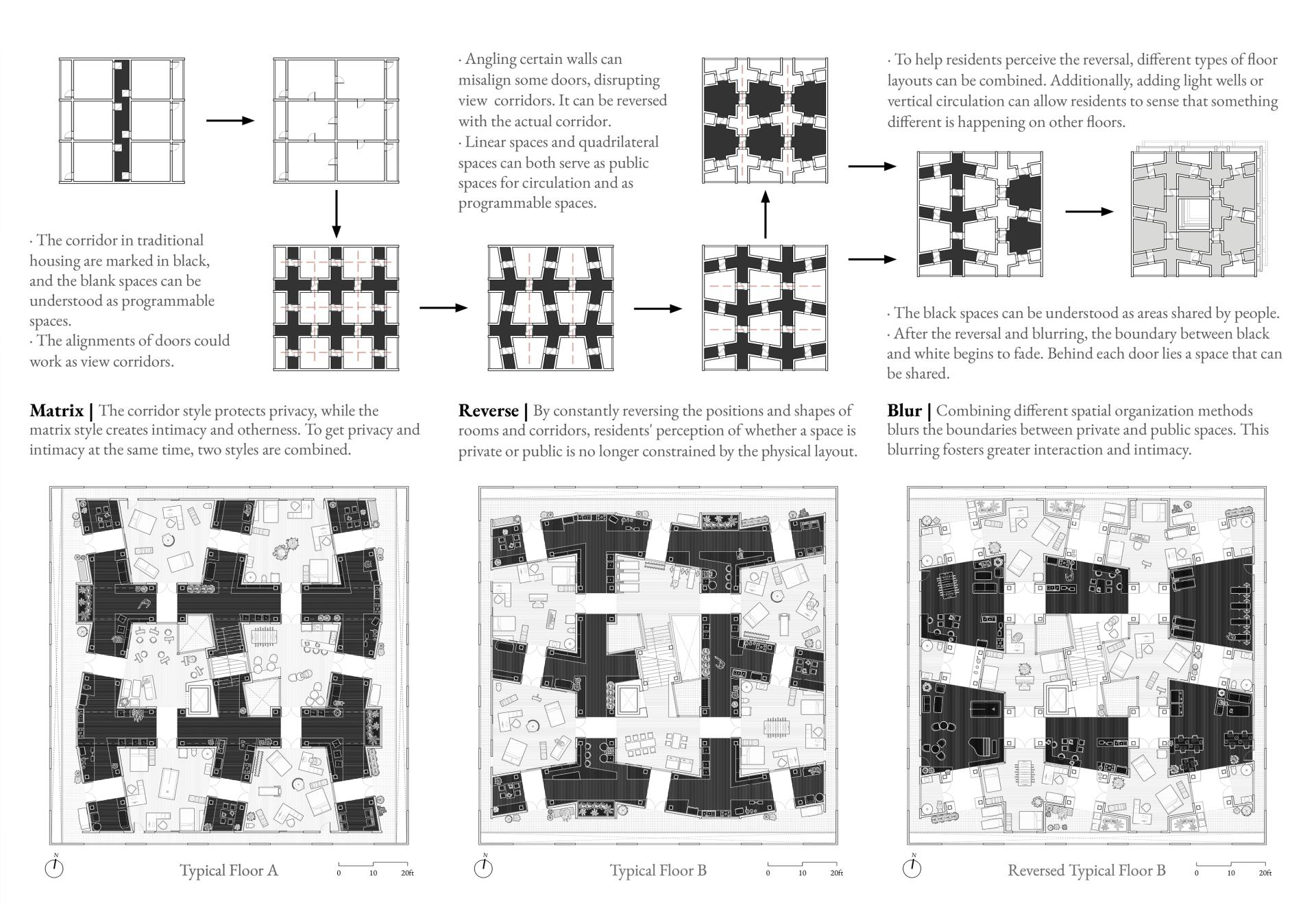 Specialized circulation preserves privacy, while the matrix style fosters intimacy and inclusivity. By merging these approaches, this project blurs the boundaries between private and public spaces. Every area can function as both a corridor and a room, while "view corridors" allow residents to observe their neighbors, transforming strangers into a community. Rather than fostering discomfort, public spaces encourage social engagement.