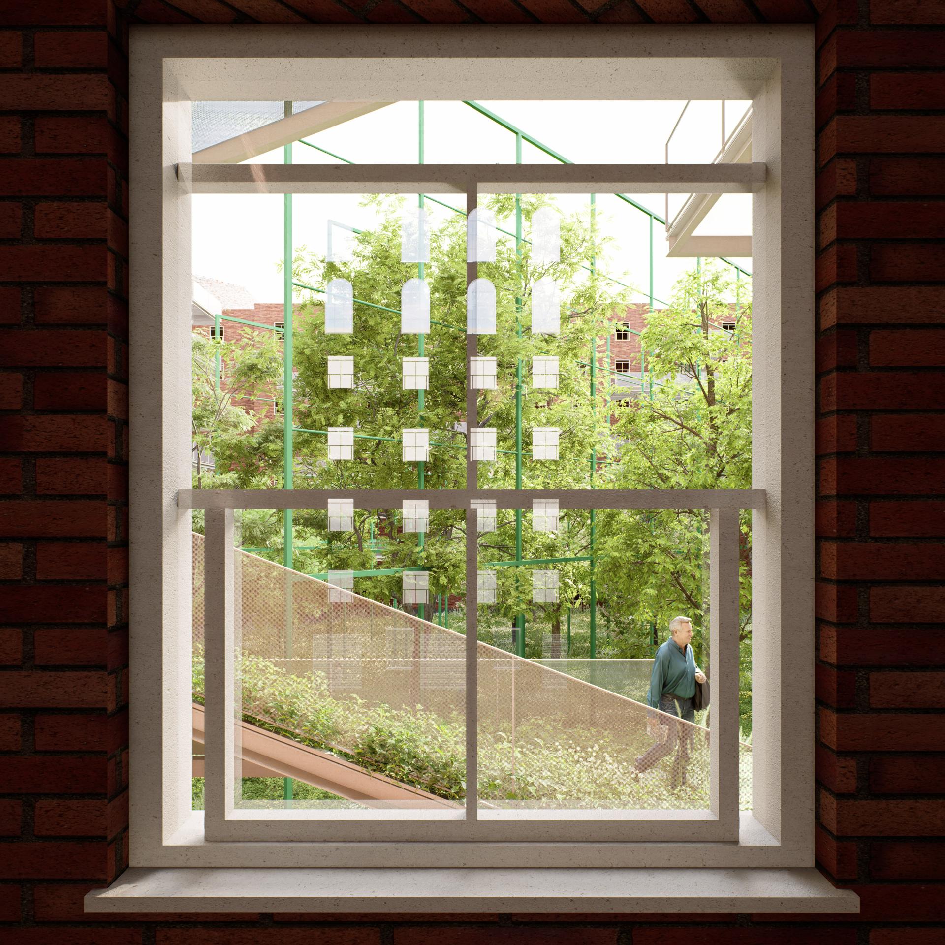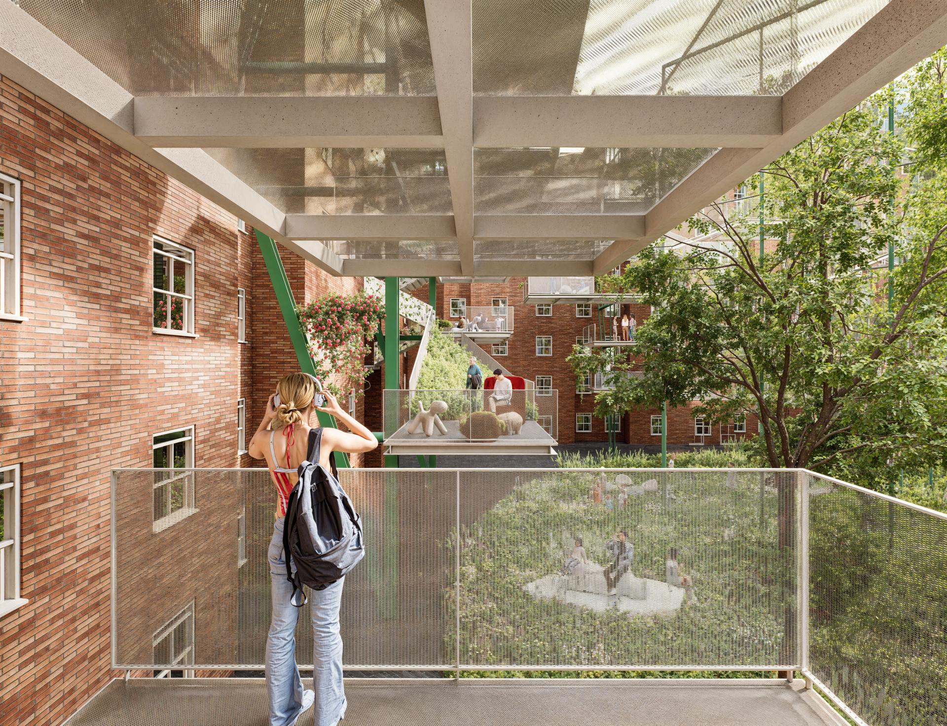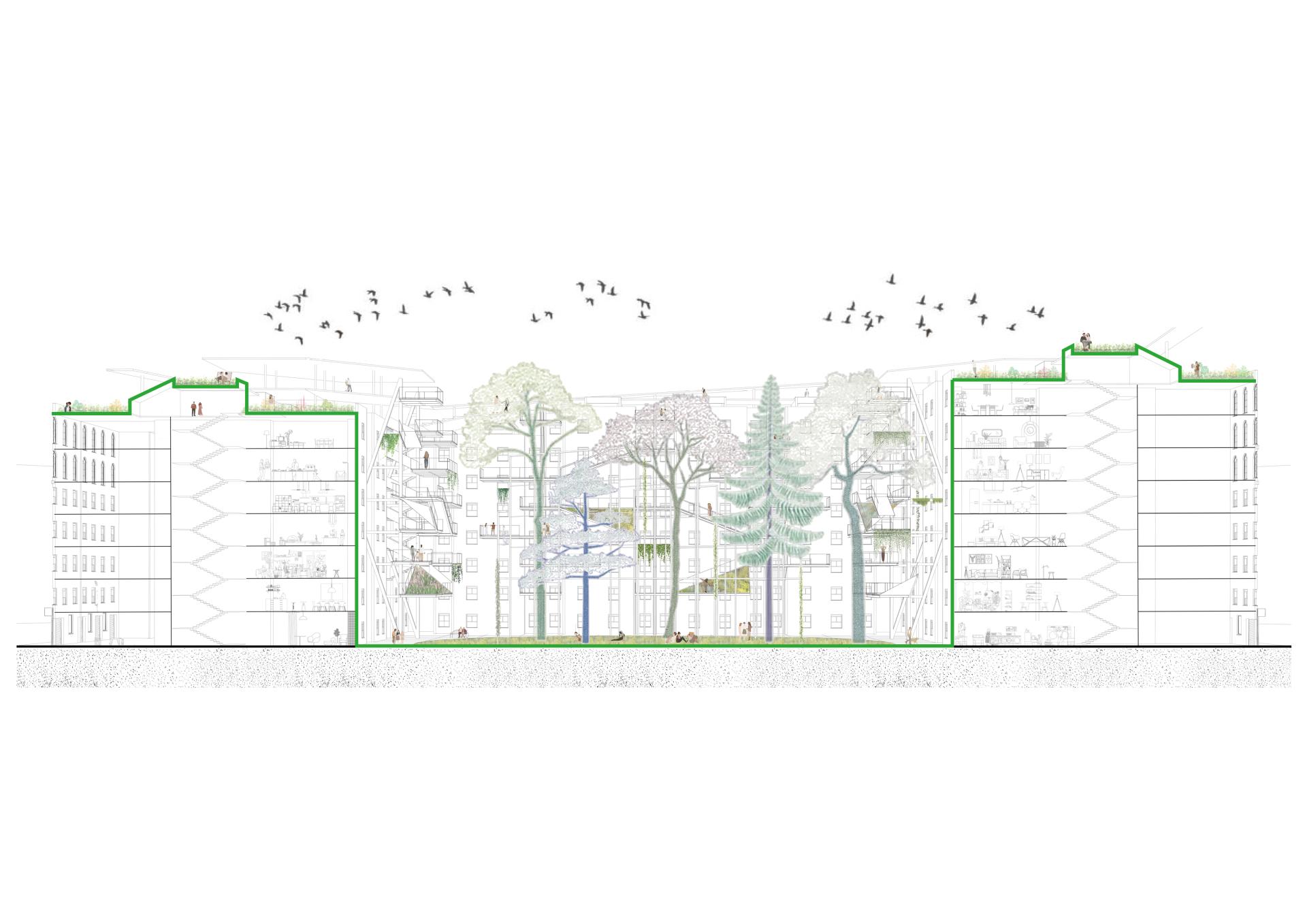 The proposal’s hidden gardens, not yet perverted by tourism, are being discovered by chance. At the heart of the Forest Tapestry, there will be a lush courtyard, restoring open space within each block. This green oasis will become a natural retreat, providing a tranquil space for relaxation and reflection, reminiscent of Eixample’s original green spaces. Walkways will connect the courtyard to the urban fabric, functioning as threads of tapestry. Children will play on suspended walkways connecting apartments, their joy echoing through the greenery. These paths will allow residents to move fluidly between living areas and communal green spaces, fostering community interaction, much like interconnected forest trails. To achieve Passive House certification, Rooftops will be transformed into vibrant gardens, enhancing aesthetic appeal and providing spaces for residents to walk, relax, and enjoy views of landmarks like the Sagrada Familia. These gardens will reduce heat island effects and promote biodiversity, complementing ground-level courtyards and creating a vertical extension of nature, akin to decorative edges of a tapestry.