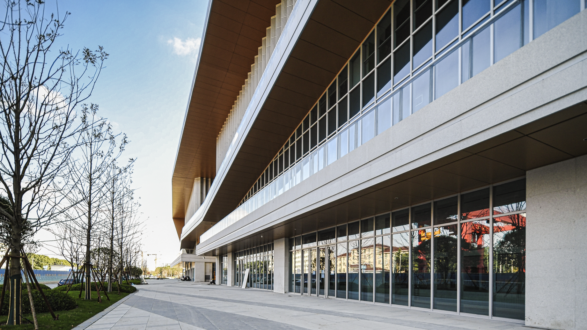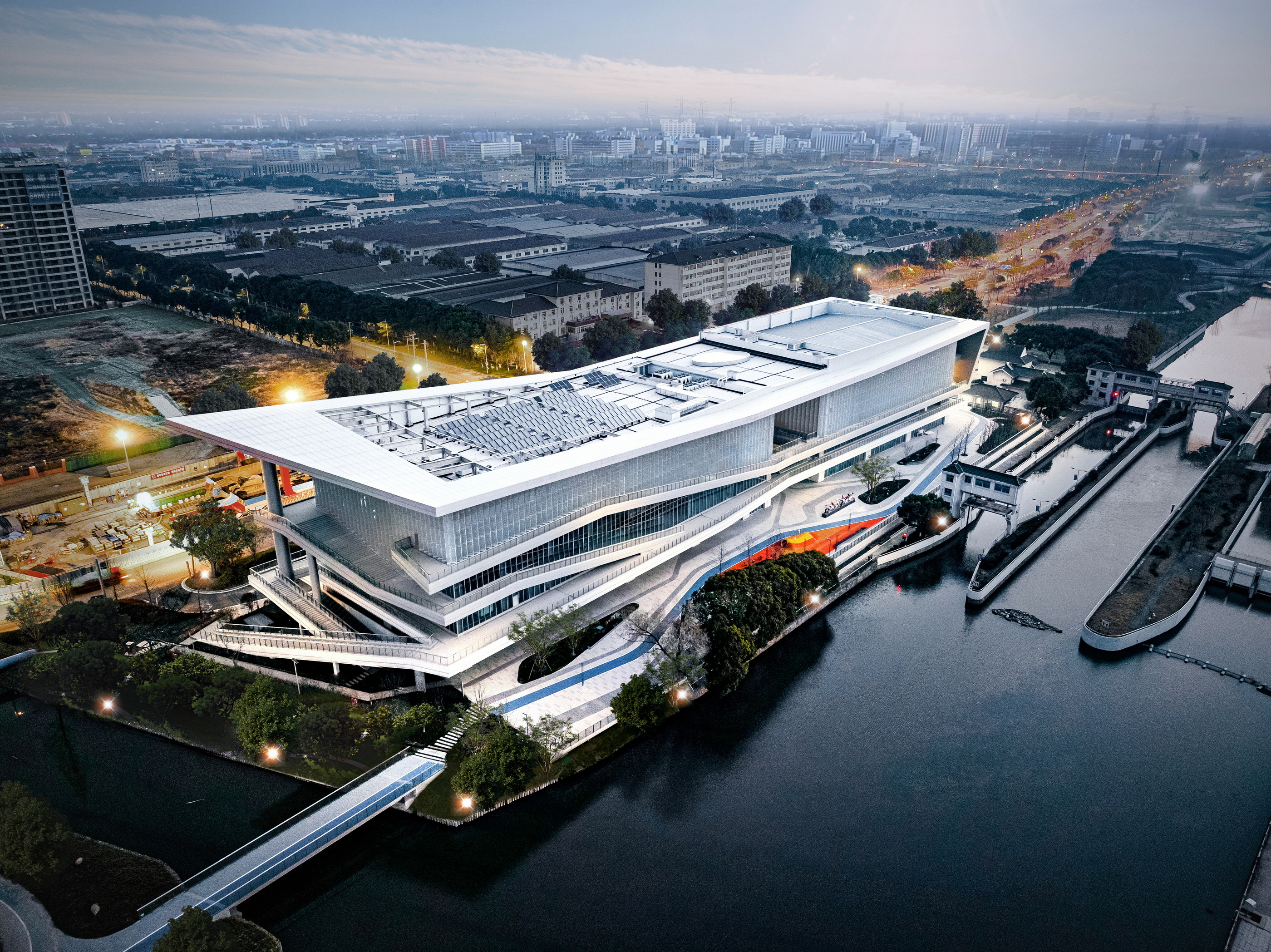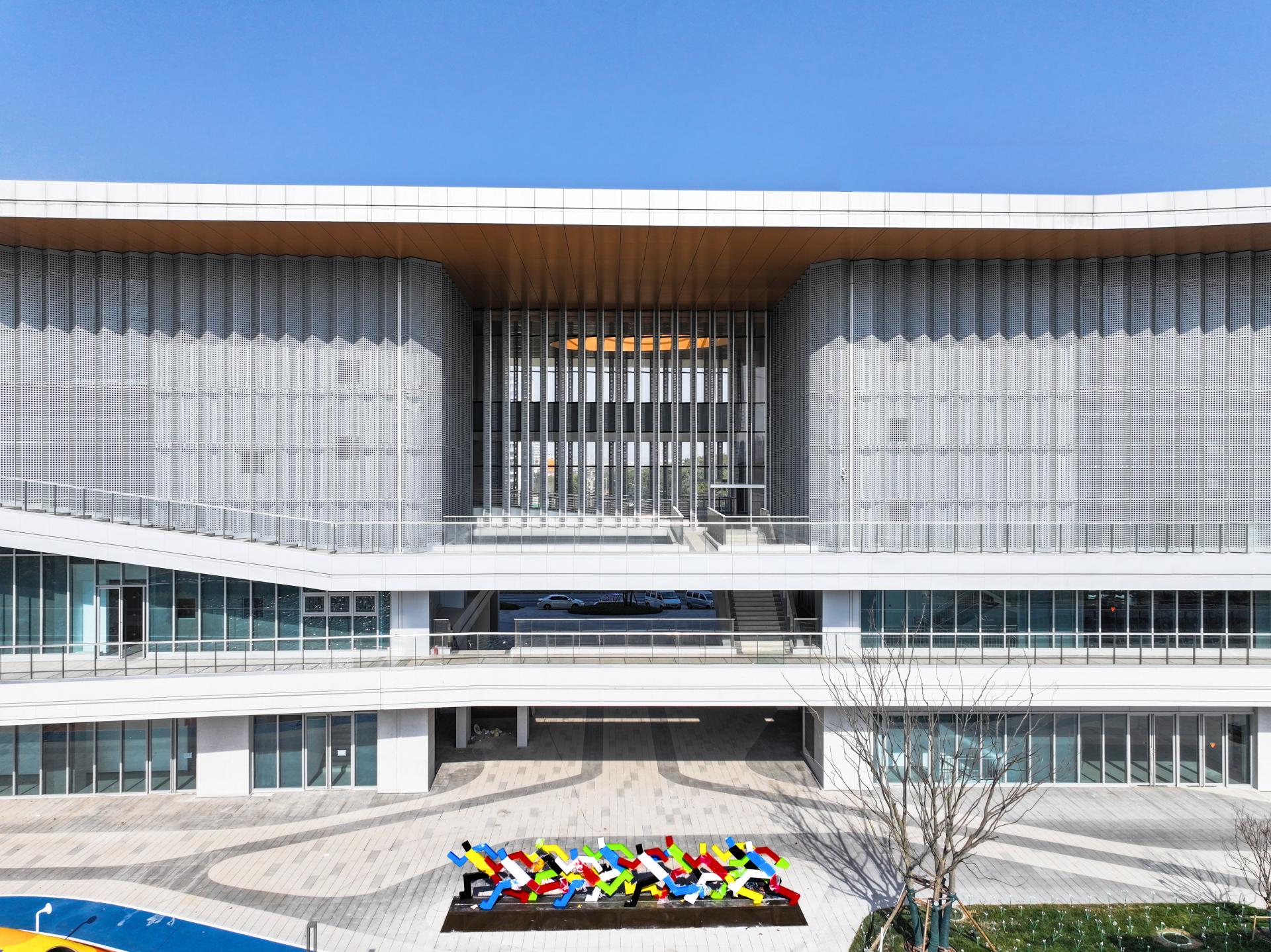 The overall architectural shape is inspired by boats sailing across the water, drawing inspiration from the flying eaves of ancient buildings. The roof rises up like a "sailing cruise ship," and the facade employs glass curtain walls, stone materials, and aluminum panels, combining with the waterscape of the Bodu River to create a visual effect of "sky and water merging into one", adding a lively and upward-reaching skyline to the urban space, enriching the urban facade hierarchy, and forming an integral appearance of the city landmark.