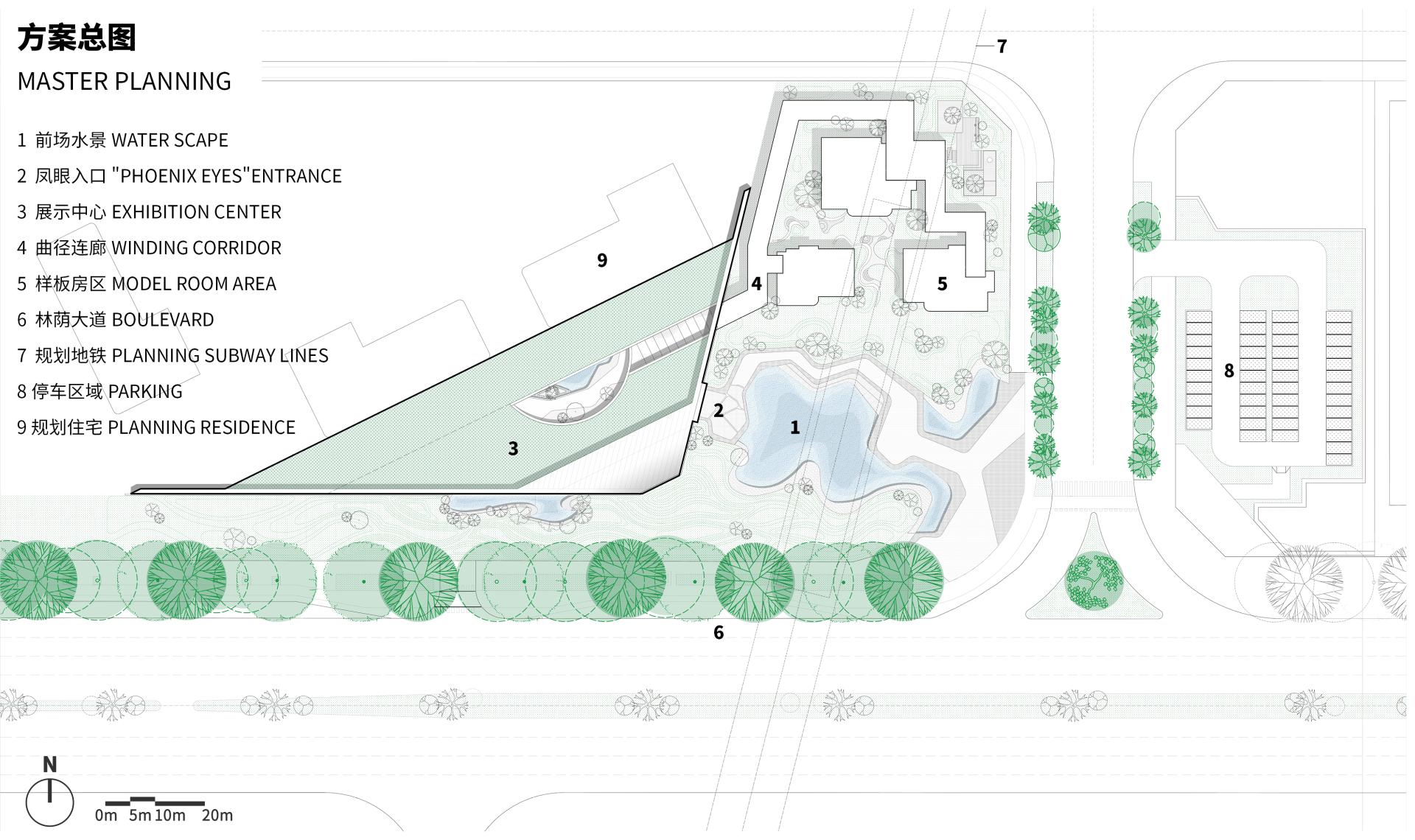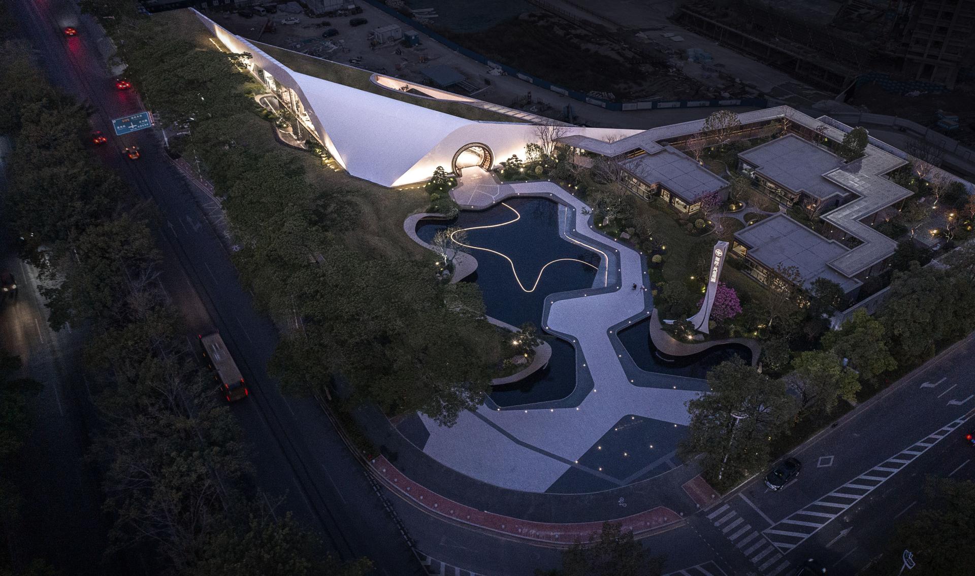 The building stands on a triangular plot, utilizing the planned green space above the subway on the east side to achieve a fusion of permanent architecture and temporary landscapes. The structure rises gently from the ground, yet humbly bows to the city, interpreting the traditional concept of harmonizing sky and earth.