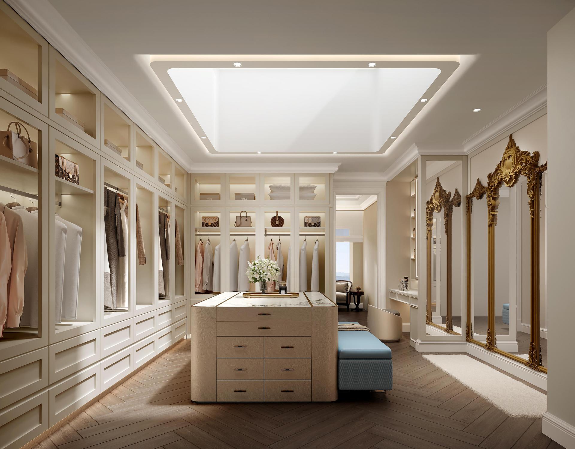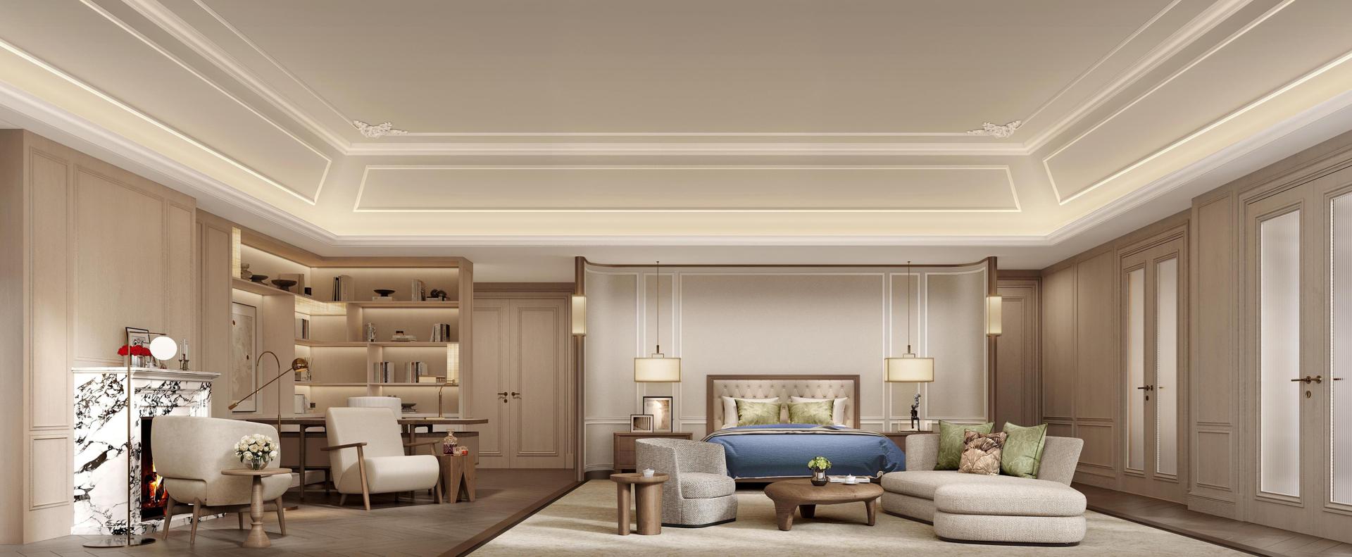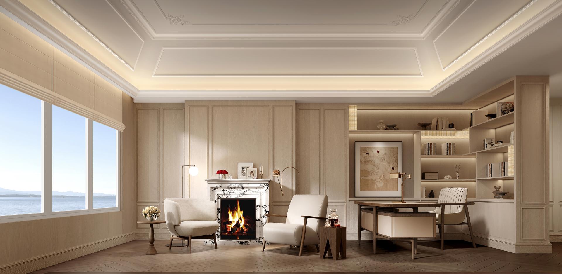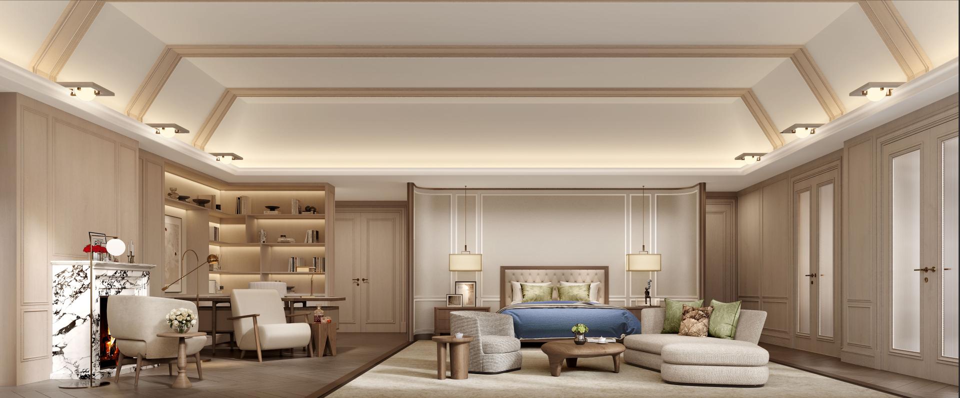 The master bedroom offers a serene and intimate retreat. A wrap-around headboard provides tranquility, while bespoke seating near the fireplace reflects the couple’s individual tastes. Thoughtful design elements evoke moments of warmth and connection, creating a truly personal sanctuary.