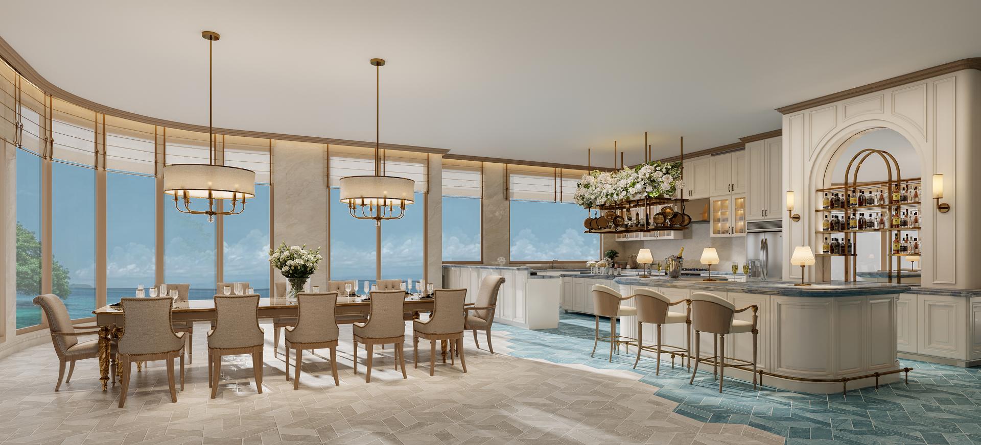 The dining room floor tile pattern is inspired by ocean waves merging with the shore.