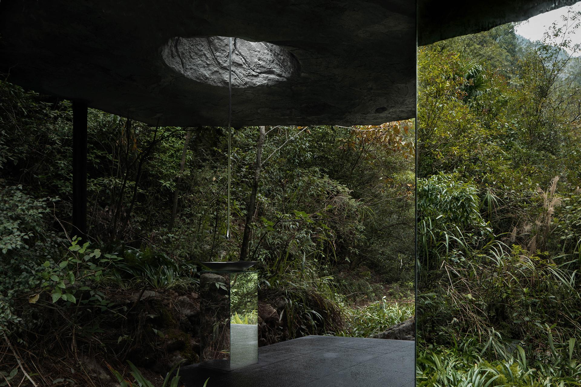 The nearby stone pavilion, “The Hut”, serves as a restroom with an ethereal design. Mirrored surfaces make it appear to vanish into the forest, while a suspended stone roof creates a surreal floating effect. The skylight channels light onto the washbasin, blending function with natural aesthetics.