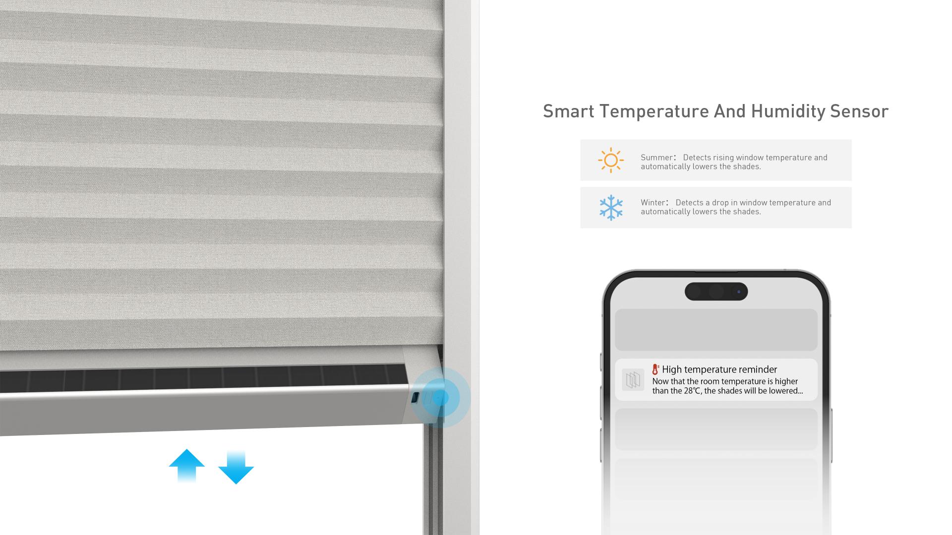 The Smart Temperature-Controlled Cellular Shades is a revolutionary window covering that perfectly integrates advanced technology with traditional cellular shades design to enhance comfort and energy efficiency in modern living spaces. The product embeds a motor, solar panels, sensors, and control buttons into the bottom bar of the cellular shades. Unlike conventional curtains, it features temperature and humidity sensors that automatically adjust the height of the shade based on indoor and outdoor conditions, optimizing indoor temperature and reducing energy consumption. The shade is designed to be multifunctional and compatible with various types of cellular shades, including day-and-night, top down bottom up, arch and angled shades, and skylight shades. The design and execution have been meticulously planned and tested to ensure seamless integration of components and intuitive user control.