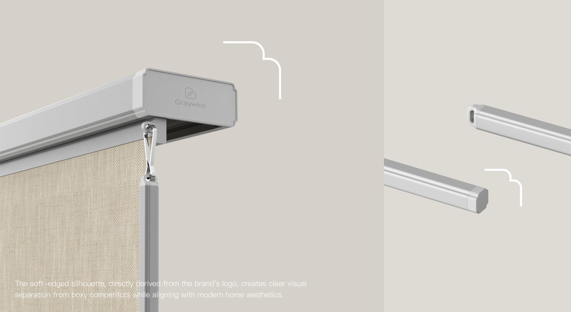 The minimalist silhouette translates Graywind’s geometric brand language into functional precision, structurally differentiating it from conventional blinds.