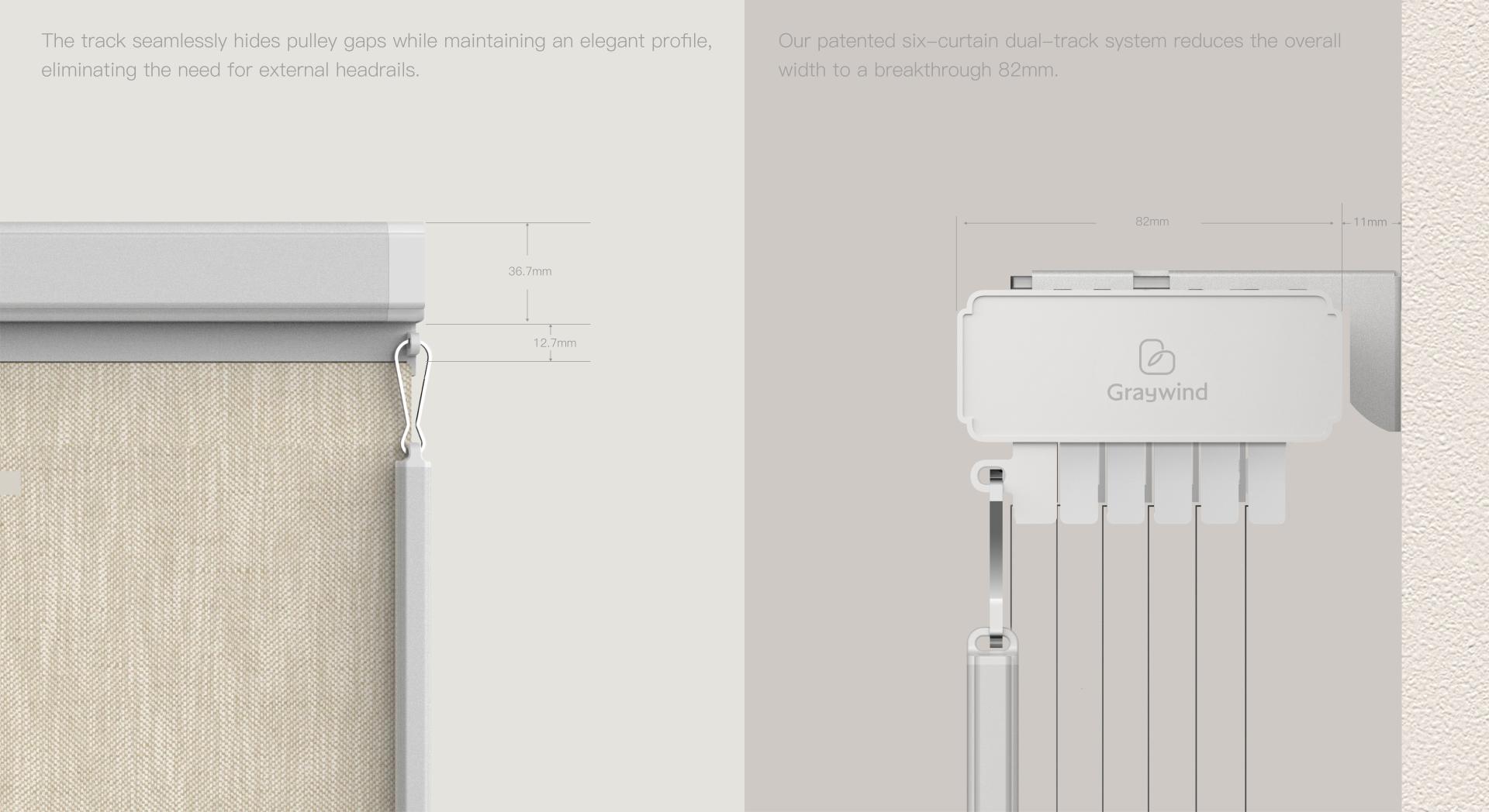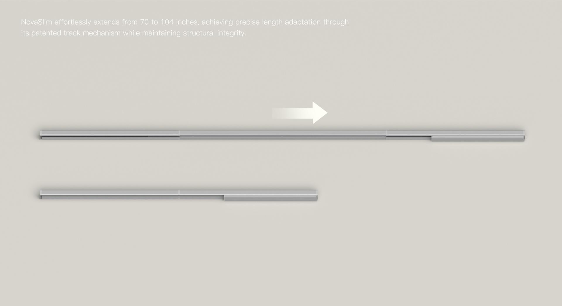 NovaSlim reimagines window solutions with its adaptive track system, engineered to span 70-104 inches via a patented retractable mechanism. At its core lies an industry-first dual-track architecture, achieving a header profile of 82mm (W) × 36mm (H) – setting a new benchmark for spatial efficiency in slim design.