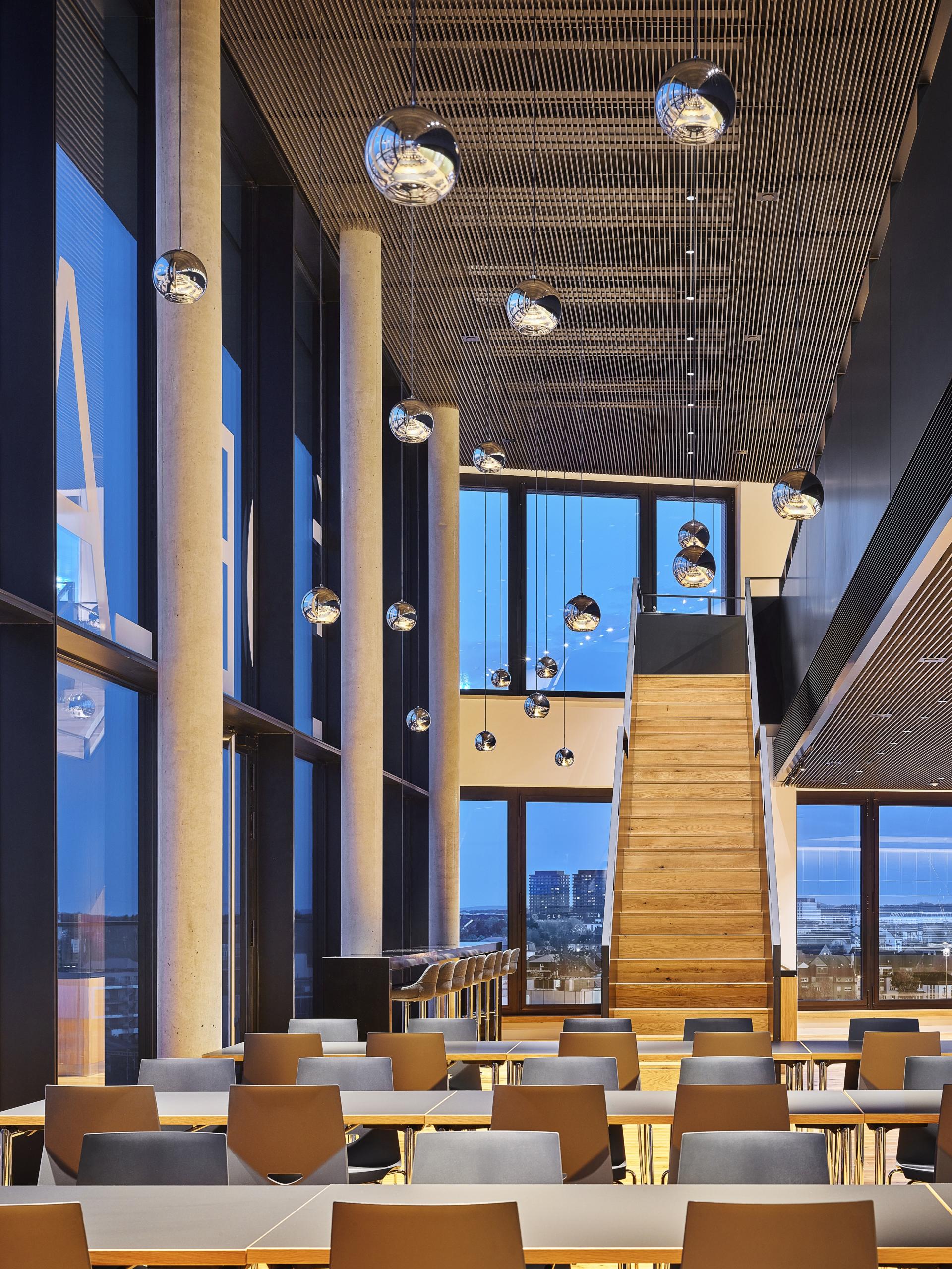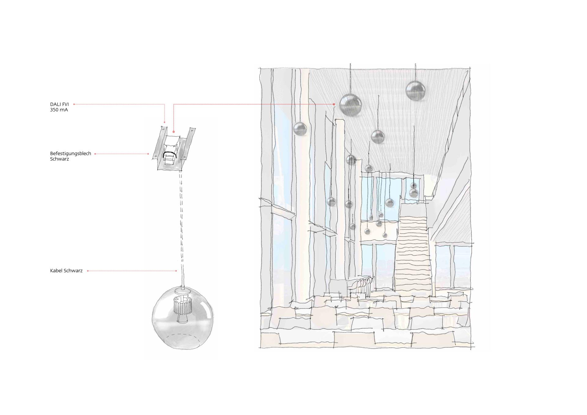 In the restaurant area, which extends over two storeys, recessed downlights and custom pendant luminaires developed according to the architect's design are used. These chrome finish pendants, reflect the surroundings and thus almost dissolve. The chosen warm-white light colour creates a cosy ambience in the evening, immersing the room in a pleasant light without outshining the architecture.