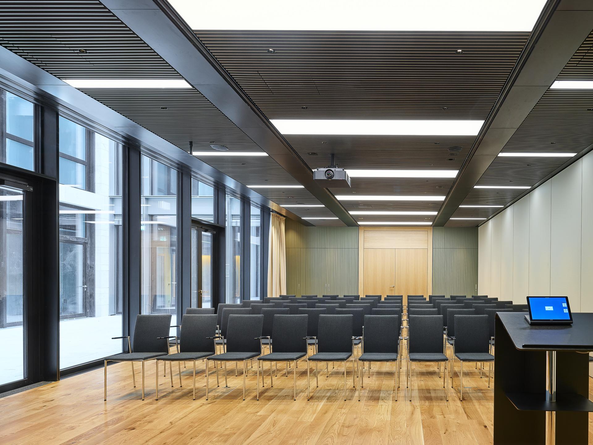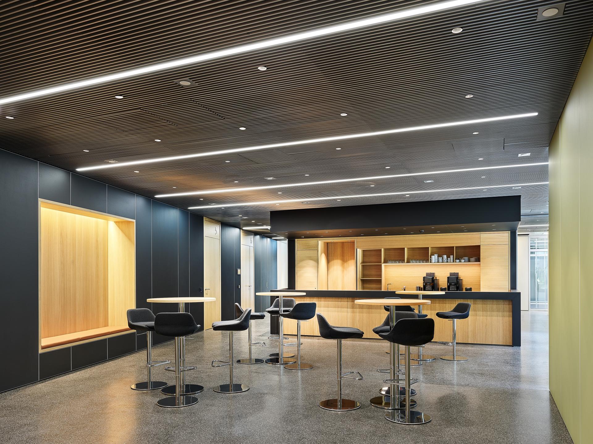 To meet the different requirements of the conference area with a large conference room and several small meeting rooms, a variable lighting concept was developed based on warm-dim and tunable-white technologies. These technologies make it possible to adjust the light according to the time of day and usage situation, providing optimum lighting for both presentations and informal meetings. Illuminated ceiling panels and downlights are complemented to the ceiling architecture to fit seamlessly into the space.