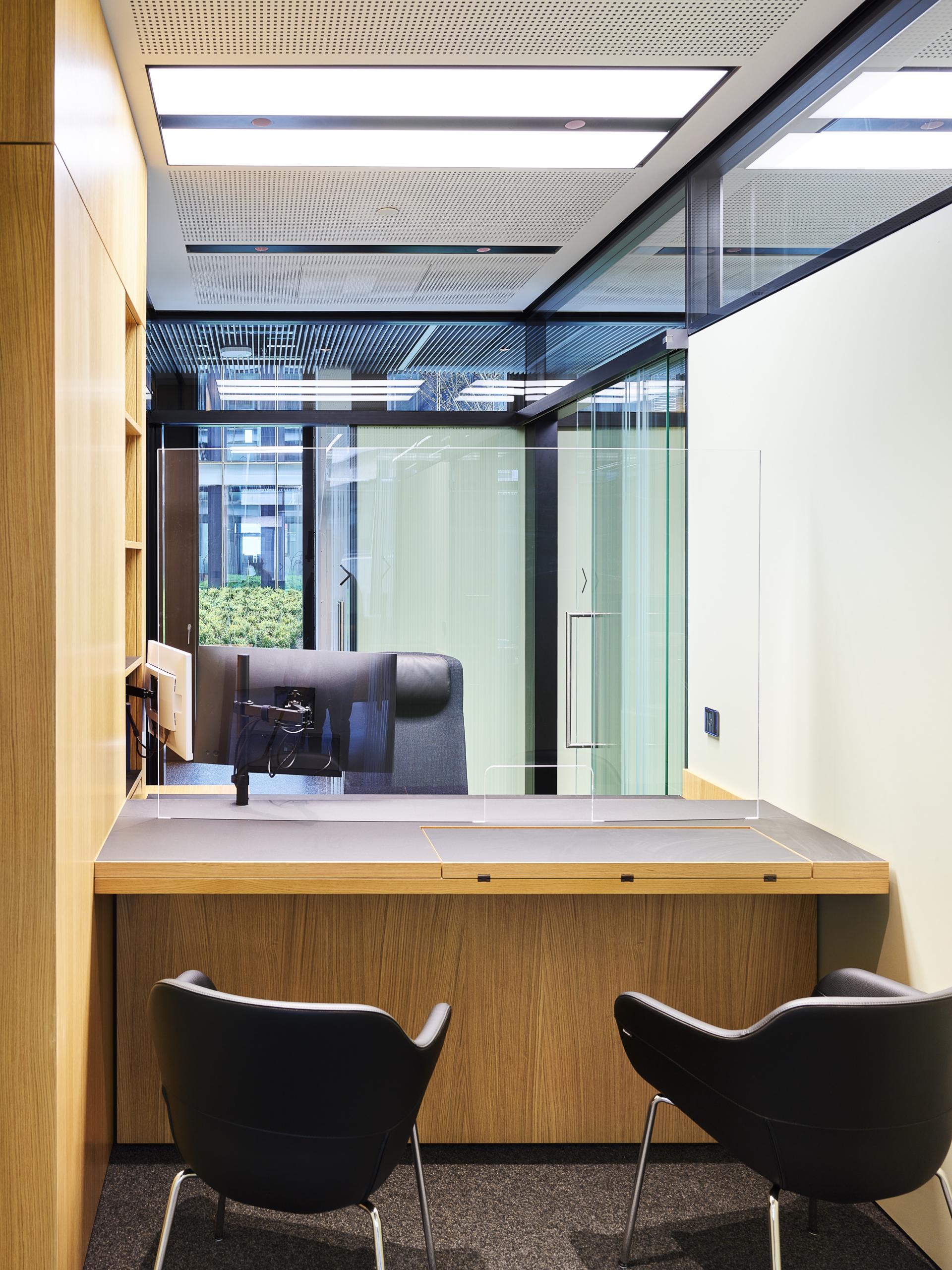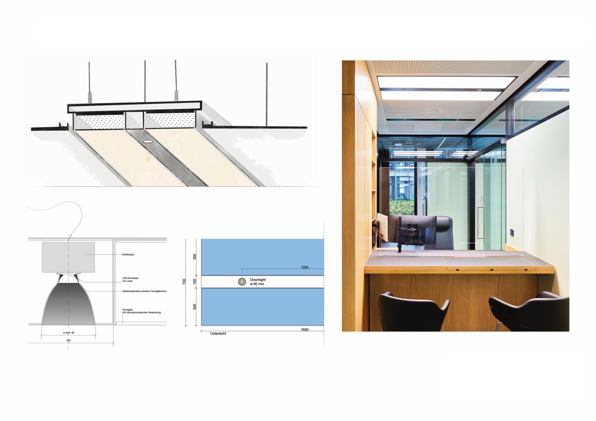 In the consulting offices, it was crucial to create a lighting solution that not only fulfils the work requirements but also supports the well-being of the employees. Melanopically effective lighting systems are used here to promote a pleasant and productive working environment through the targeted use of luminous ceilings and downlights. This lighting design not only ensures optimum illumination of the work surfaces, but also contributes to the visual and atmospheric quality of the interior rooms without daylight.
