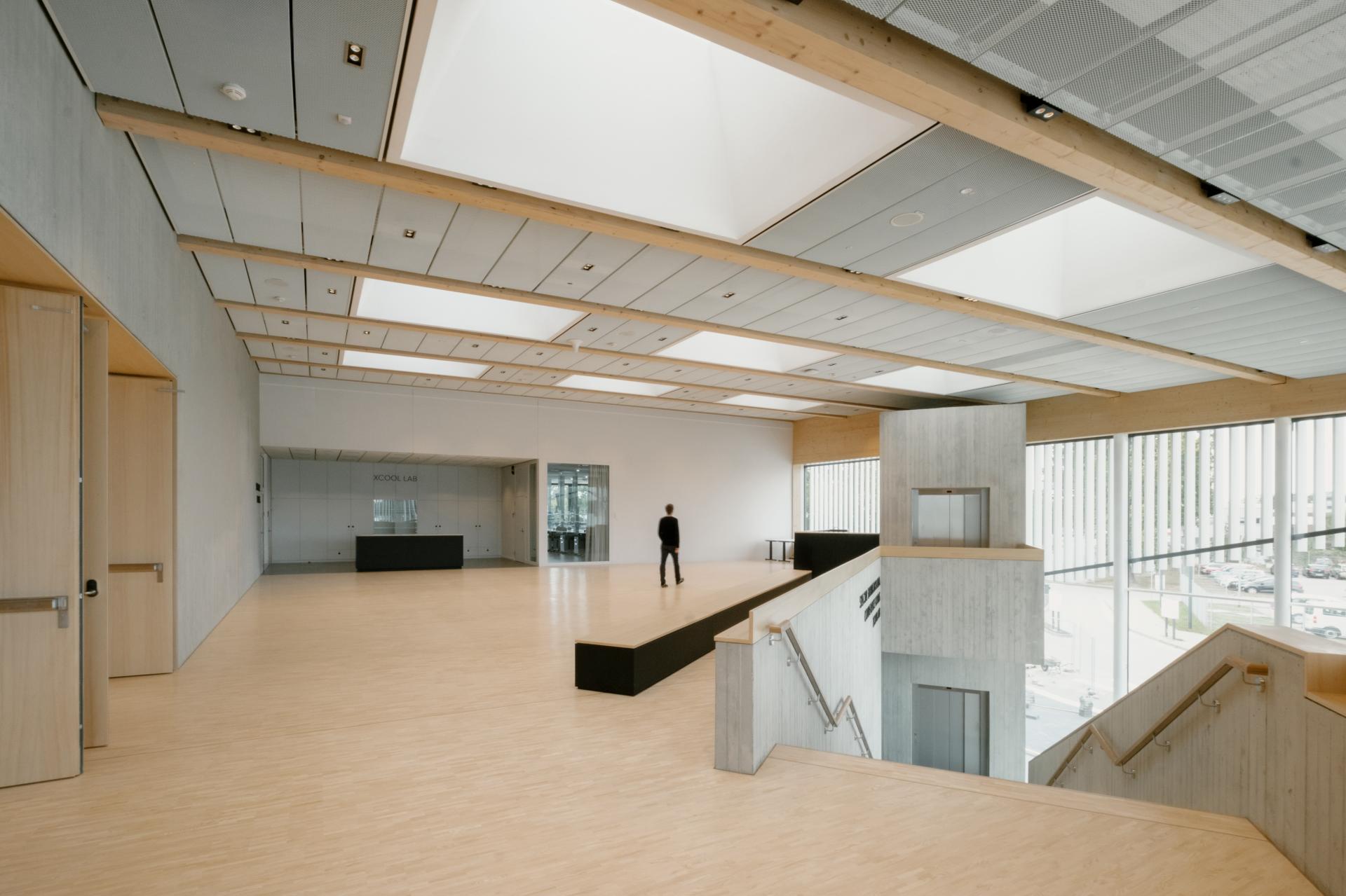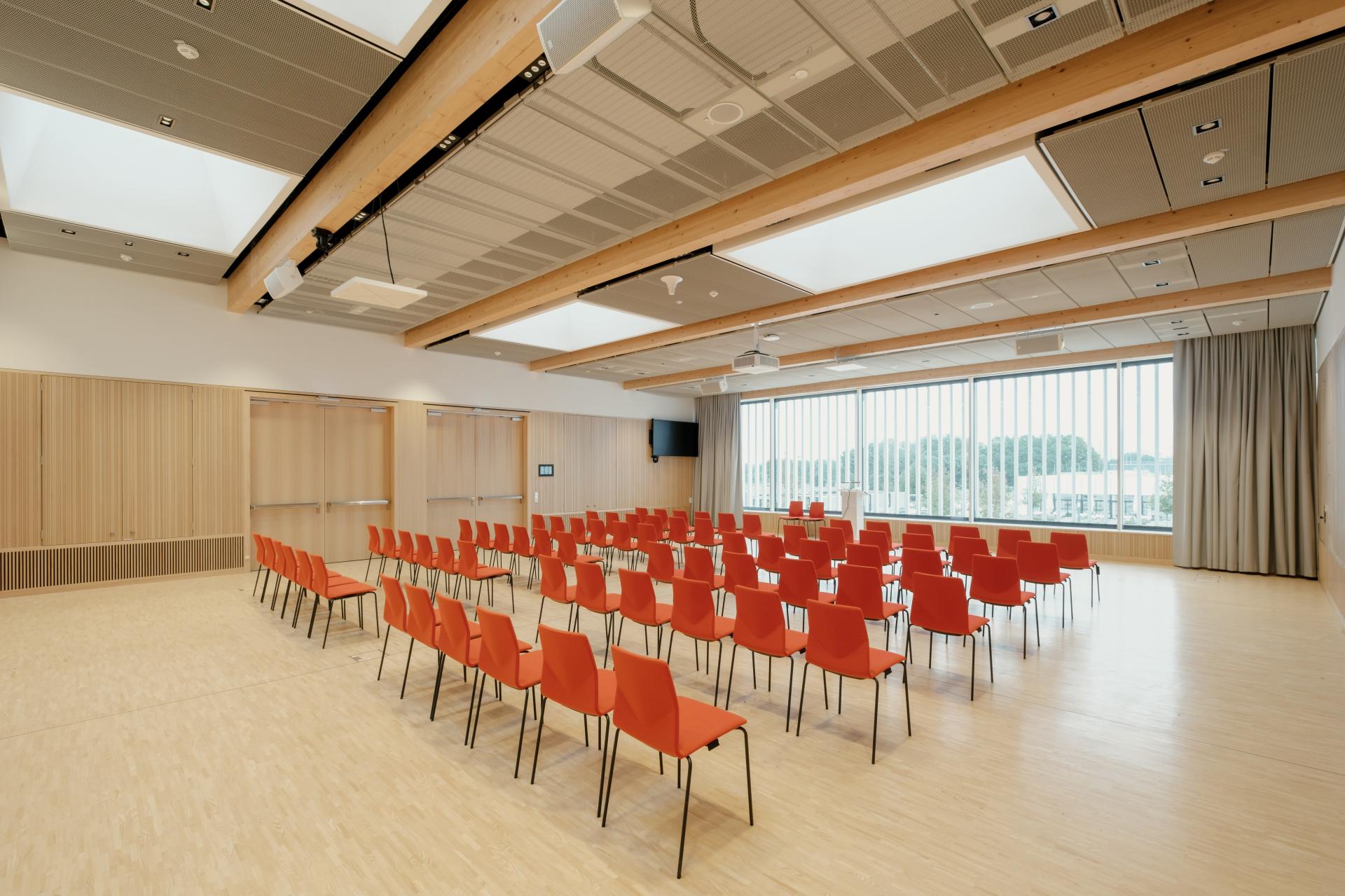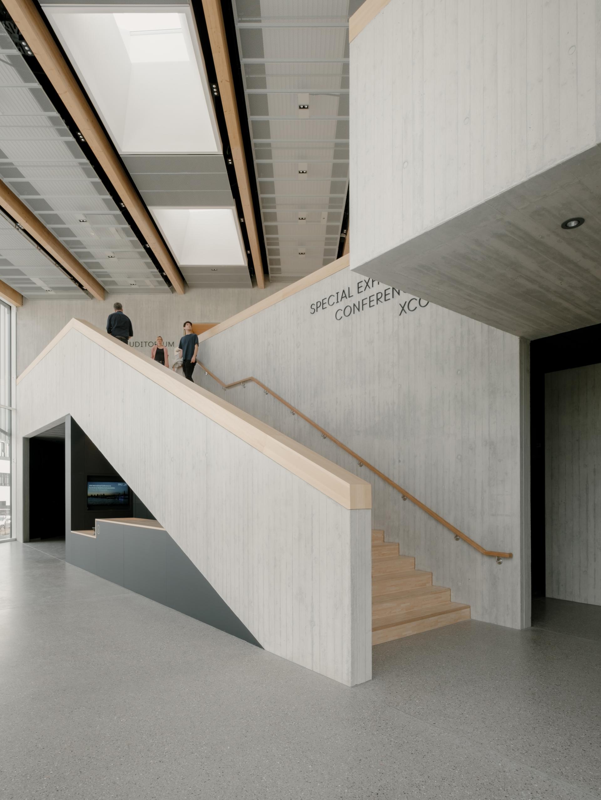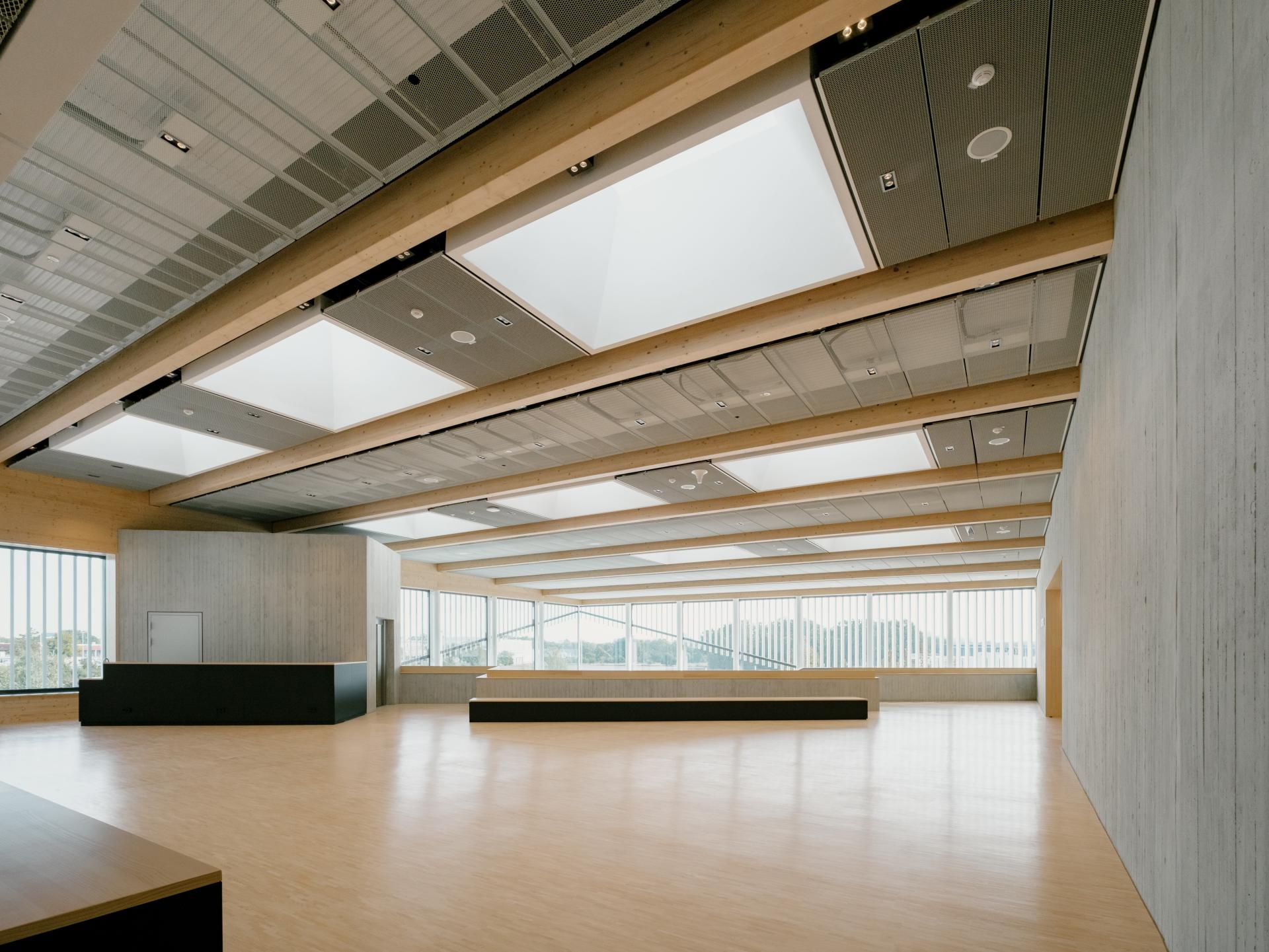 The seminar rooms fashion a lighting mixture that integrates both diffuse and directional light. This combination creates a stimulating and concentration-enhancing atmosphere. Recessed wallwashers emphasise the wooden wall panelling, which adds to the visual weight of the room. The flexible control of the luminaires helps to adapt to different event formats - seminars, receptions or presentations. The flexibility also makes it possible to keep the rooms optimally lit for evening events or all-day seminars.