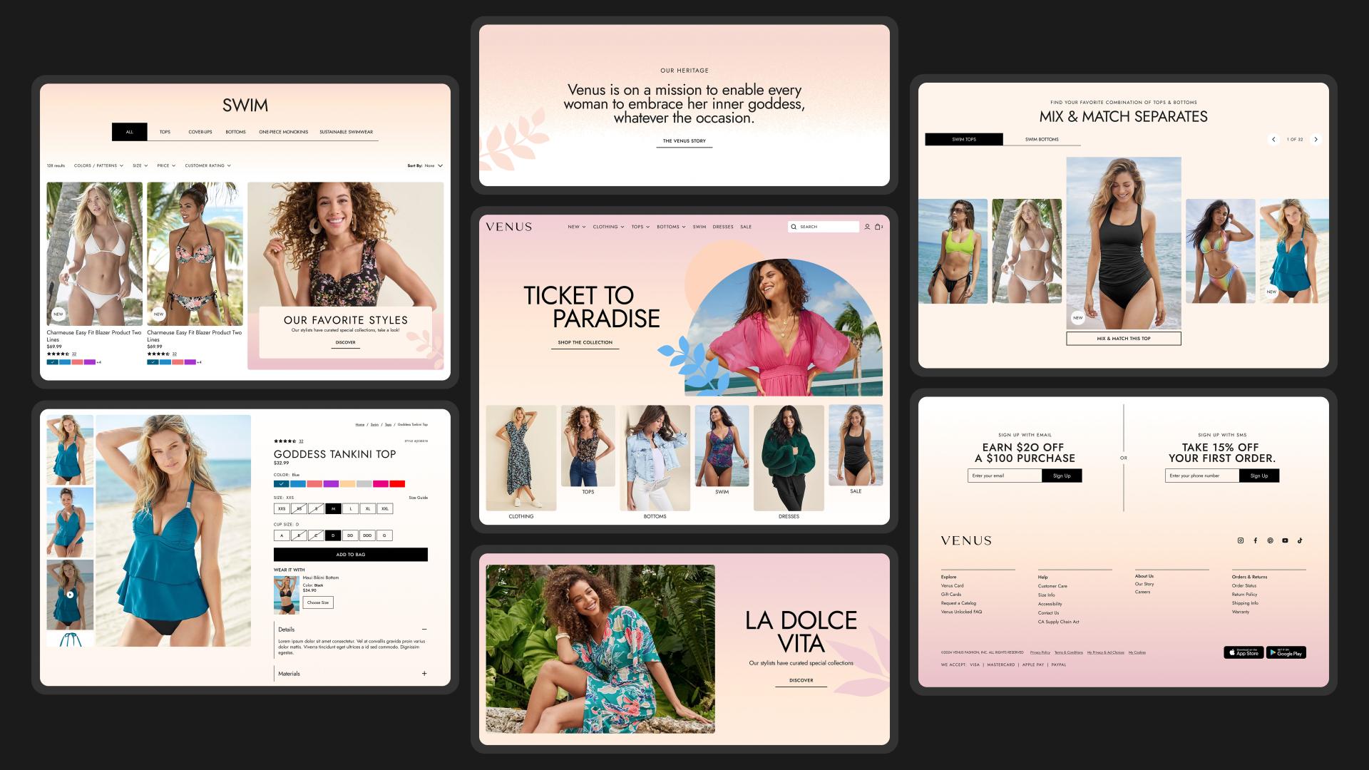At the heart of this redesign was a desire to bring back what made Venus truly special. As the originator of mix-and-match swimwear separates, Venus revolutionized the industry by empowering women to curate their perfect fit and style. Yet, over time, this defining aspect of the brand had faded within the digital experience. Our mission was to reignite that innovation, seamlessly integrating customization features that celebrate individuality while enhancing usability across every touchpoint.